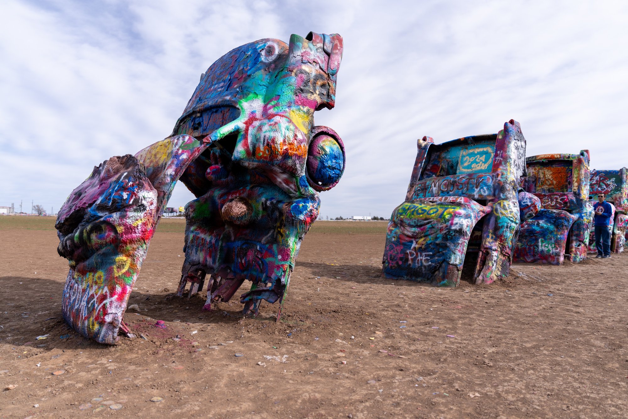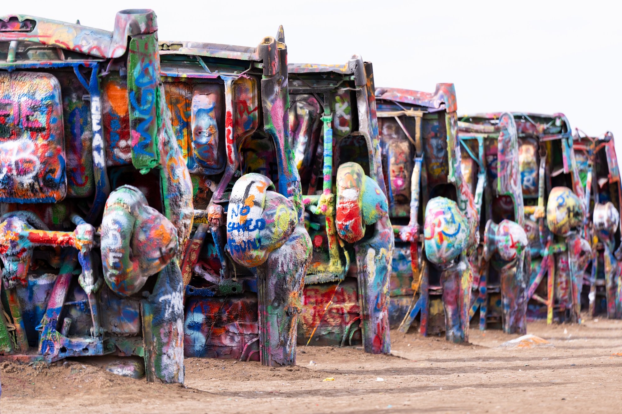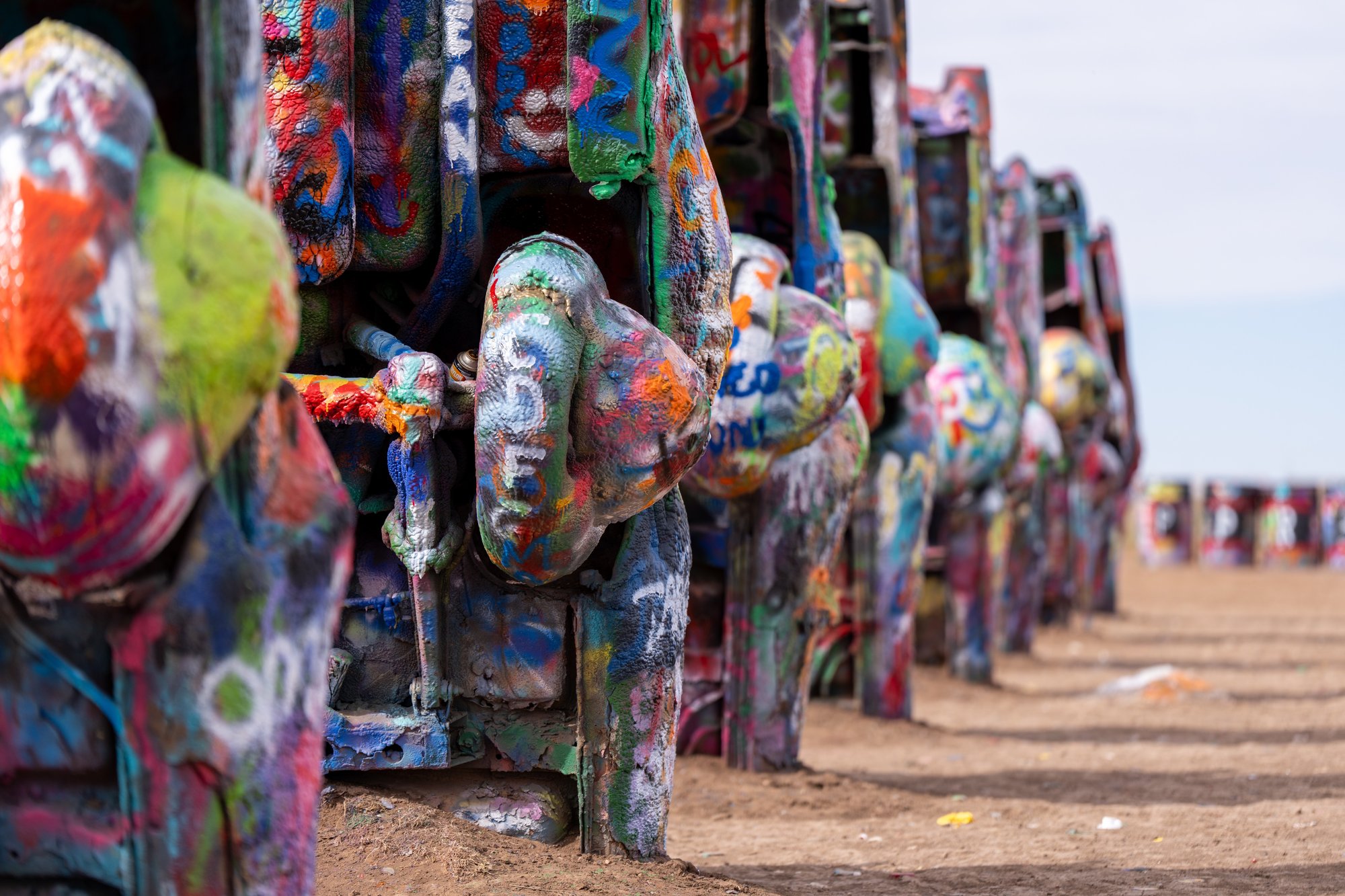 Eén van de bekendste stops aan Route 66 is Cadillac Ranch. Hier staan 10 Cadillacs rechtop, met hun neus in de grond begraven. De Cadillacs zijn met graffiti bespoten en fungeren als continu-veranderend openbaar kunstwerk. Je mag namelijk zelf ook verf spuiten op de Cadillacs en daar maken mensen gretig gebruik van. Inmiddels zijn de lagen verf op de auto’s (tientallen?) centimeters dik.