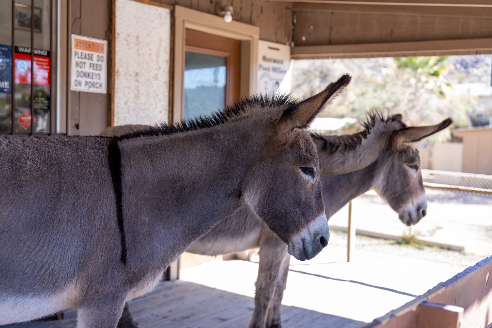 Als je naar Oatman gaat, dan hoor je ezels al van ver balken en eenmaal in de straten kun je er niet omheen. Ze staan op de veranda bij winkels of liggen te chillen bij het postkantoor. Echt een grappig gezicht! Soms zorgt al het toerisme rondom dieren ervoor dat ze brutaal en vervelend worden, maar dat hebben wij in Oatman helemaal niet gezien. De ezels zijn juist heel rustig en zoeken mensen niet echt op, zelfs niet als bezoekers voer voor de ezels hebben gekocht in één van de winkels.