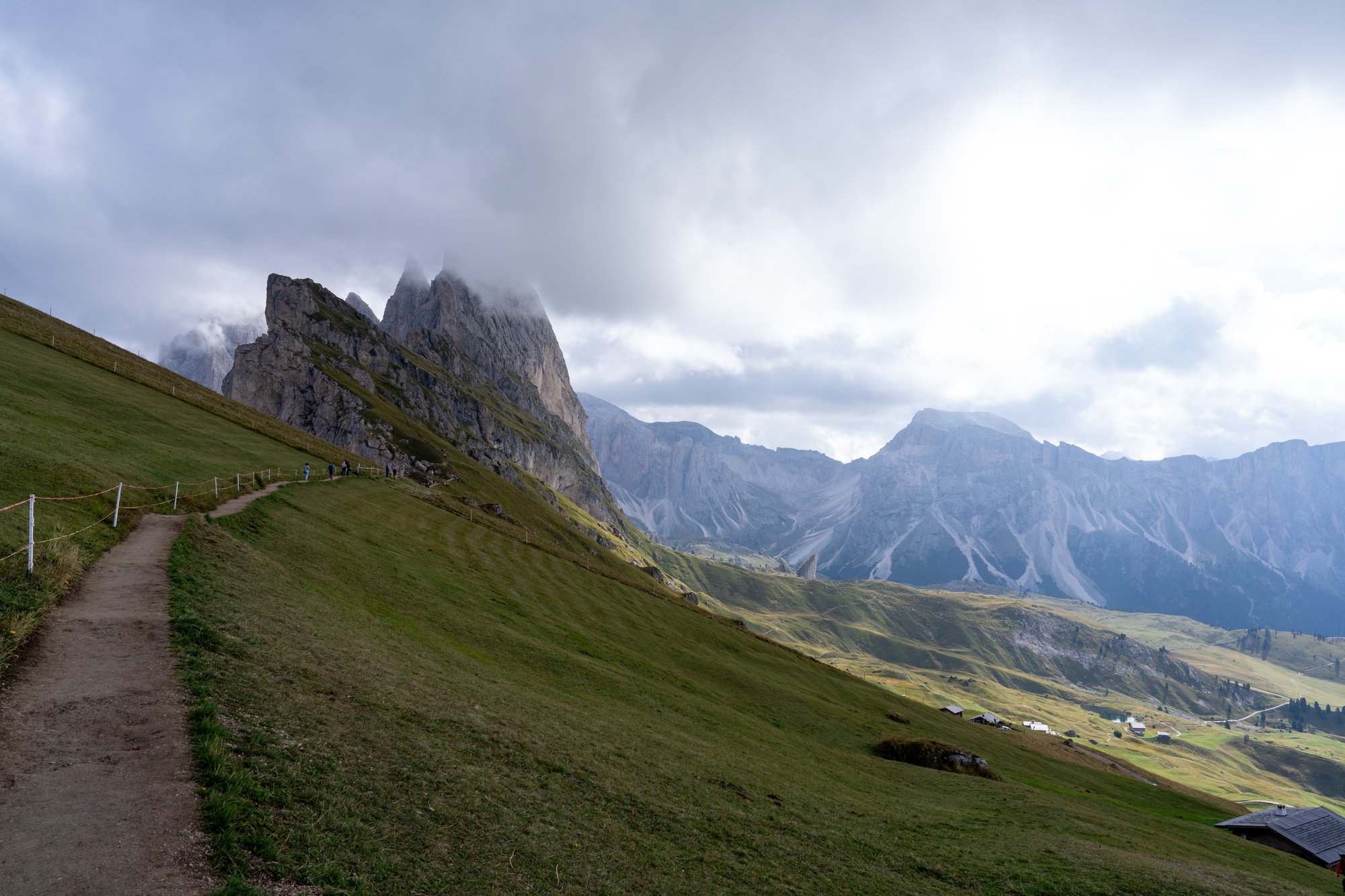 Terwijl we bij Rifugio Firenze wat drinken, wordt de lucht steeds grijzer en koelt het verder af. Ik denk dat we de dubbele cijfers qua temperatuur net halen, het is echt fris! Gelukkig mogen we nog klimmen, dan krijgen we het vanzelf wel warm. ;-) We vertrekken rond half 2 richting het Seceda Mountain Station en volgen trail 1. Het pad gaat continu omhoog. Het eerste stuk is het nog niet zo steil en prima vol te houden. Op dit pad is het trouwens heerlijk rustig. Blijkbaar nemen veel mensen een andere route dan wij.