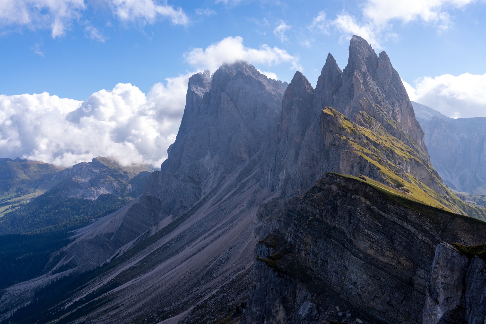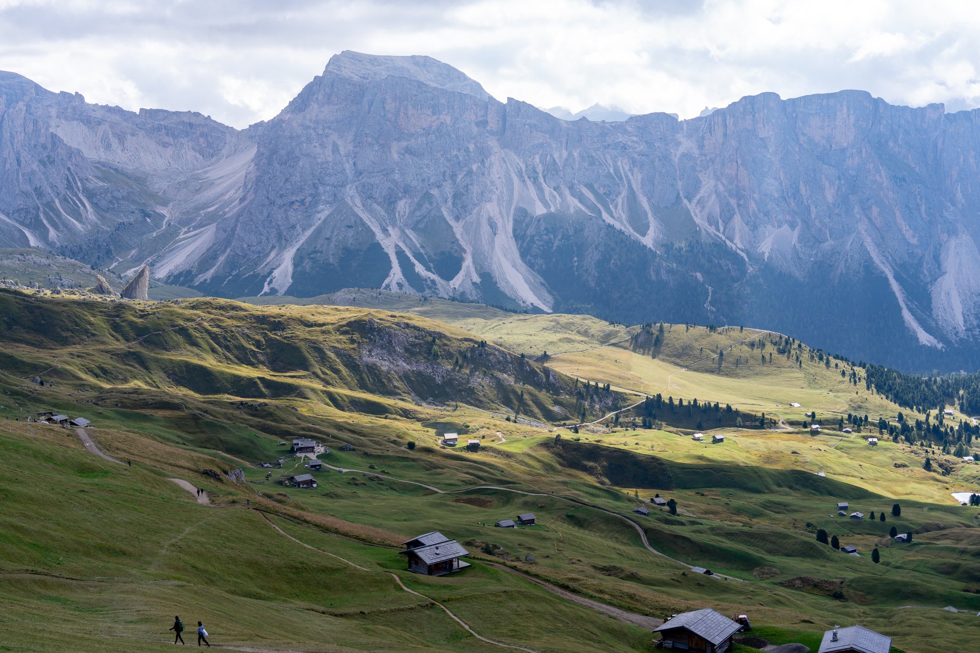 De Geisler / Odle bergen splitsen het landschap in tweeën als een soort kartelschaar. Op de schuine stukken aan het begin zie je lage begroeiing, waardoor deze vlakken groen kleuren. Verder is het één groot, grijs massief met pieken zo scherp als speren. Aan de linkerkant zien we de Geisleralm en Adolf Munkel Trail en aan de rechterkant kijken we kilometers ver over Val Gardena en naar het machtige Sassolungo bergmassief. Er is maar één woord dat recht doet aan wat we hier zien: wauw!