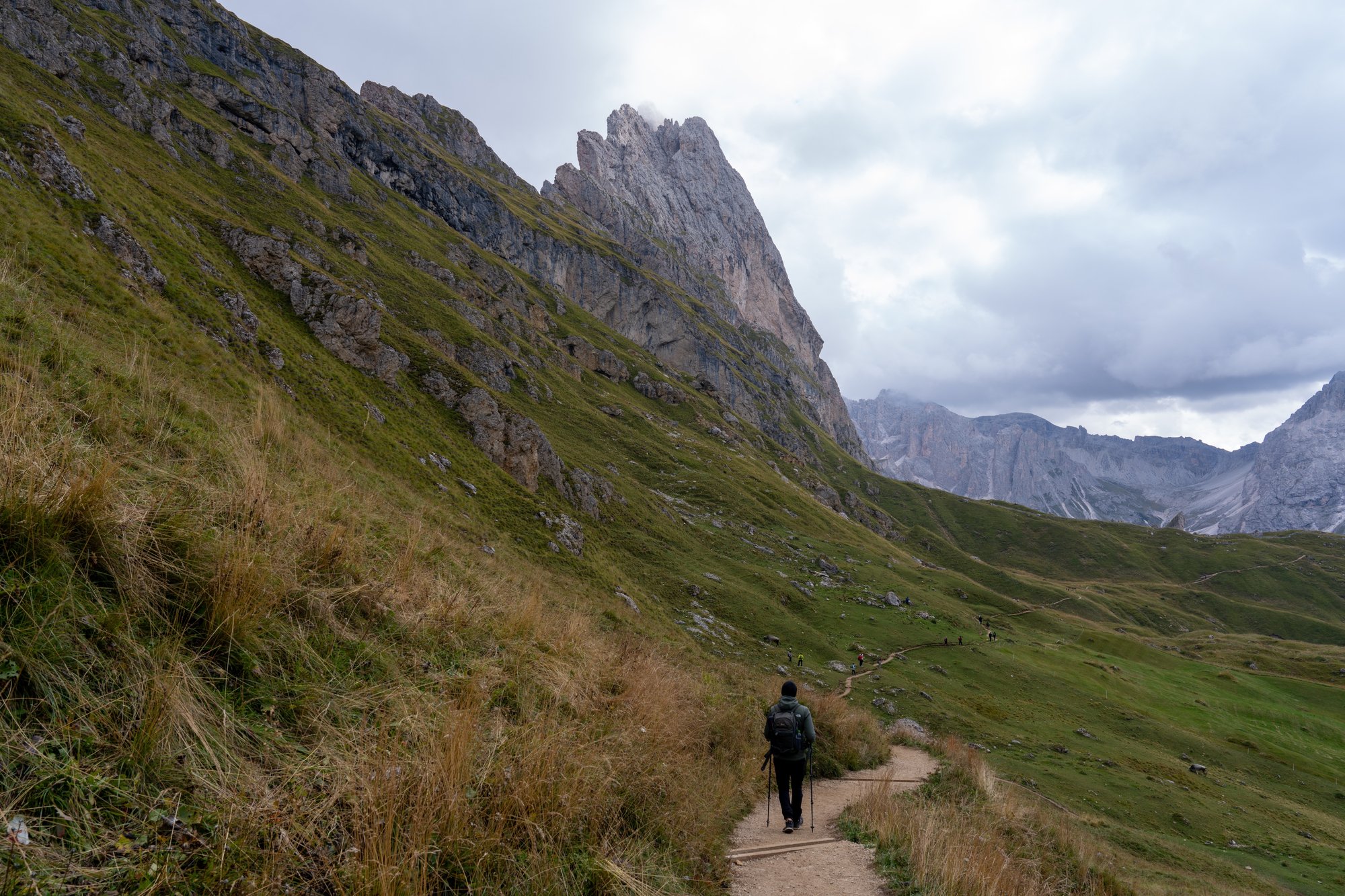 Er wandelen veel mensen op deze trails en dat is voor ons even wennen. Bij het hiken zien we het liefst zo min mogelijk mensen en gaan we graag op in het landschap om ons heen. Ik moet zeggen dat dat bij de Seceda hike lastiger is, omdat je eigenlijk wel continu mensen om je heen hebt. Zelfs eind september. Aan de andere kant is het totaal geen reden om deze hike over te slaan, want de pluspunten van deze hike overschaduwen de drukte zonder meer. Ik bedenk me wel dat je hier waarschijnlijk niet in het echte piekseizoen (augustus) wil zijn, want dan kun je over de koppen lopen denk ik.