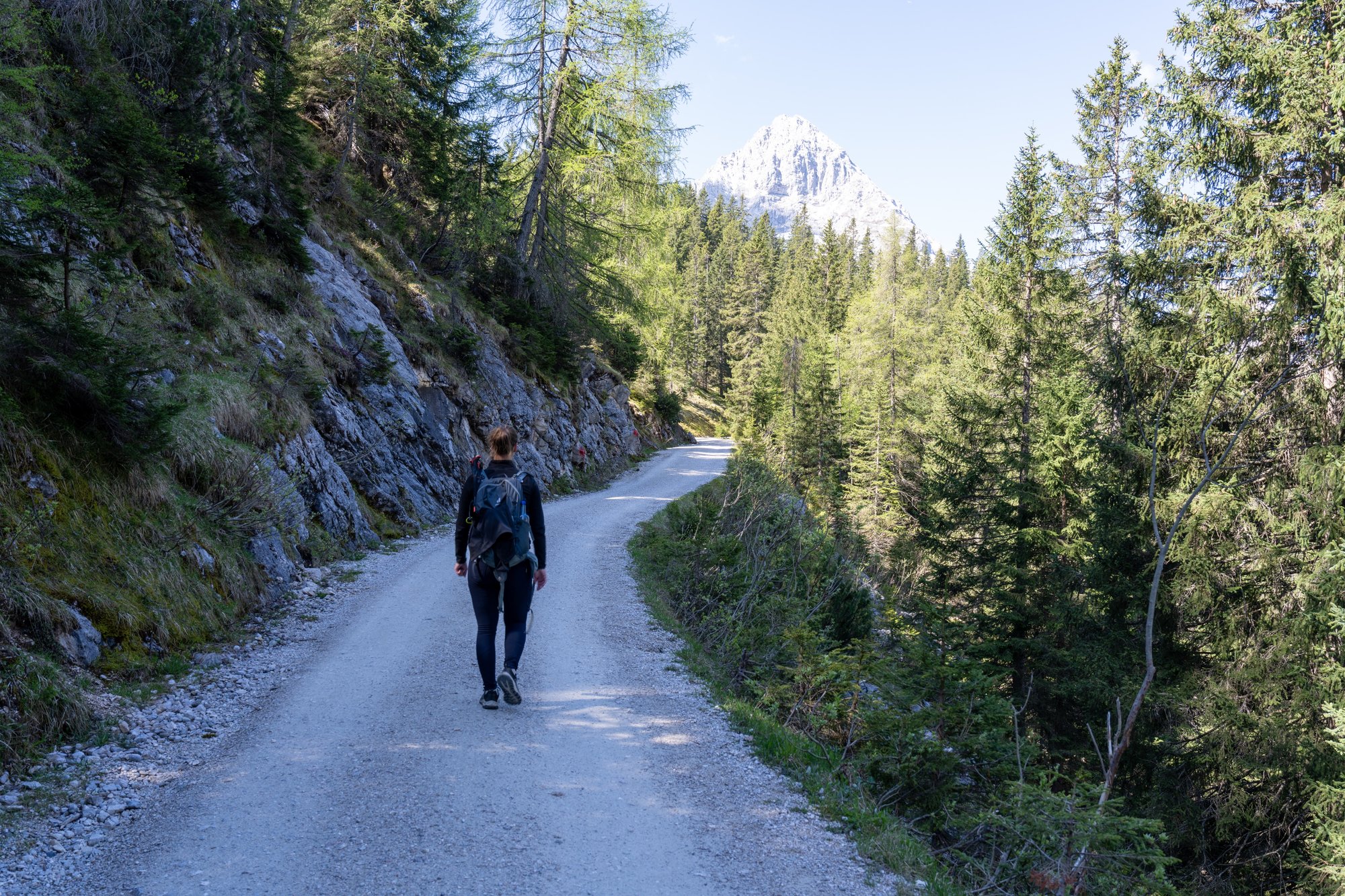 We genieten van de ontspannen opwarming over een breed gravelpad. De vogels fluiten, het is rustig, we ademen de frisse berglucht in. Heerlijk! We klimmen en dalen wat, maar tot nu toe geen grote inspanning. Dat verandert als we bij het bordje ‘Brendlkar’ en ‘Tajatörl’ linksaf slaan.