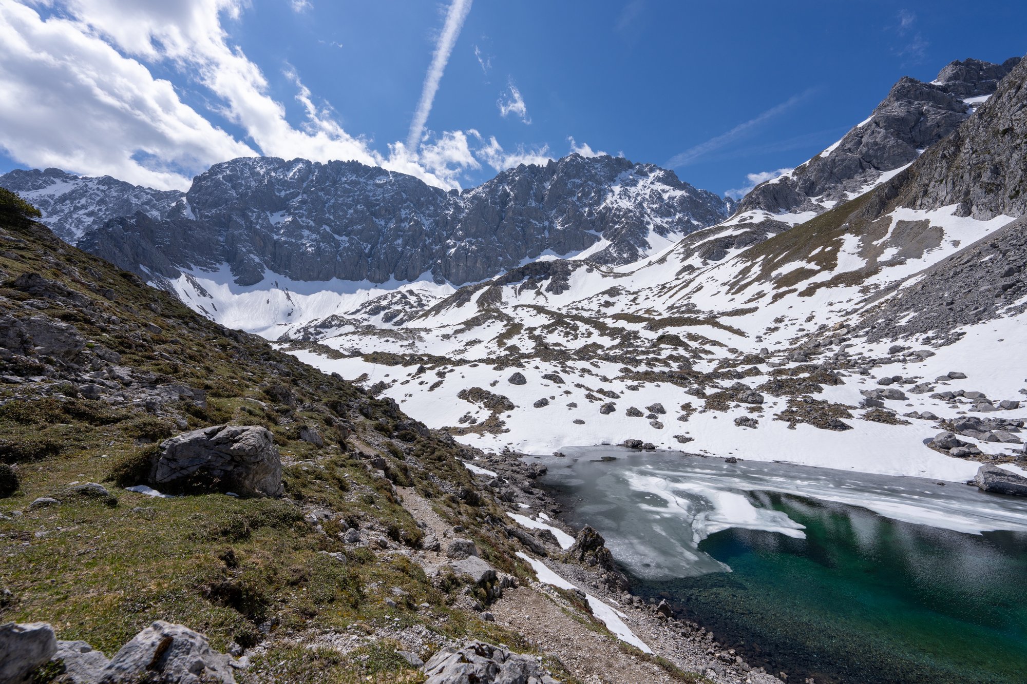 Op het pad richting Drachensee zien we trouwens ook al wat sneeuw. Niets verontrustends denken we, maar het geeft wel aan dat er bij Drachensee en hoger waarschijnlijk nog wel een aardig pak ligt. Als we daardoor hadden moeten afdalen vanuit Tajatörl, dan waren we niet blij geweest. We hebben de goede keuze gemaakt.
