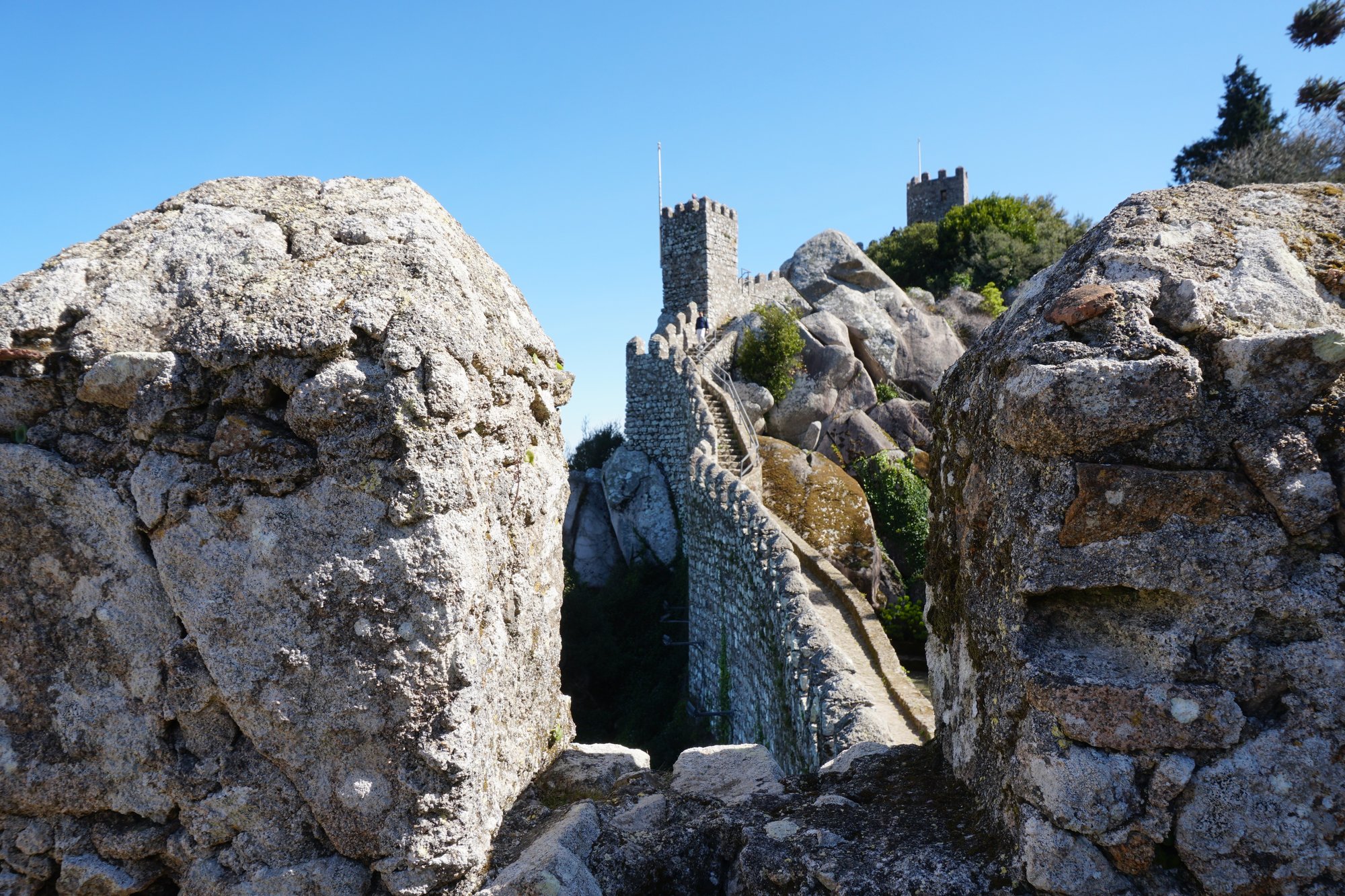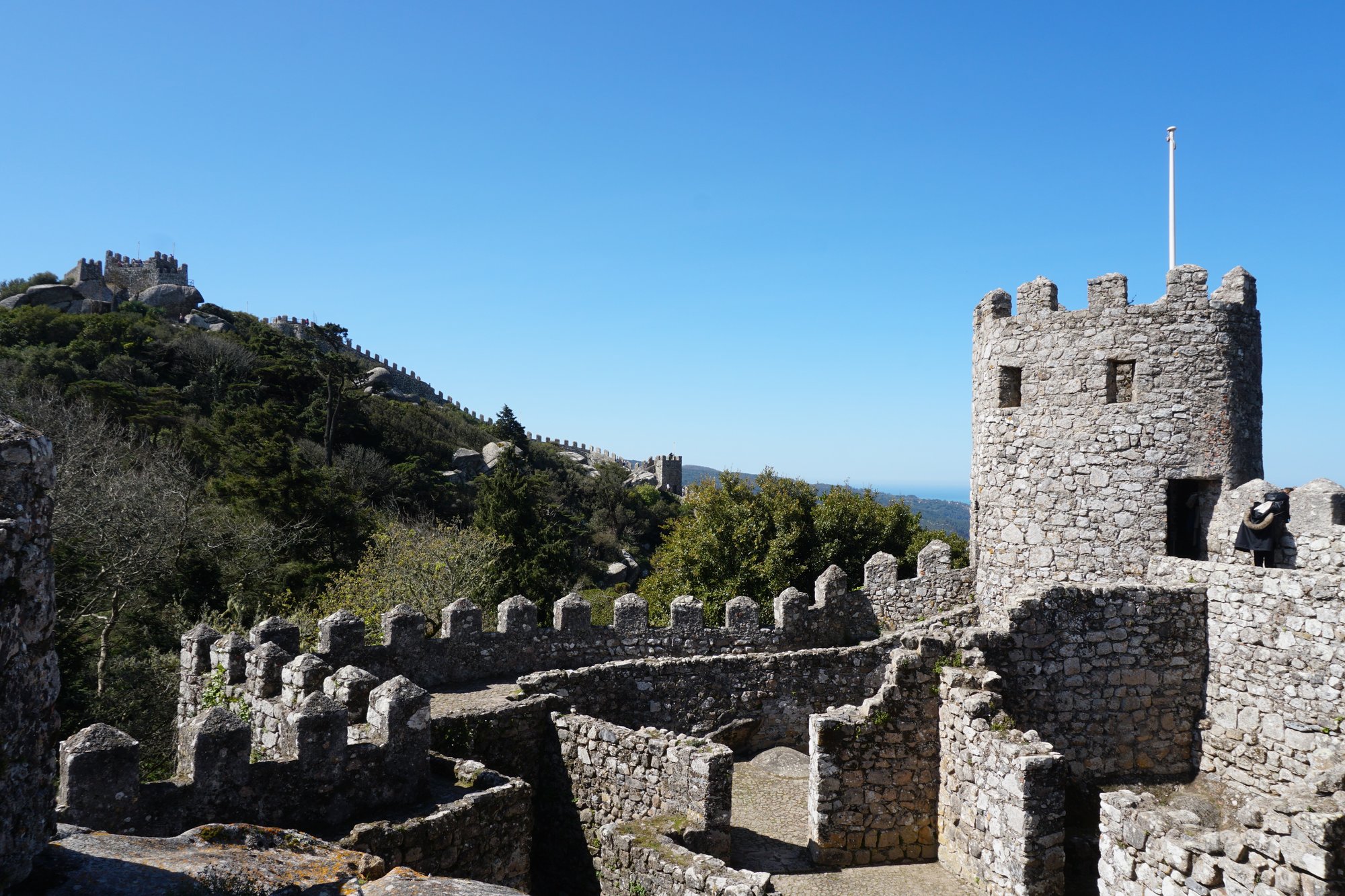 Nu is het Moors kasteel aan de beurt. Dat ligt op een paar minuutjes wandelen van Palacio de Pena en het is hier gelijk een stuk rustiger. Heerlijk! De wandeling over de oude kasteelmuren geeft je fantastische uitzichten op de groene omgeving, de blauwe oceaan én Pena Palace. Er zijn tal van uitkijktorentjes vanaf waar je de andere beroemde bouwwerken van Sintra ziet liggen.
