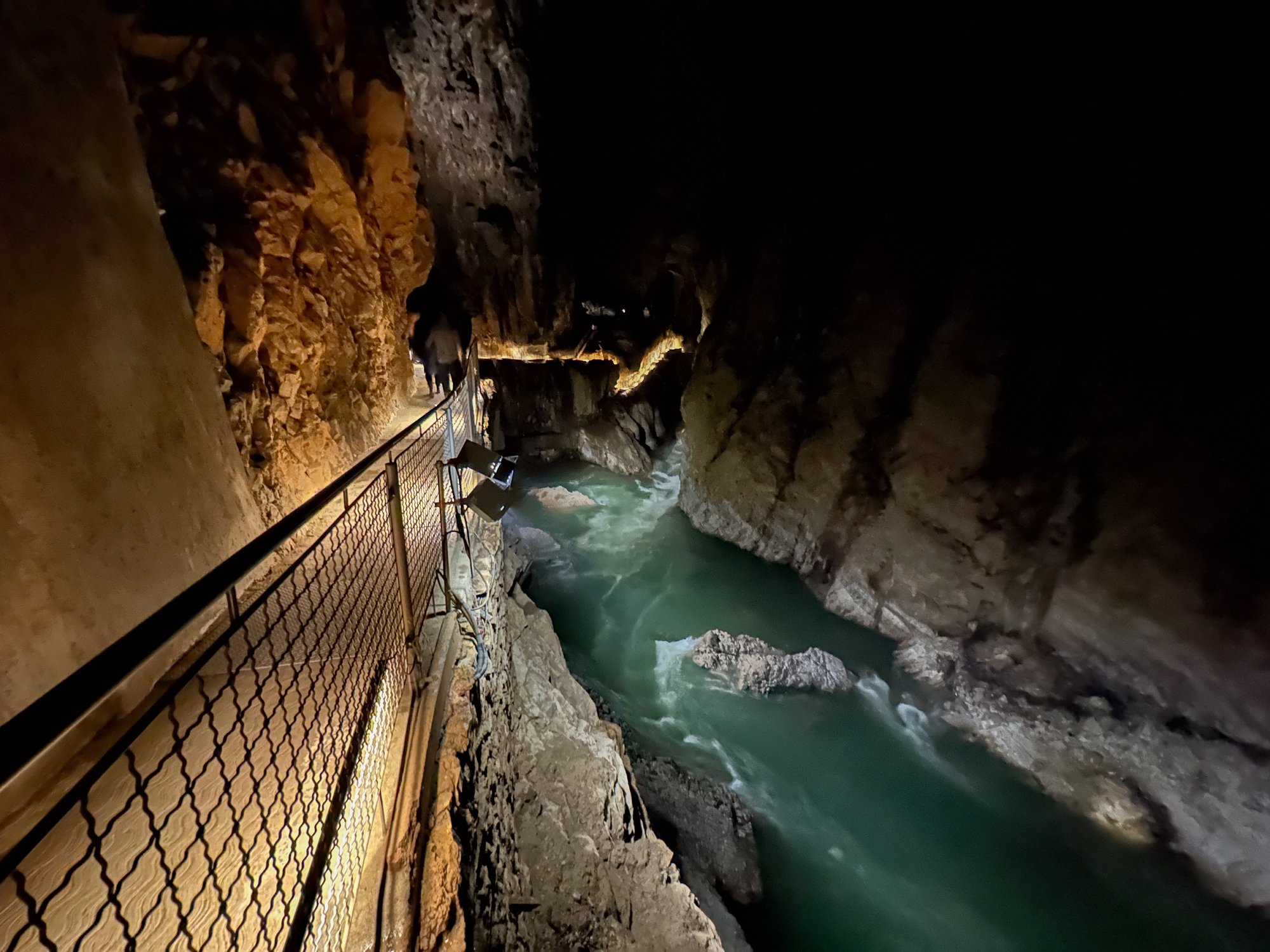 Het eerste deel van de tour is leuk en interessant, maar het wordt pas echt spectaculair als we in het ‘natte gedeelte’ van de grot komen. We horen van een afstandje het water al flink kolken en stappen niet veel later een enorme grotkamer in: Martel’s Chamber. Met 2,2 miljoen kubieke meter is dit één van de grootste grotkamers ter wereld. De Reka rivier heeft zich in miljoenen jaren een weg gebaand door deze grotkamer en daarmee de grootste ondergrondse kloof ter wereld gecreëerd. De kloof is tot 146 meter hoog en 10 tot 60 meter breed. Wij staan perplex. Zoiets hebben we nog nooit gezien.