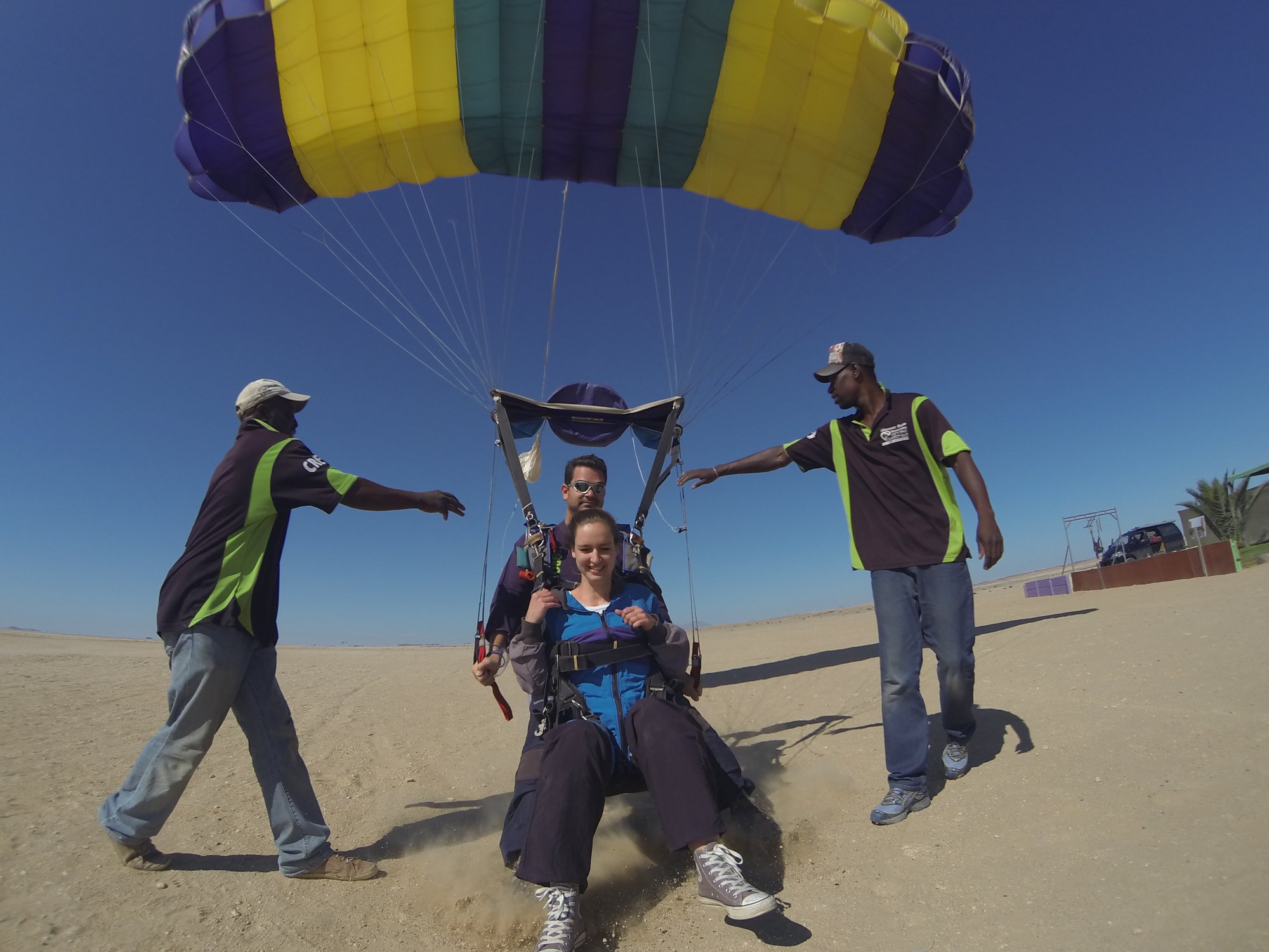 De grond is inmiddels al een stuk dichterbij gekomen en ik zoek naar het plekje waar ik op het vliegtuigje ben gestapt om te kijken of ik Djura kan zien, maar daar zijn we nog veel te hoog voor. De instructeur vraagt me ‘do you want to make some fun?’. Ik antwoord met ‘sure!’. Hij trekt aan de touwen van de parachute en we tollen naar beneden. De g-kracht trekt het bloed naar mijn benen en ze beginnen vrij snel te tintelen. Dit gaat echt hard! Vooraf dacht ik dat het avontuur er al ver op zou zitten zodra je aan de parachute hangt maar integendeel. Even later geeft de instructeur mij de touwtjes in handen. Ik laat me natuurlijk niet kennen en trek ook hard aan de touwen en de instructeur lacht. De instructeur neemt de touwen weer over en stuurt naar de plek waar we landen. Inmiddels kan ik Djura zien en zij ziet me met een grote lach op mijn gezicht veilig landen.