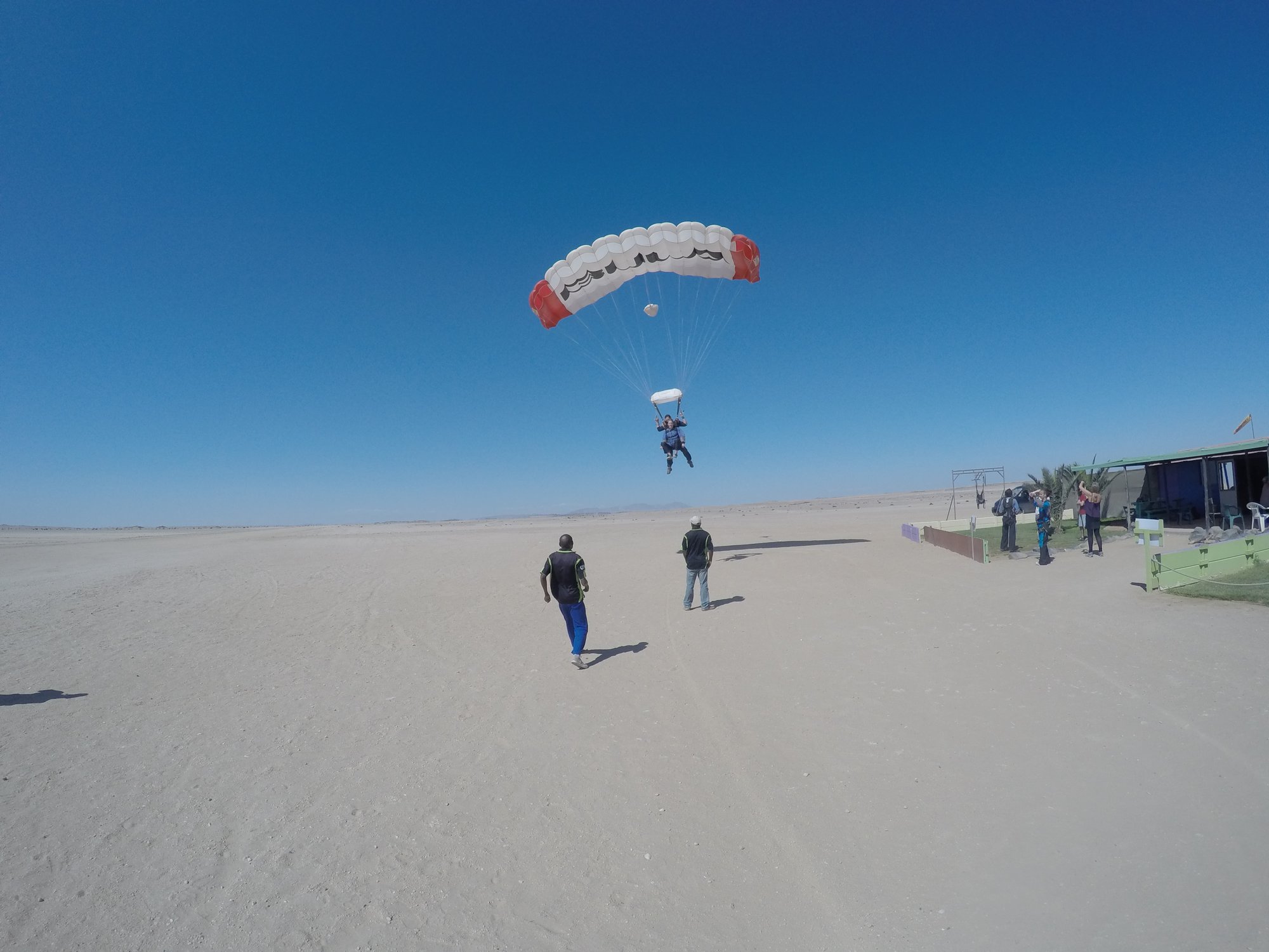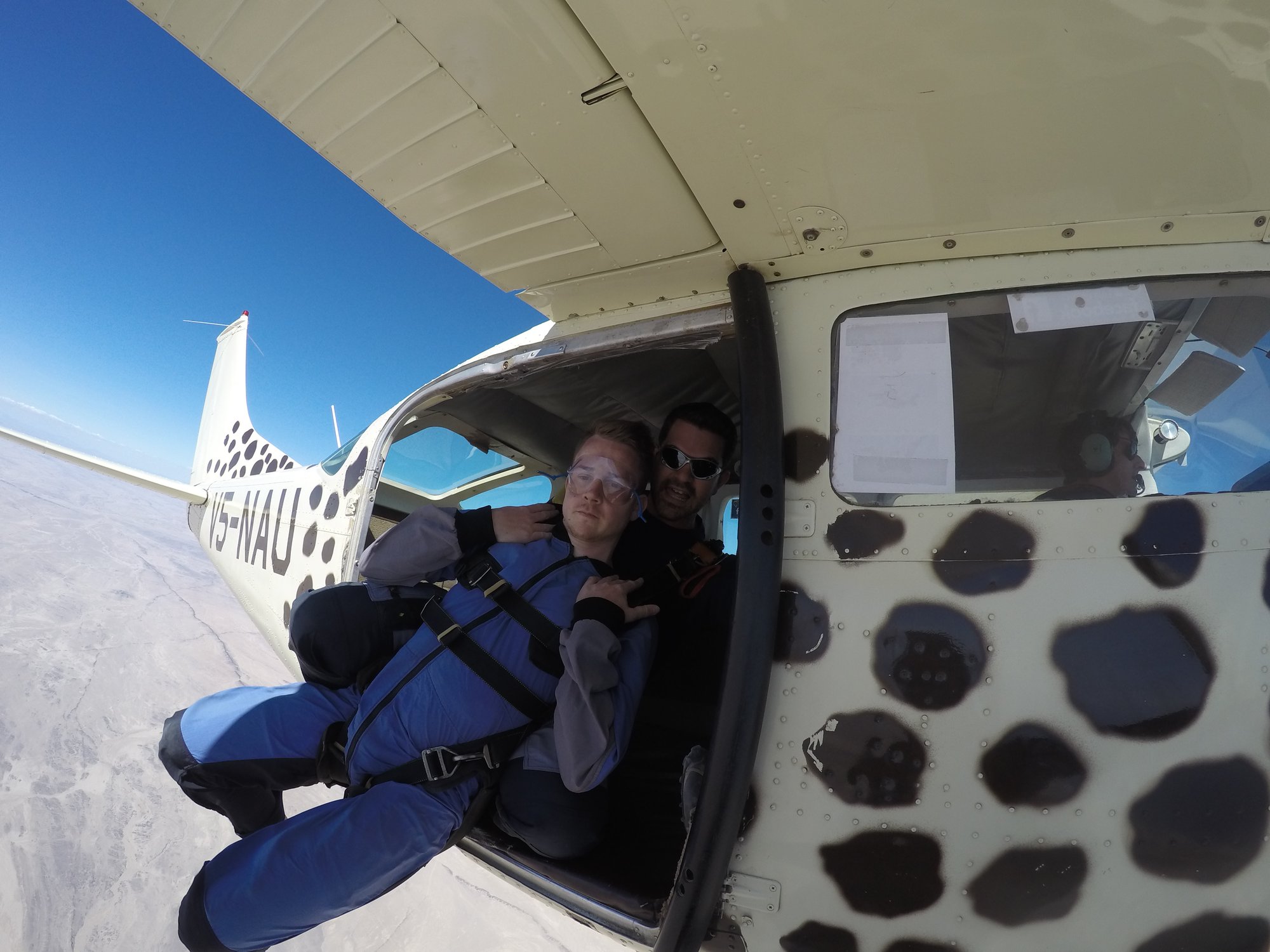 Na een ochtend quad rijden in de woestijn worden we door een busje opgehaald. We zijn gezond gespannen en ik heb er enorm veel zin in. Hoe zou het voelen als je van 3 kilometer hoogte uit een vliegtuig springt? Als we aankomen op het mini vliegveldje enkele kilometers vanaf de kust, zie je de kleine sportvliegtuigjes al staan. Na een korte briefing bij één van deze vliegtuigjes mogen we ons gaan omkleden. Al vrij snel word ik omgeroepen. Het is zo ver! Ik geef Djura een kus en stap snel in het kleine vliegtuigje.