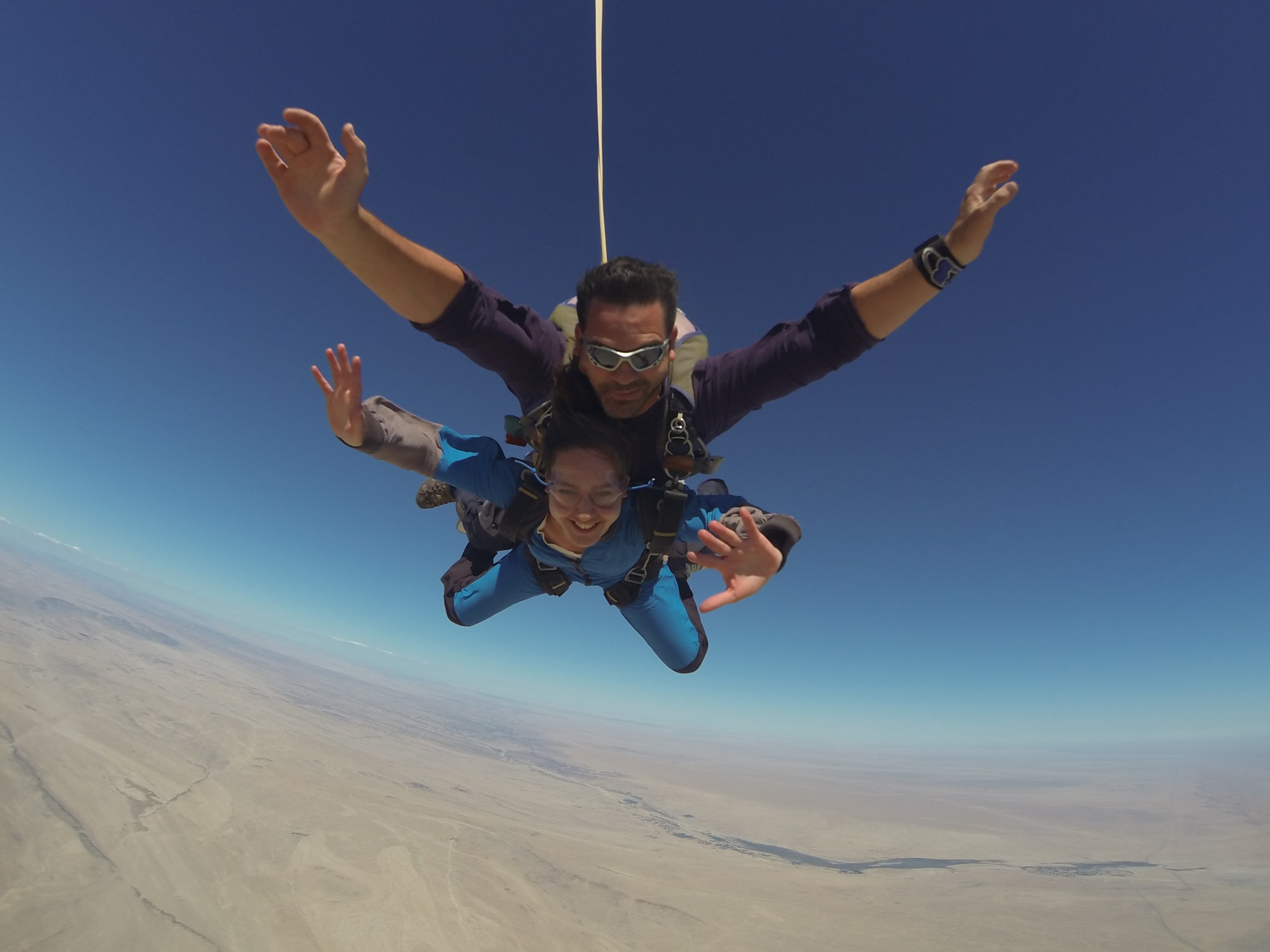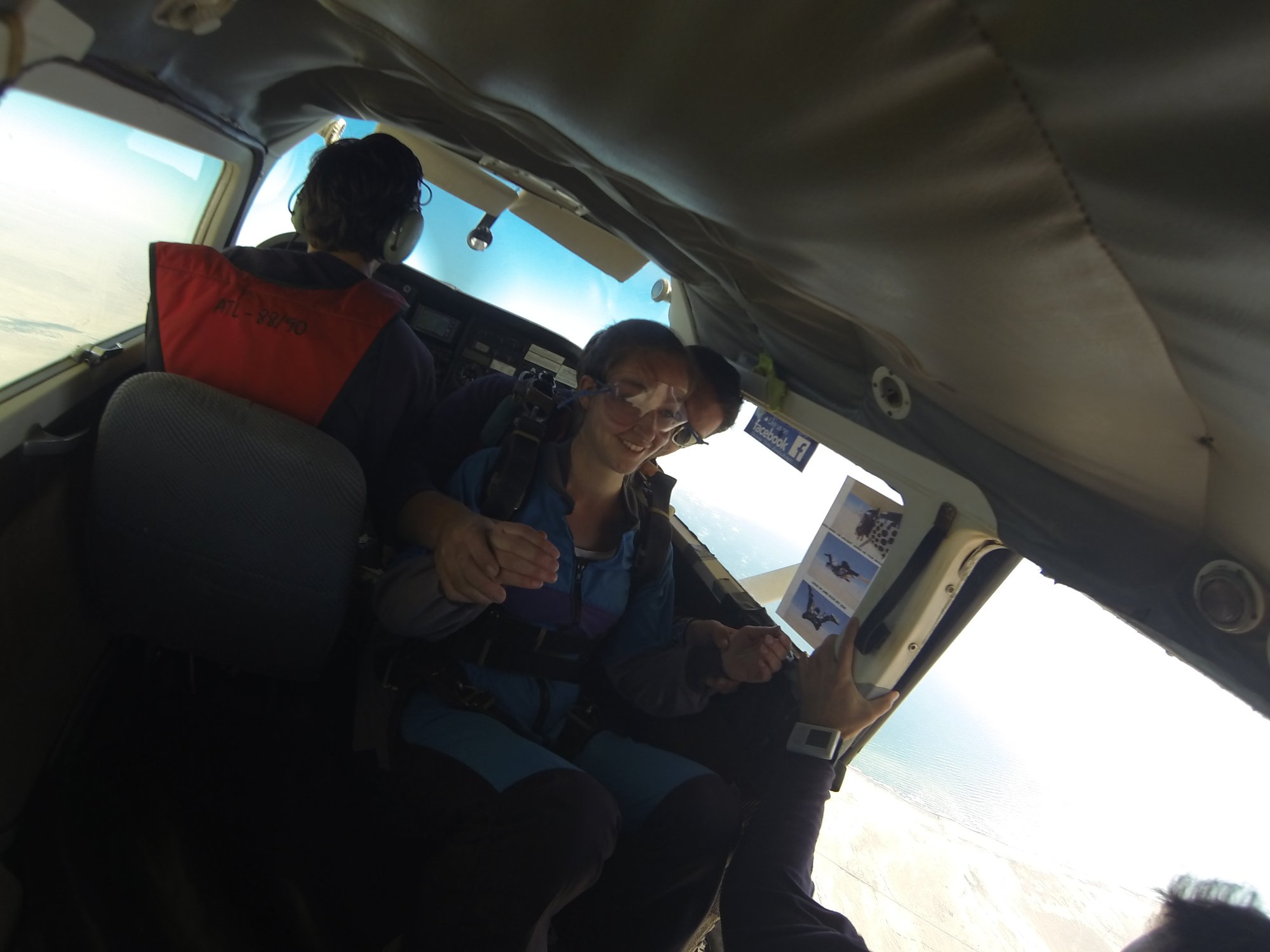 Het vliegtuigje rijdt steeds harder over de droge, zanderige grond. Ik zit vlakbij de open deur en zie de schaduw van het vliegtuigje steeds kleiner worden. Het duurt een kwartiertje voordat we op 3 kilometer hoogte zijn. Als we ongeveer op 2 kilometer hoogte zijn worden de voorbereidingen in gang gezet. Ik word aan de instructeur gekoppeld en de laatste checks worden gedaan. Dan krijg ik het seintje dat het zo ver is. We draaien een kwartslag en ik zit in de deuropening met mijn benen uit het vliegtuig. Ik moet moeite doen om ervoor te zorgen dat mijn benen niet naar de staart van het vliegtuig worden geblazen. Links van me zie ik de cameraman die met me meespringt op het vliegtuigwiel zitten. Ik moet mijn hoofd naar achter houden en voel dat de instructeur zich afzet. Daar gaan we.