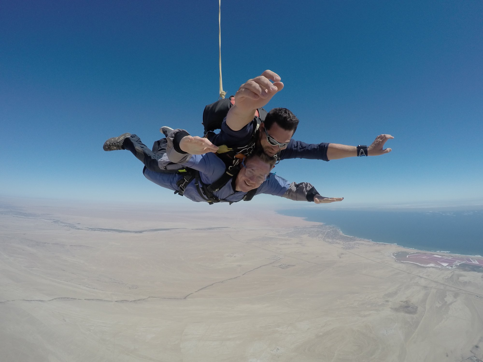 Een tandemsprong in Swakopmund kost €165,-. Voor €65,- extra springt er een cameraman met je mee die foto's en een leuke video maakt.