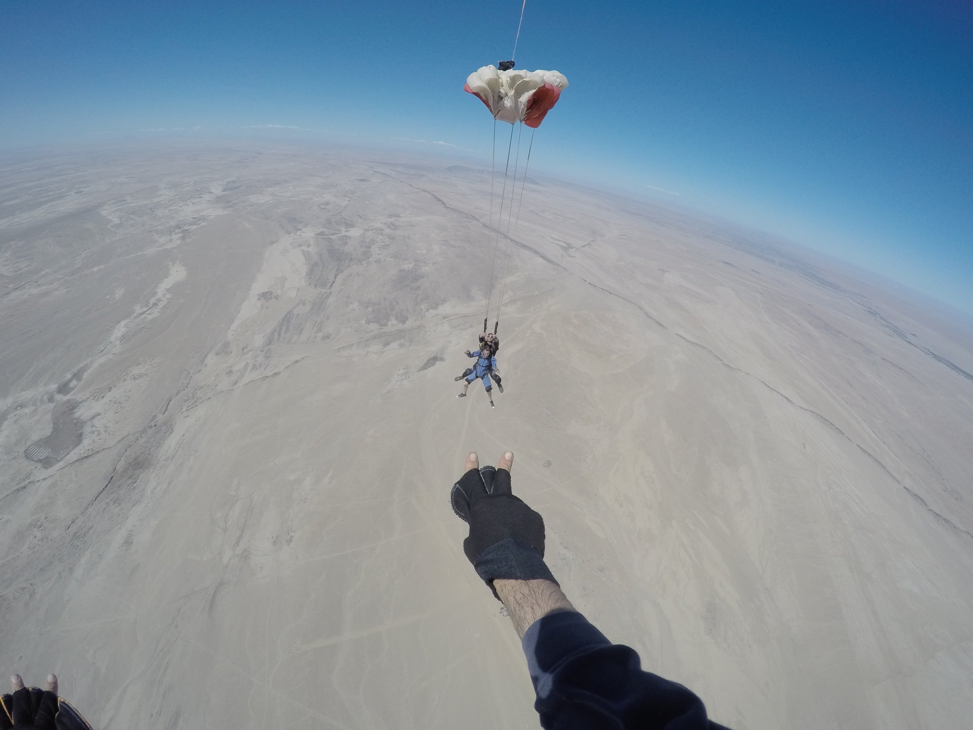Zodra je het vliegtuig verlaat begrijp je eigenlijk niet zo goed wat er gebeurt. Ik zie het vliegtuigje een paar keer voorbijkomen en na enkele seconden hangen we stabiel in de lucht. Wauw, de adrenaline schiet door mijn hele lichaam. Ik maak me geen moment zorgen en geniet maximaal van het moment. De cameraman hangt vlakbij ons in de lucht. Kundig schiet hij onder ons door en draait hij om ons heen. Hij wil zoveel mogelijk hoeken vastleggen met de GoPro op zijn hoofd. De instructeur kijkt regelmatig op zijn hoogtemeter.