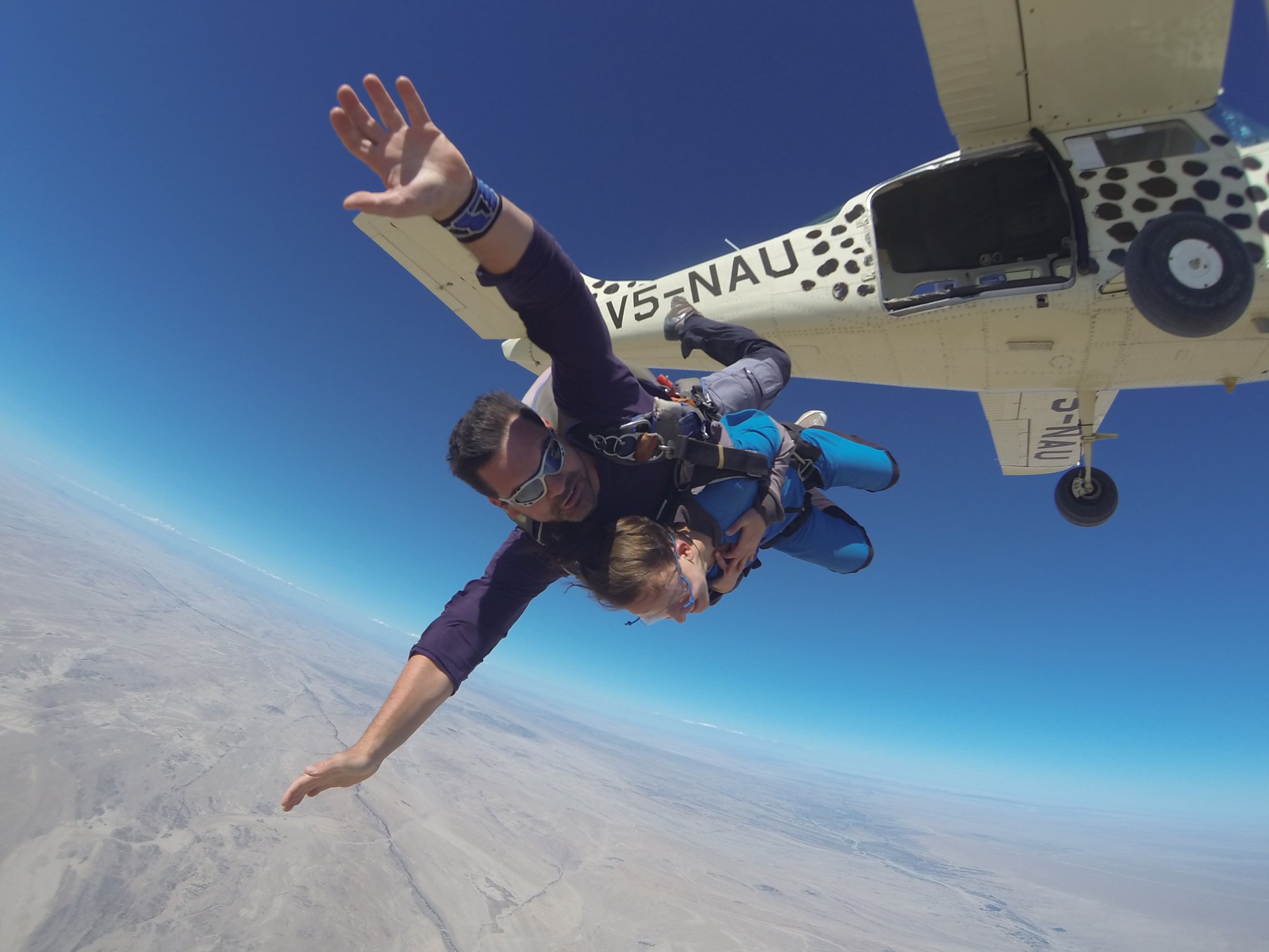 Nog voordat we in Amsterdam op het vliegtuig stapten, wisten we het eigenlijk al zeker. Tijdens deze reis gaan we uit een vliegtuig springen. Uiteraard niet uit de Boeing die ons via Dubai naar Kaapstad bracht, maar uit een klein sportvliegtuigje in Swakopmund. Het is nooit de vraag geweest óf Djura en ik een keer zouden skydiven maar wanneer. Tijdens onze rondreis in Zuidelijk Afrika kwam het er dan eindelijk van…