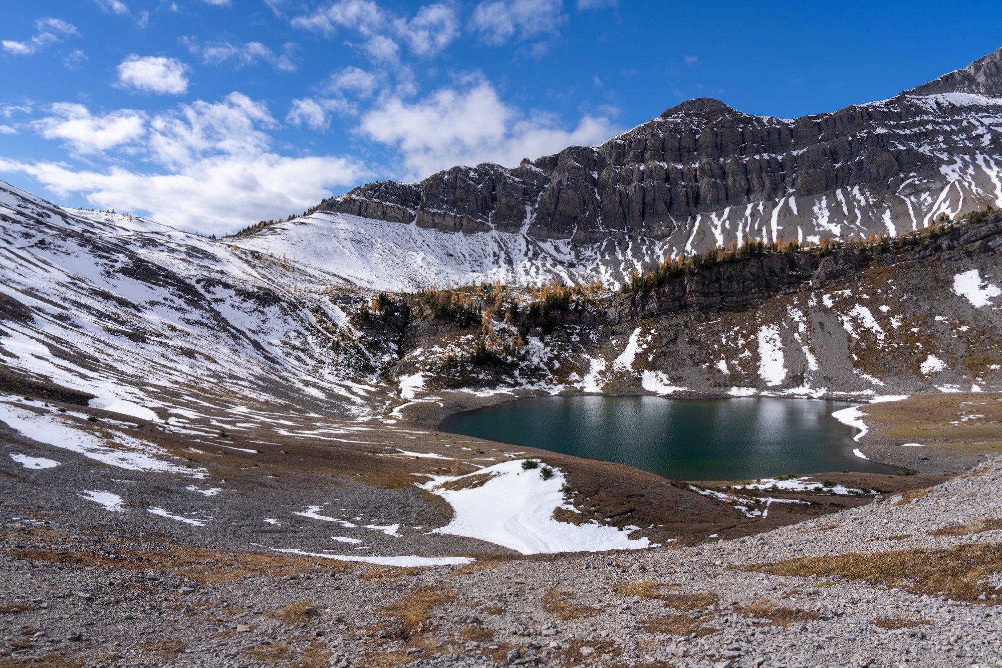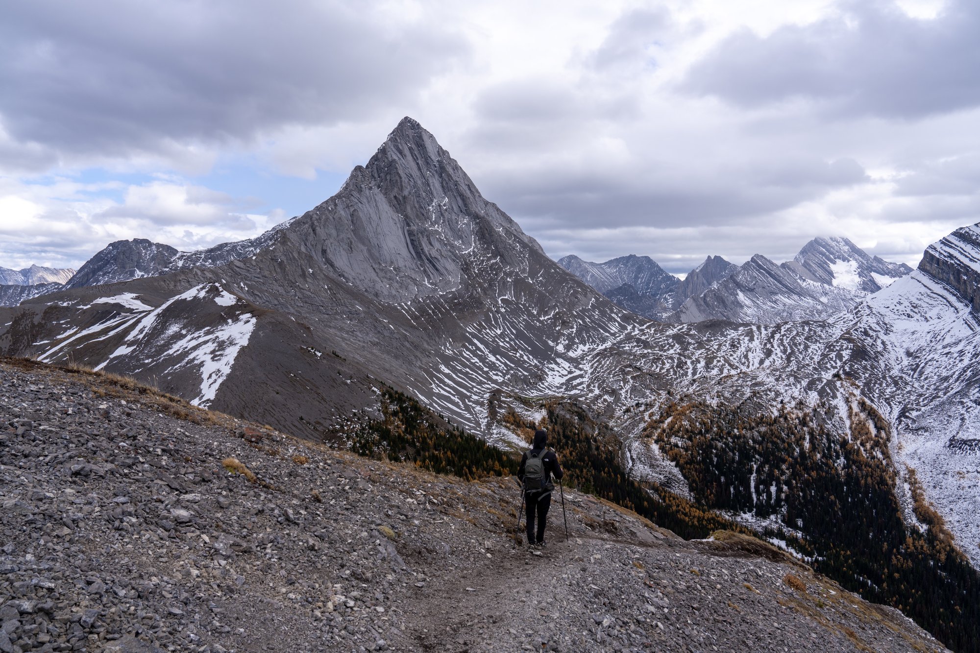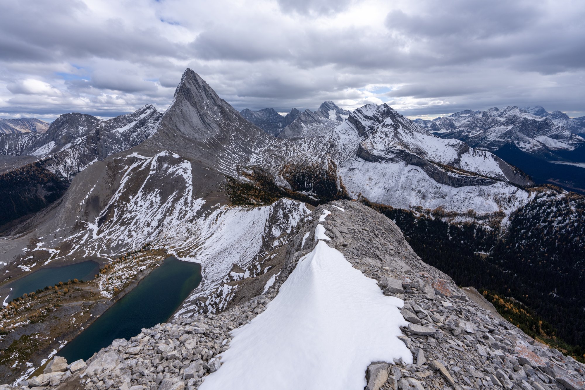 Want het is werkelijk ontzagwekkend. De puntige top van Birdwood Peak, de geelgekleurde bossen, de sneeuw, het meertje beneden ons, de grijze rotswanden. Inmiddels is de lucht wat dichtgetrokken en de wind doet er nog een schepje bovenop. Laten we zeggen dat de omstandigheden passen bij het uitzicht. ;-)