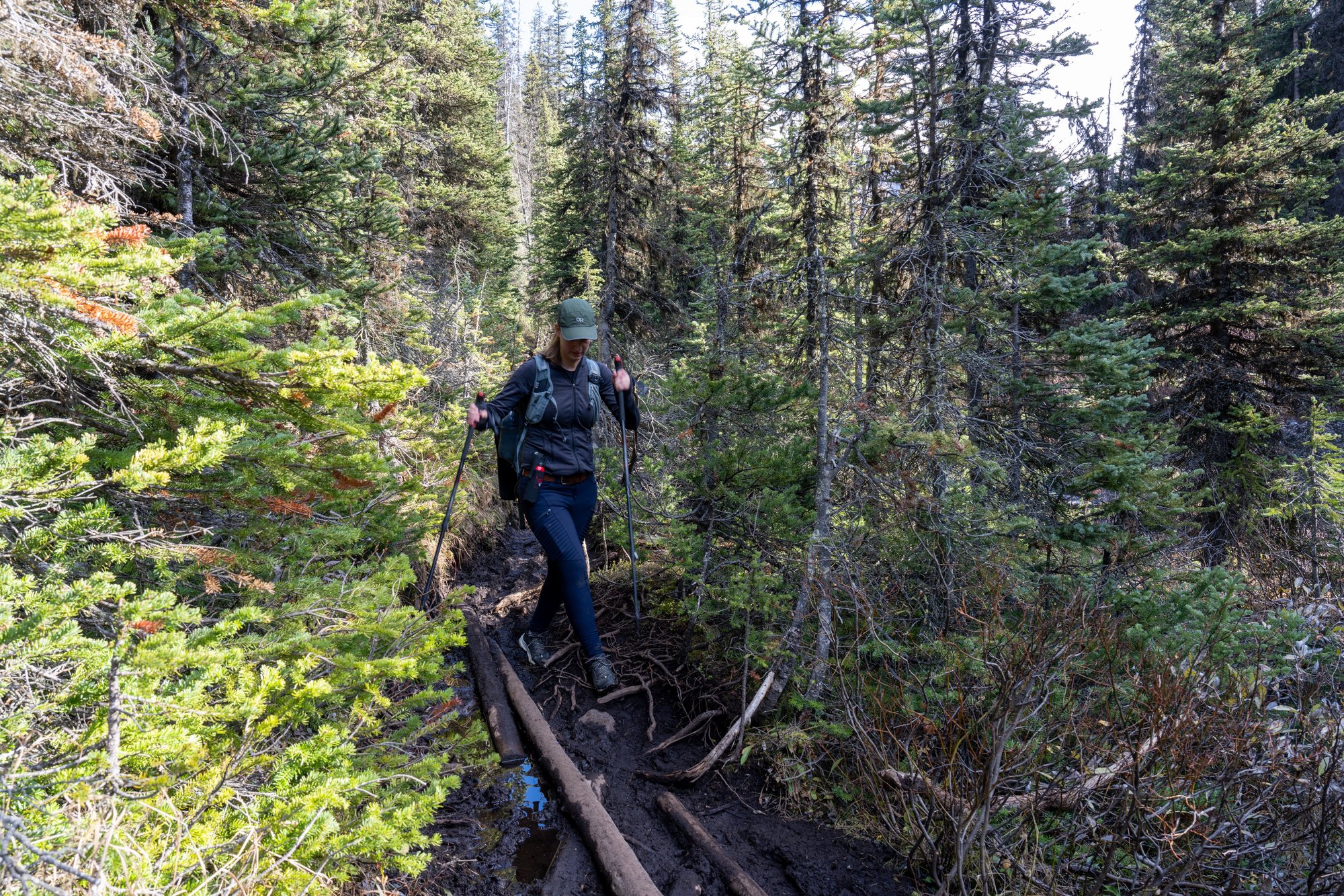 De hike begint met een vlak pad door de bossen. Het is stil en we worden omringd door naaldbomen. In de verte zien we af en toe grijze bergen met sneeuw erop. Het is nu al genieten!