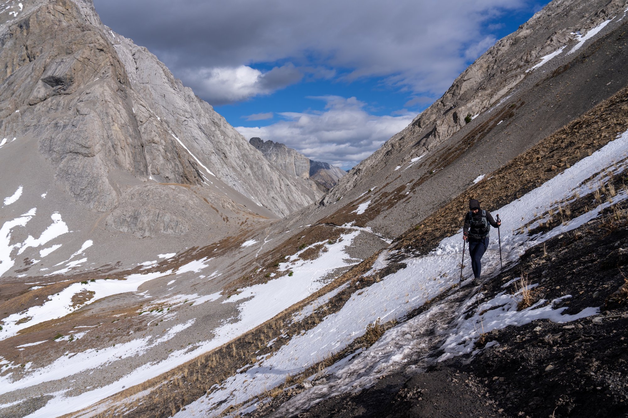 De hike gaat verder langs een bergwand over een heel smal paadje vol gruis en met stukken sneeuw en ijs. Hier wil je geen glijder maken! We kunnen nu ook iets zien van het pad dat leidt naar Smutwood Peak, de top die we willen beklimmen, en dat ziet er onheilspellend uit. Losse stenen, rotsblokken, gruis. En dan die wind erbij… Lichtelijk bezorgd (ik althans) lopen we verder. Tegelijkertijd is het ongekend mooi. Zo rauw. En er is bijna niemand.