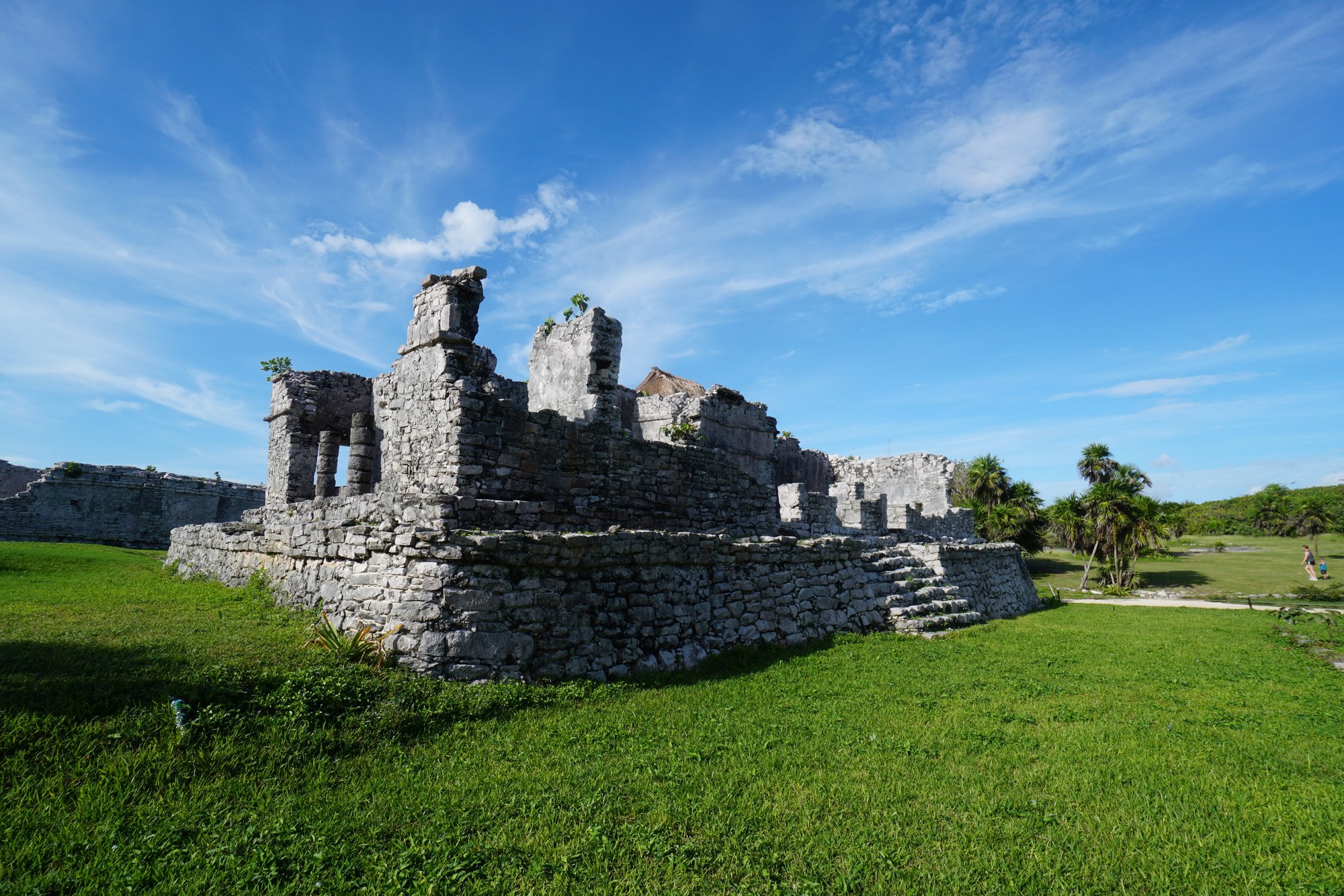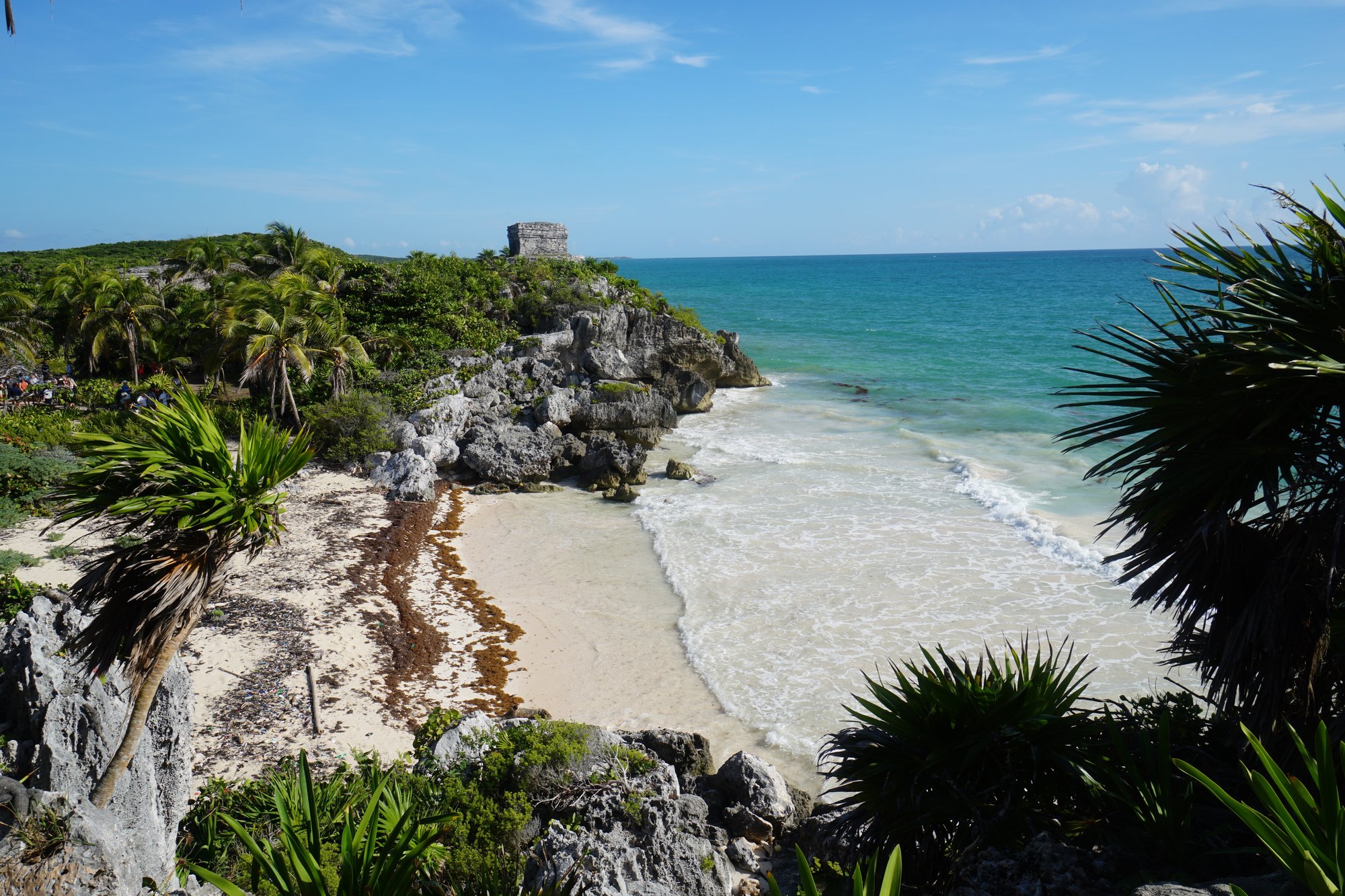Alhoewel we er best op tijd zijn (rond 9:15 uur), staat er al een lange rij bij de kaartverkoop en is het druk met grote tourgroepen bij het naar binnen gaan. De ruïnes zelf zijn mooi om te zien, vooral vanwege de ligging aan zee en tussen de palmbomen. Dat geeft de plek zeker iets extra’s. Aan de andere kant staat het helemaal zwart van de mensen en moet overal uitgebreid geposeerd worden voor tientallen foto’s. Beetje vermoeiend. ;-) Als je in Tulum bent is het leuk om hier even heen te gaan, maar ik zou er ook niet wakker liggen als ik het niet gezien had.