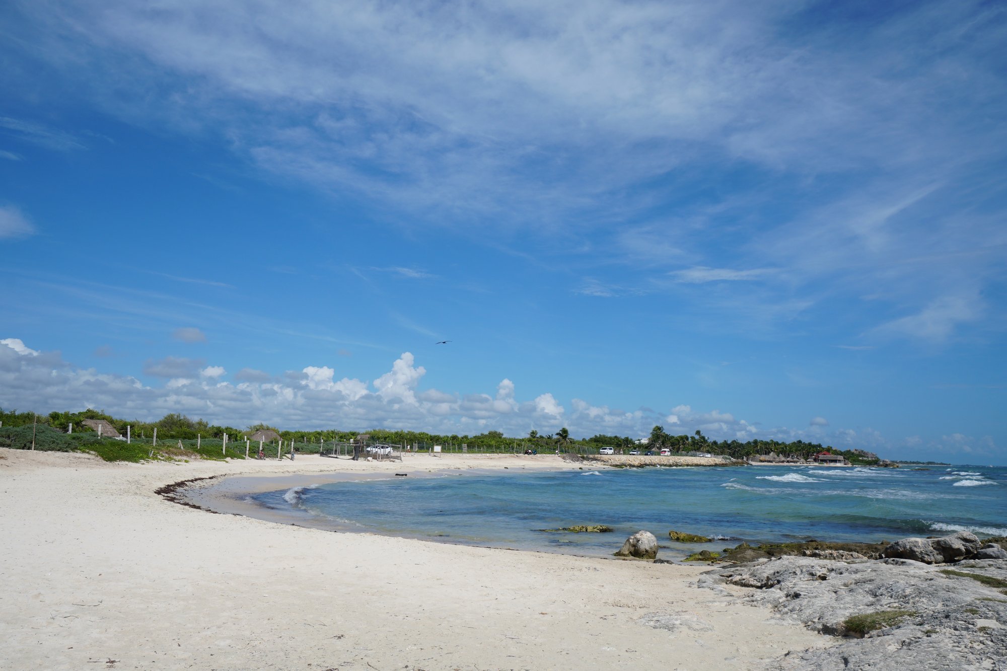 Daar gaan wij in ieder geval niet aan meedoen. Wij zoeken naar een plek waar we toch het beroemde strand kunnen zien waar het allemaal om te doen is. Het lukt om een plekje te vinden waar de weg direct aan het strand ligt en we gratis een kijkje kunnen nemen. Het strand is mooi, maar niet per se heel veel beter dan op andere plaatsen in Mexico. Kijk zelf maar op de foto’s. Wij vonden de stranden bij Isla Holbox bijvoorbeeld aantrekkelijker.