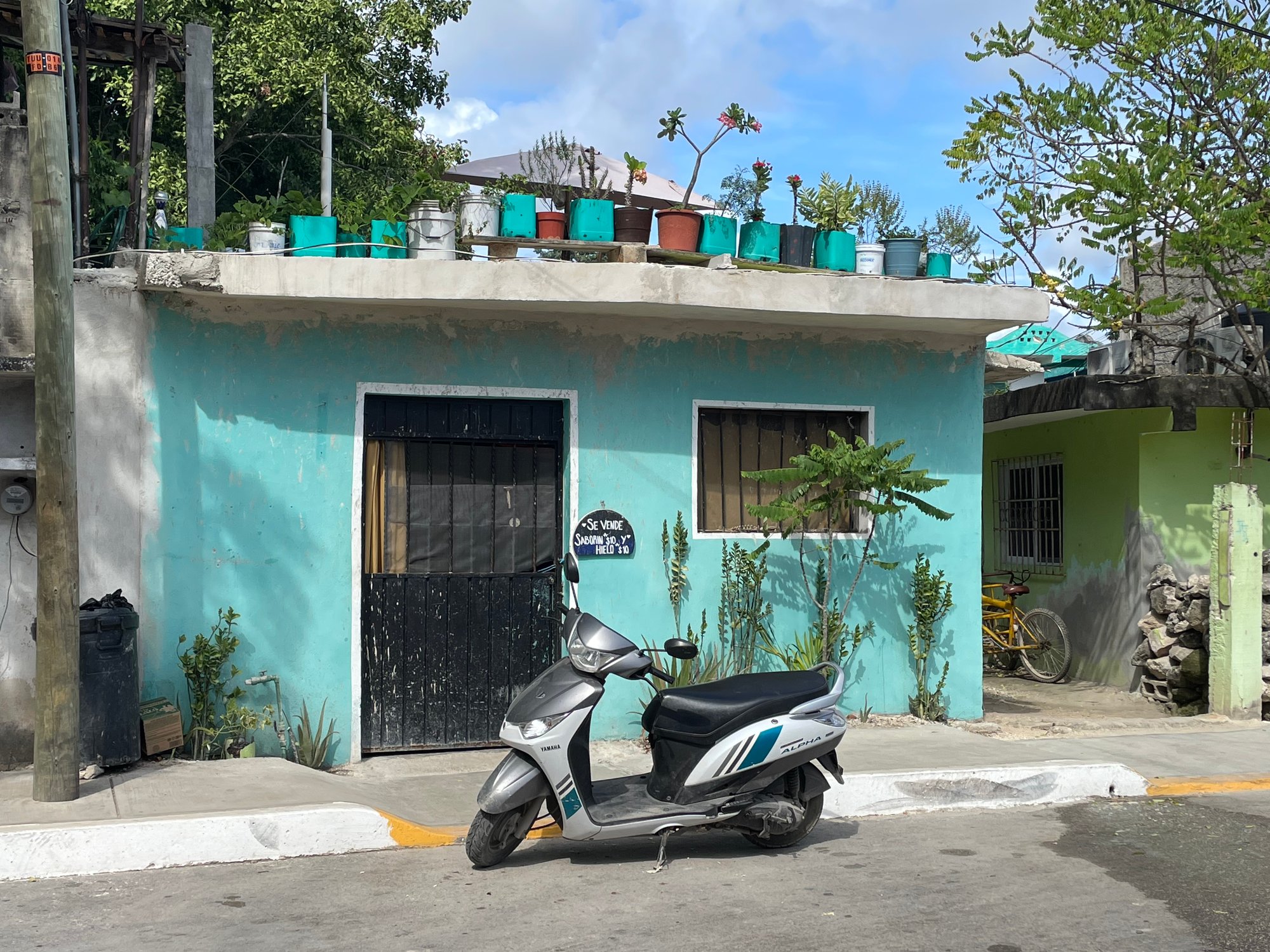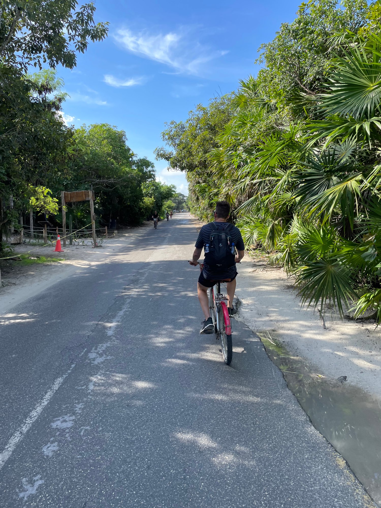 Daarna fietsen we over de weg die langs het strand loopt. De weg is compleet volgezet met beach clubs en fancy restaurants, waardoor je het strand bijna nergens kunt zien. Wil je dat wel? Dan mag je over de brug komen. Strandtenten vragen zo’n 40 tot 100 dollar entree per persoon. Exorbitante bedragen, zeker voor Mexicaanse begrippen.