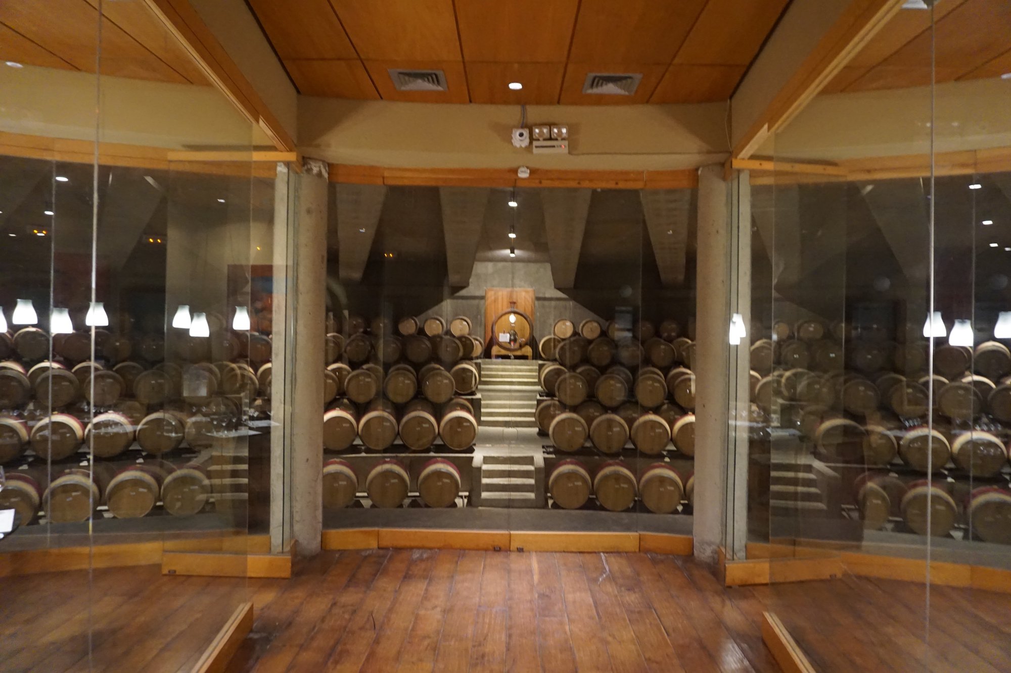Later in de rondleiding mogen we ook een kijkje nemen in de kelder met wijnvaten. De vaten zijn uitgestald in een halve cirkel op verschillende verdiepingen, net een arena. De damp van rode wijn dringt onze neuzen binnen en we horen de klassieke muziek spelen... Het is net of we een wijntempel zijn binnengestapt! De muziek die wordt afgespeeld zou de wijn de juiste trilling geven… Ja, wijn maken nemen ze niet licht op hier bij Viña Montes. ;-) De rondleiding is erg goed gedaan. Qua inhoud beter dan bij het eerste wijnhuis, maar daar was het weer erg leuk dat je een rondje maakte met paard & wagen. Zo geeft ieder wijnhuis zijn eigen draai aan de tours!
