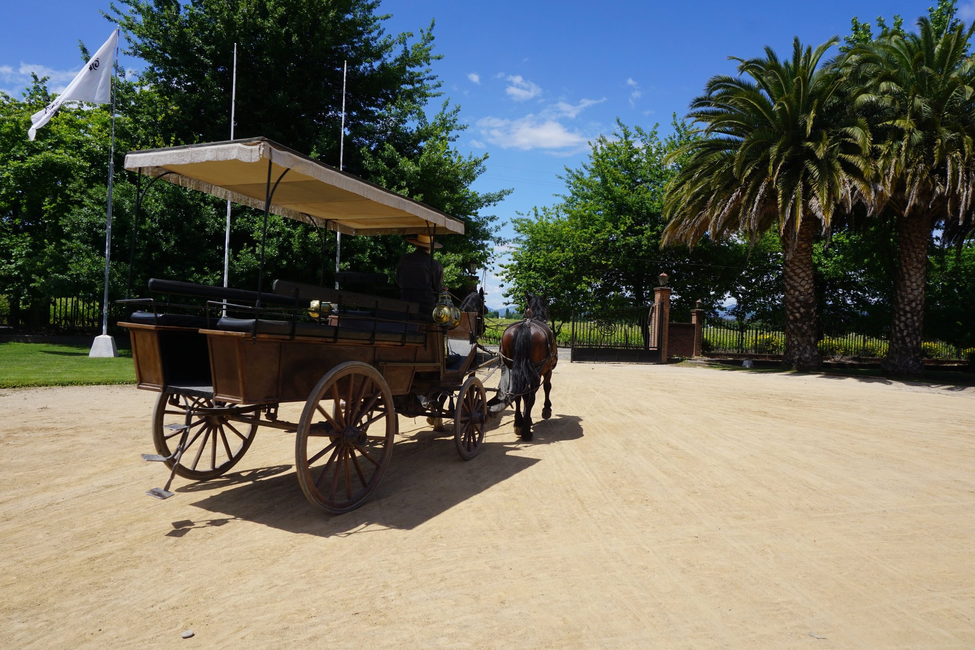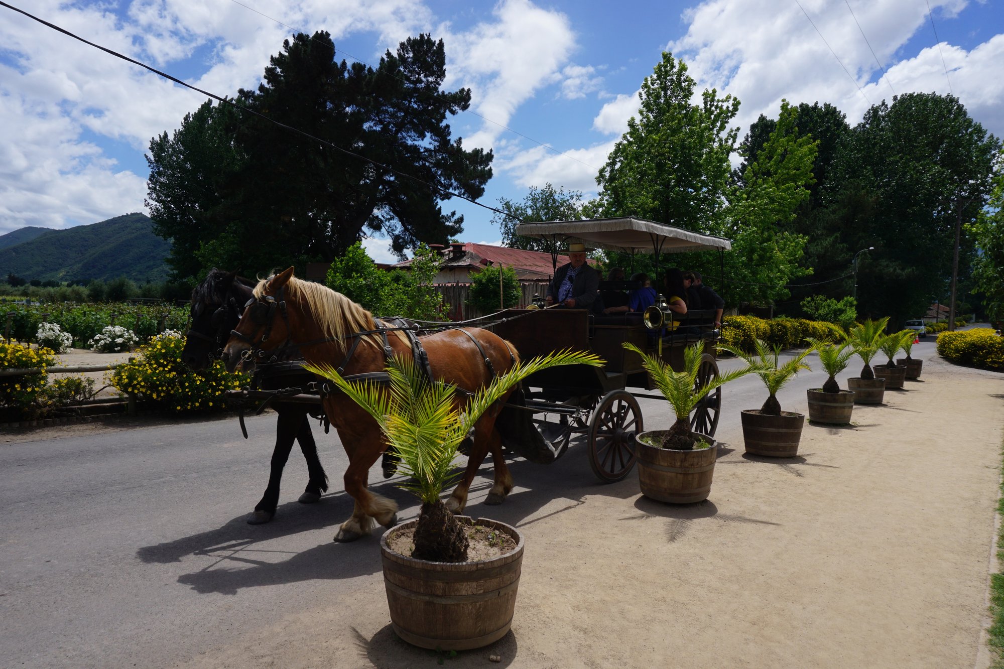 Als eerst fietsen we naar Viña Viu Manent. Dat is een bekende wijnproducent in de Colchagua vallei en zelfs in Chili. We hebben de rondleiding geboekt en die is super leuk. Met paard & wagen worden we door de wijngaarden gereden en we krijgen op een luchtige manier uitleg over het proces om wijn te maken. We mogen ook een Chardonnay proeven die nog ‘in het proces’ zit, zodat je goed het verschil kunt proeven met een wijn die ‘af’ is. Erg leuk! En pfoe, nu ik dit allemaal weet, lijkt goede wijn maken me best ingewikkeld!