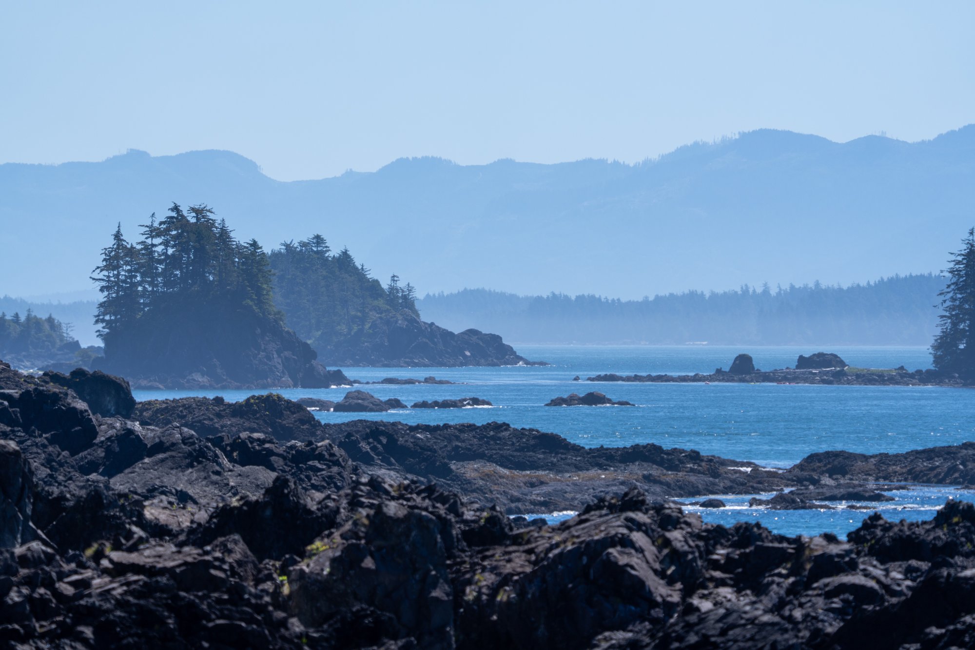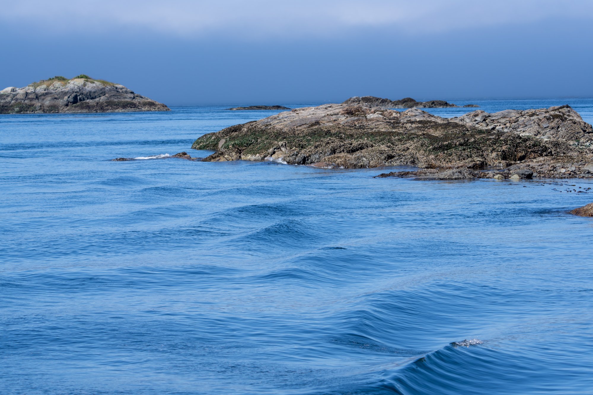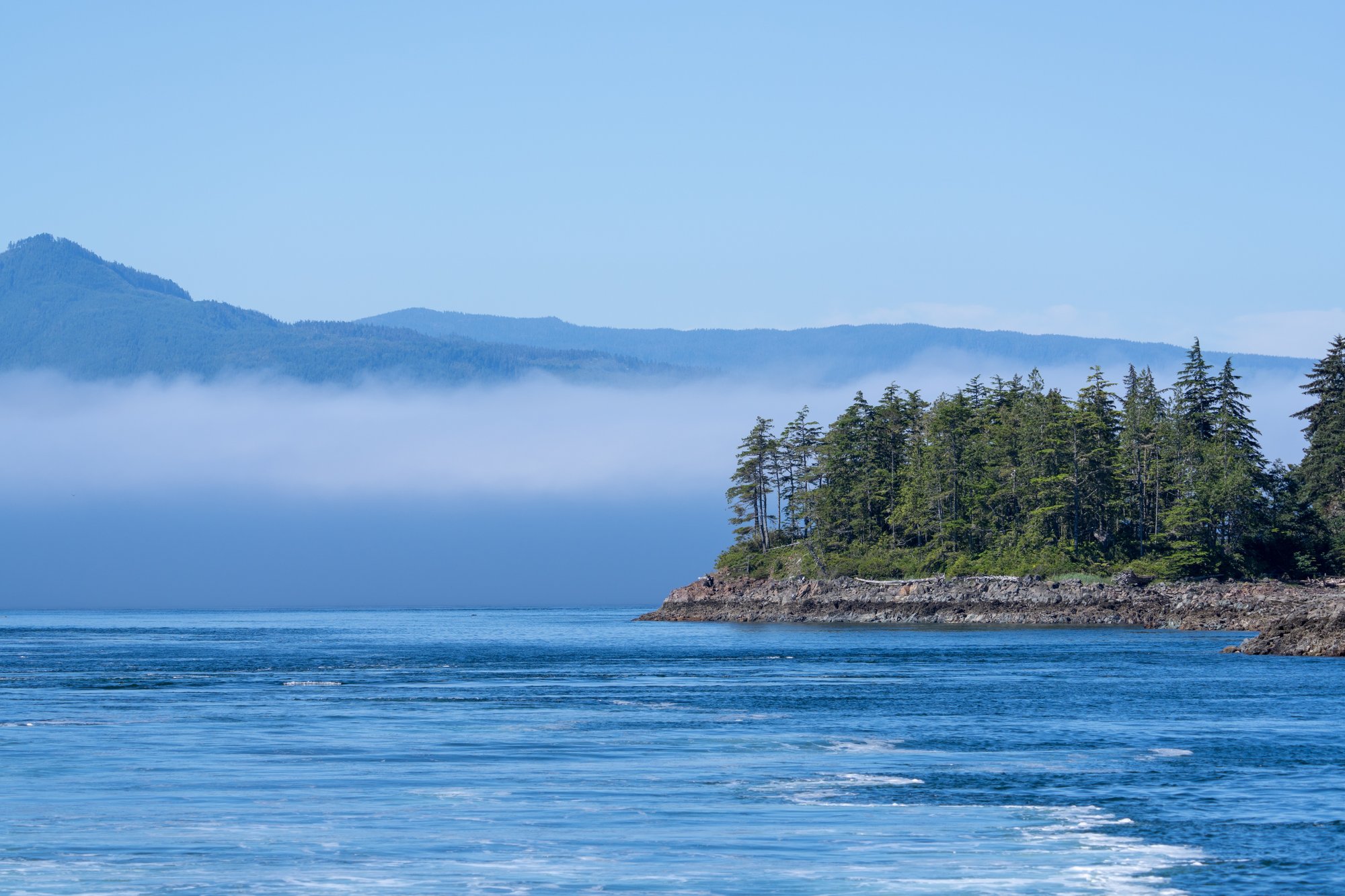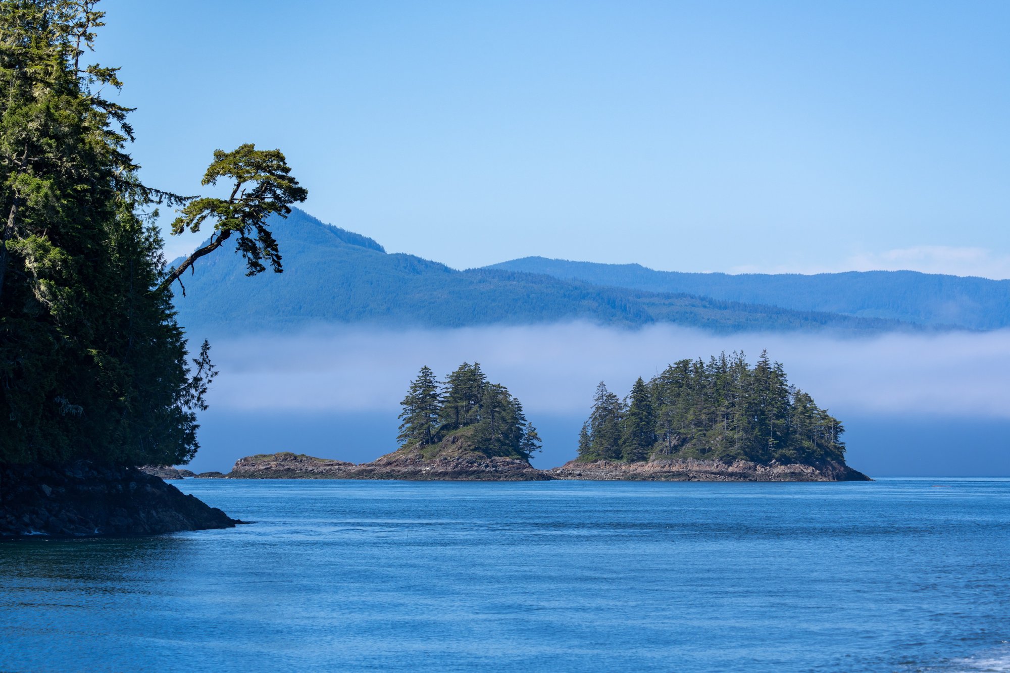 Na 45 minuten varen en tevergeefs luisteren naar geluiden (bijvoorbeeld het spuiten van water) en het afspeuren van de horizon komen we eindelijk in een gebied waar de mist wat opgetrokken is. Er komt direct een waanzinnig landschap vol onbewoonde eilandjes en baaien tevoorschijn. In de verte zien we hoge bergen en om ons heen blauw water en groene bossen. Alleen hiervoor zou je deze boottocht al doen.
