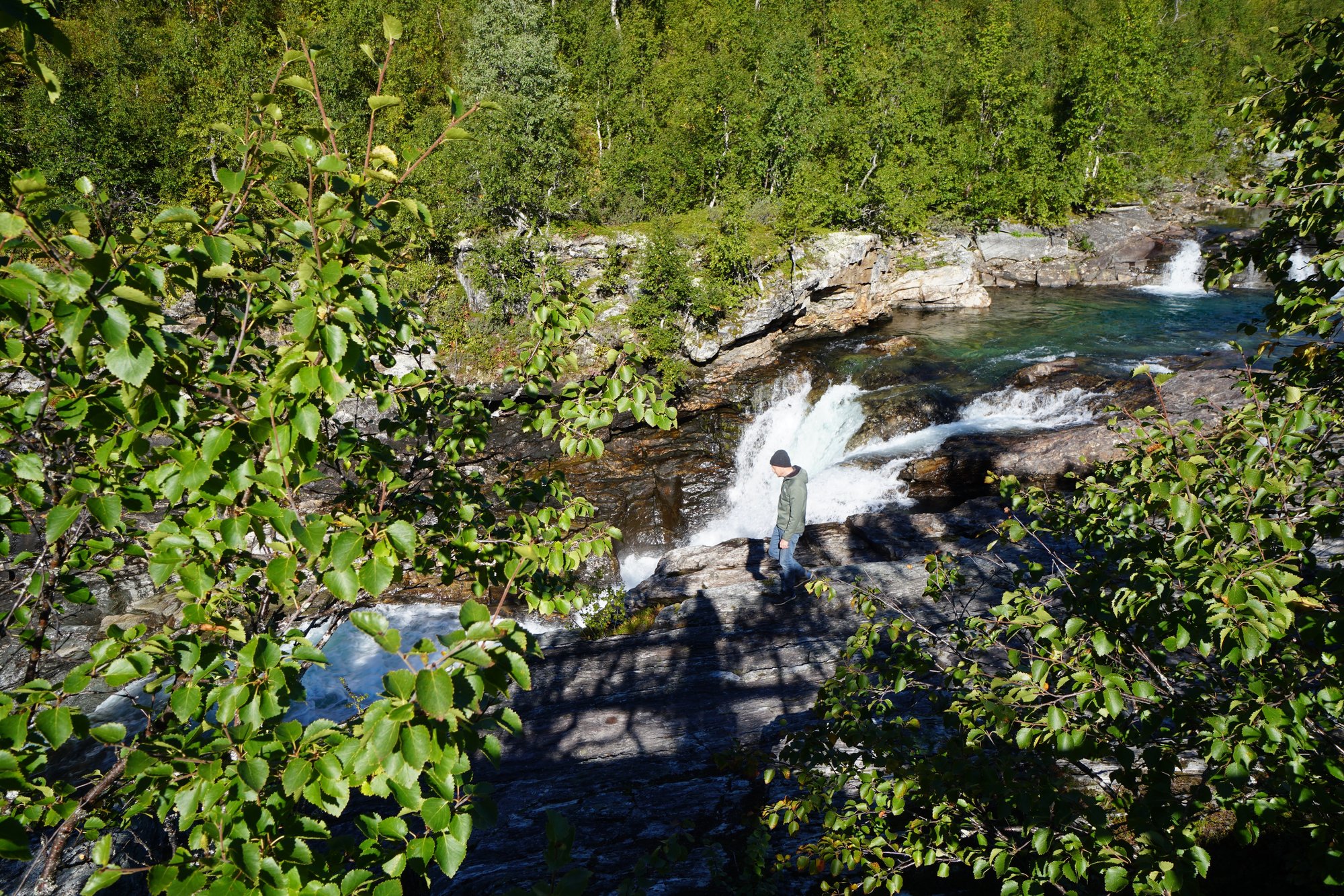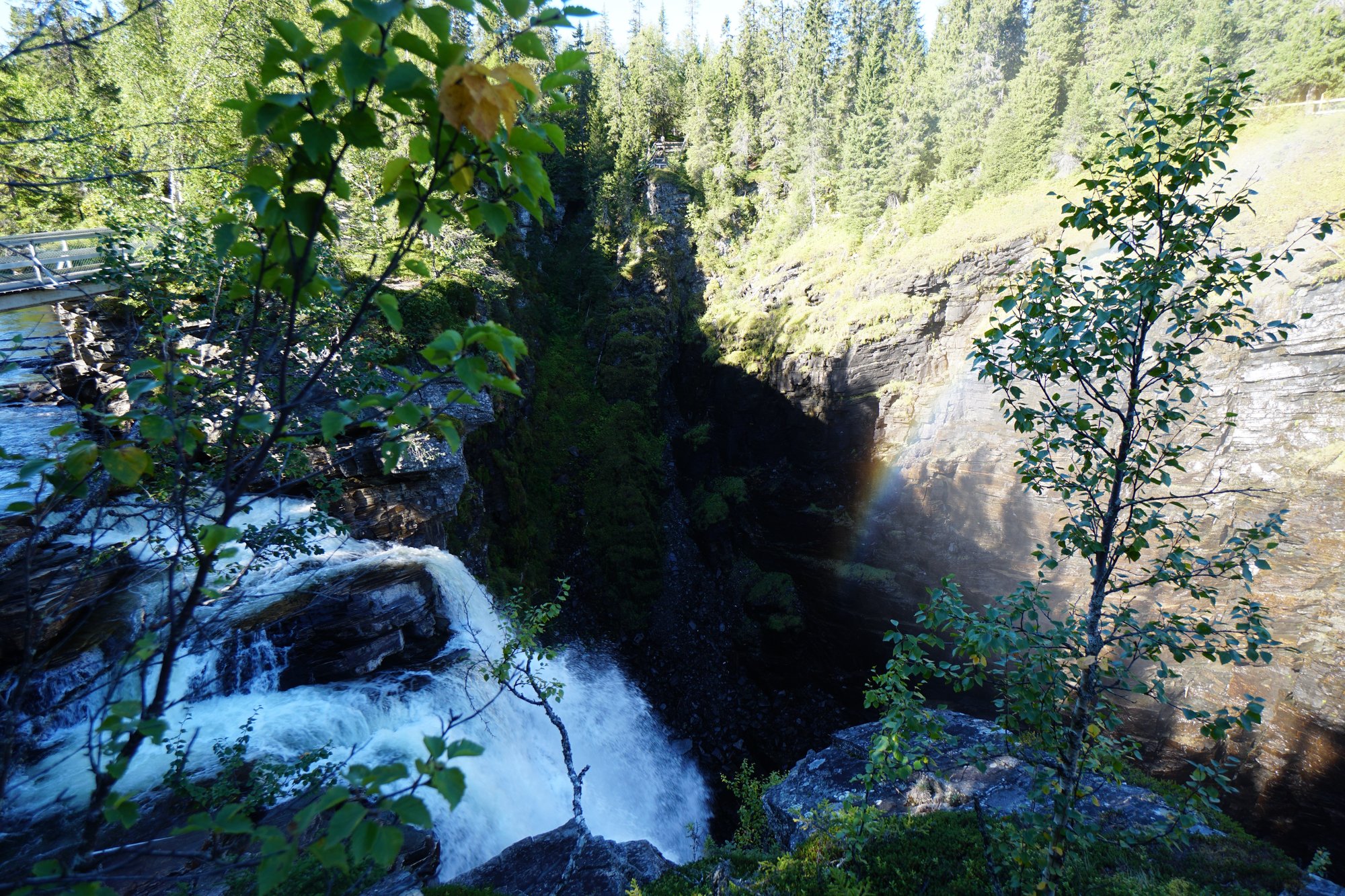 Na 85 kilometer rijden over de Wilderness Road komen we bij onze eerste stop: Trappstegsforsen. Deze waterval verbaast ons direct in positieve zin! Hij is veel breder dan gedacht en heeft onwijs veel kleine trappen waarover het water valt. Het is een mooi plaatje en dat direct langs de weg!