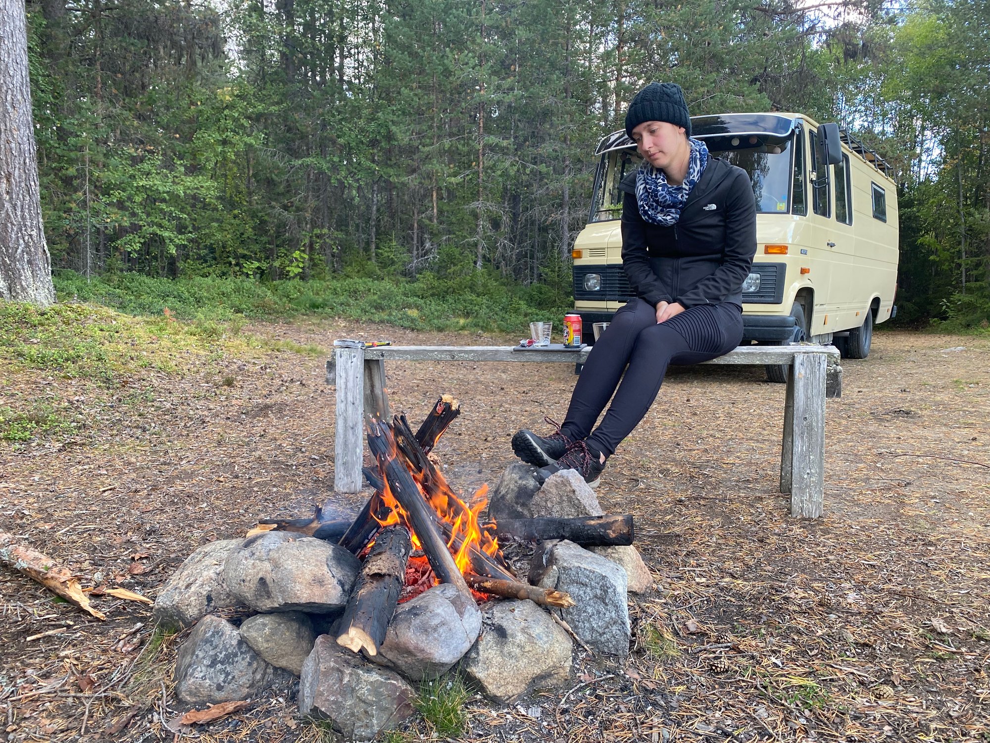 We vinden een fijn plekje midden in het bos, iets voorbij Klimpfjäll. We moeten een paar honderd meter door een hobbelig paadje rijden waar Bruno net in past, maar dan heb je ook wat. Een plek voor jezelf, aan het water, omringd door bossen. Top!