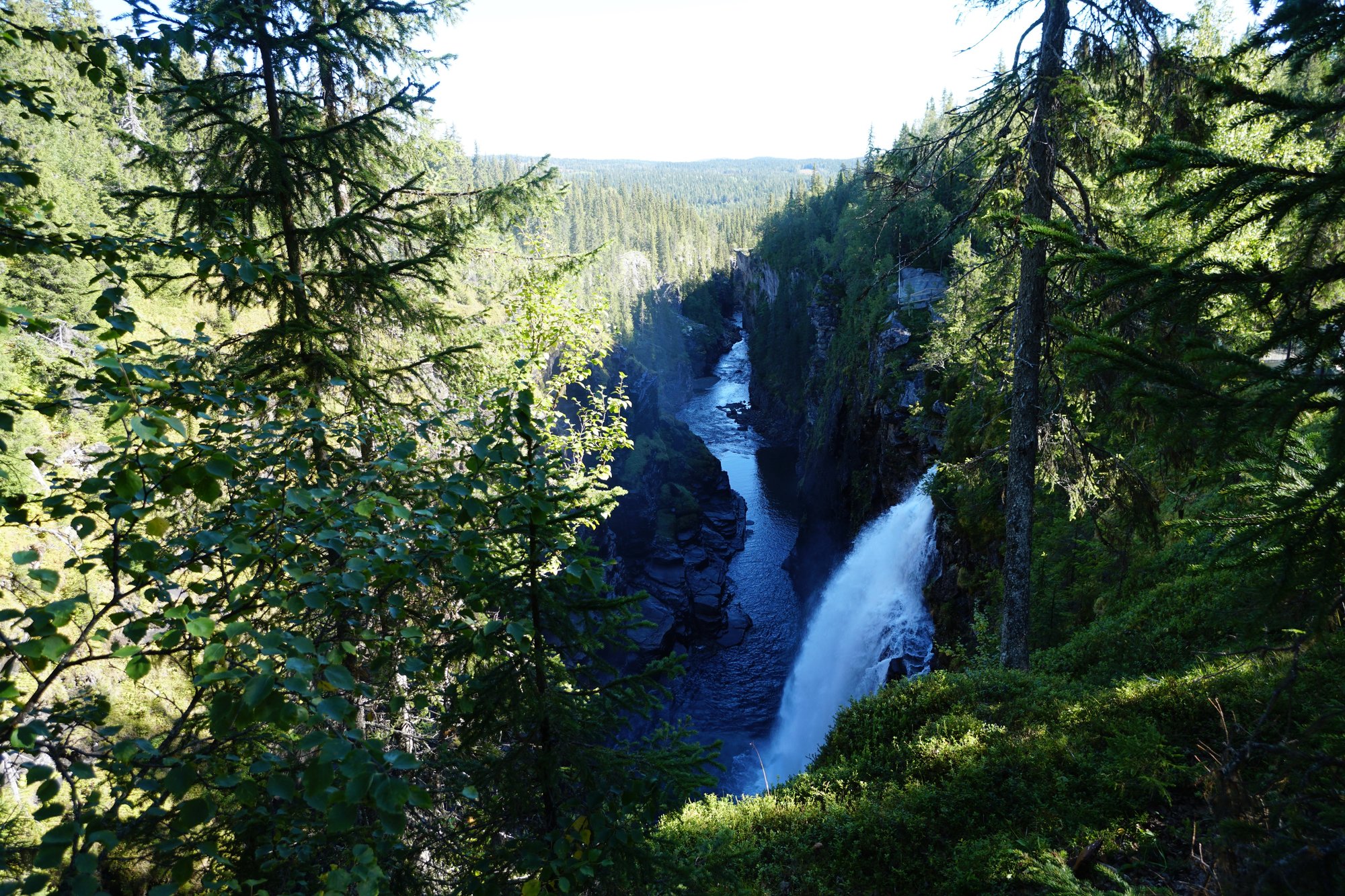 De volgende ochtend rijden we nog naar Hällingsåfallet. Dit blijkt één van de mooiste stops op de route te zijn. In een 40 meter hoge kloof stort het water over een machtige waterval naar beneden en stroomt verder de donkere kloof in. Daaromheen zie je oneindig veel bossen en wat heuvels. Echt een schitterende plek!