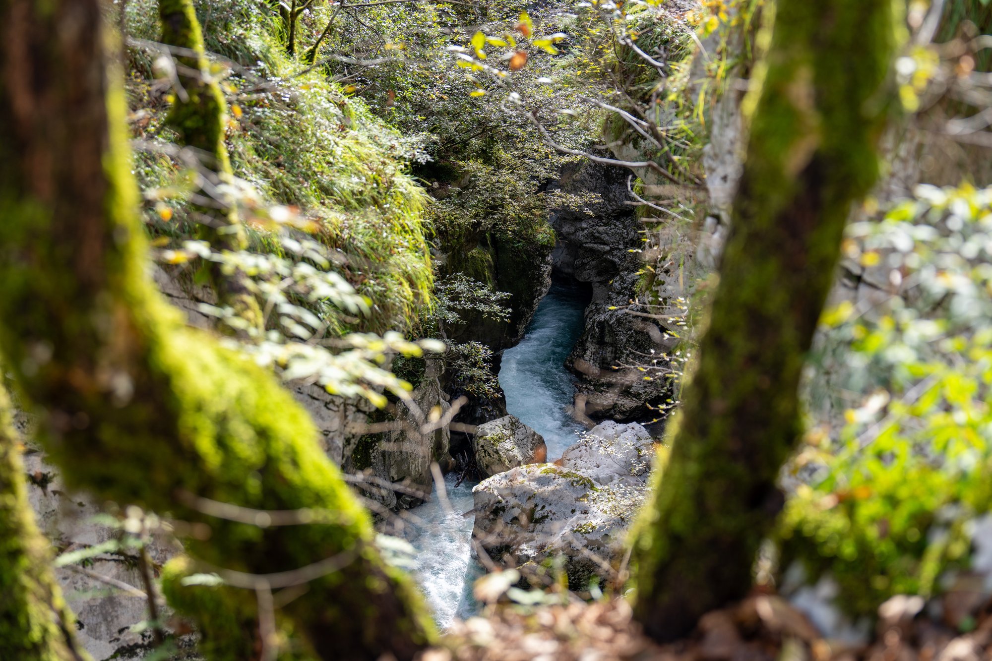 Onze eerste tussenstop tijdens het rijden over de Vršič Pas - alhoewel de Vršič Pas heel officieel pas iets verderop, in Trenta, begint - is de Soča Gorge. Hier wordt het blauwe water van de Soča Rivier door een nauwe, kleine kloof geduwd. Een goede plek om de mooie kleuren van de rivier even goed in je op te nemen!