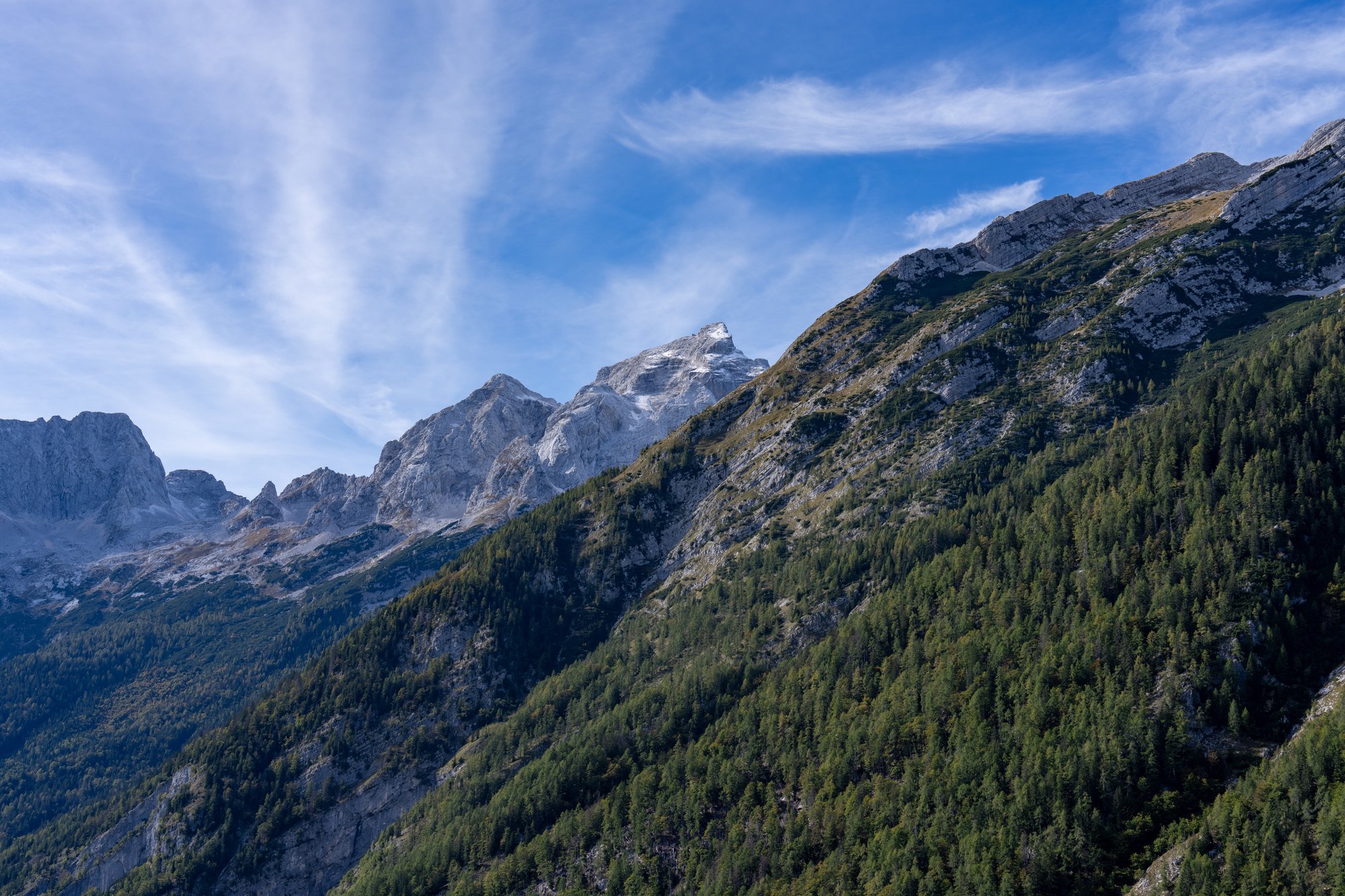 We hebben er al bijna 20 haarspeldbochten op zitten als we bij het Supca Viewpoint arriveren. Bruno houdt zich kranig op de Vršič Pas. Slow, but steady. Zo kennen we hem! Het is helemaal niet erg om langzaam te rijden, want tussen de begroeiing door vangen we af en toe een glimp op van de majestueuze bergen van het Triglav National Park. Hier wil je niet snel voorbij rijden!