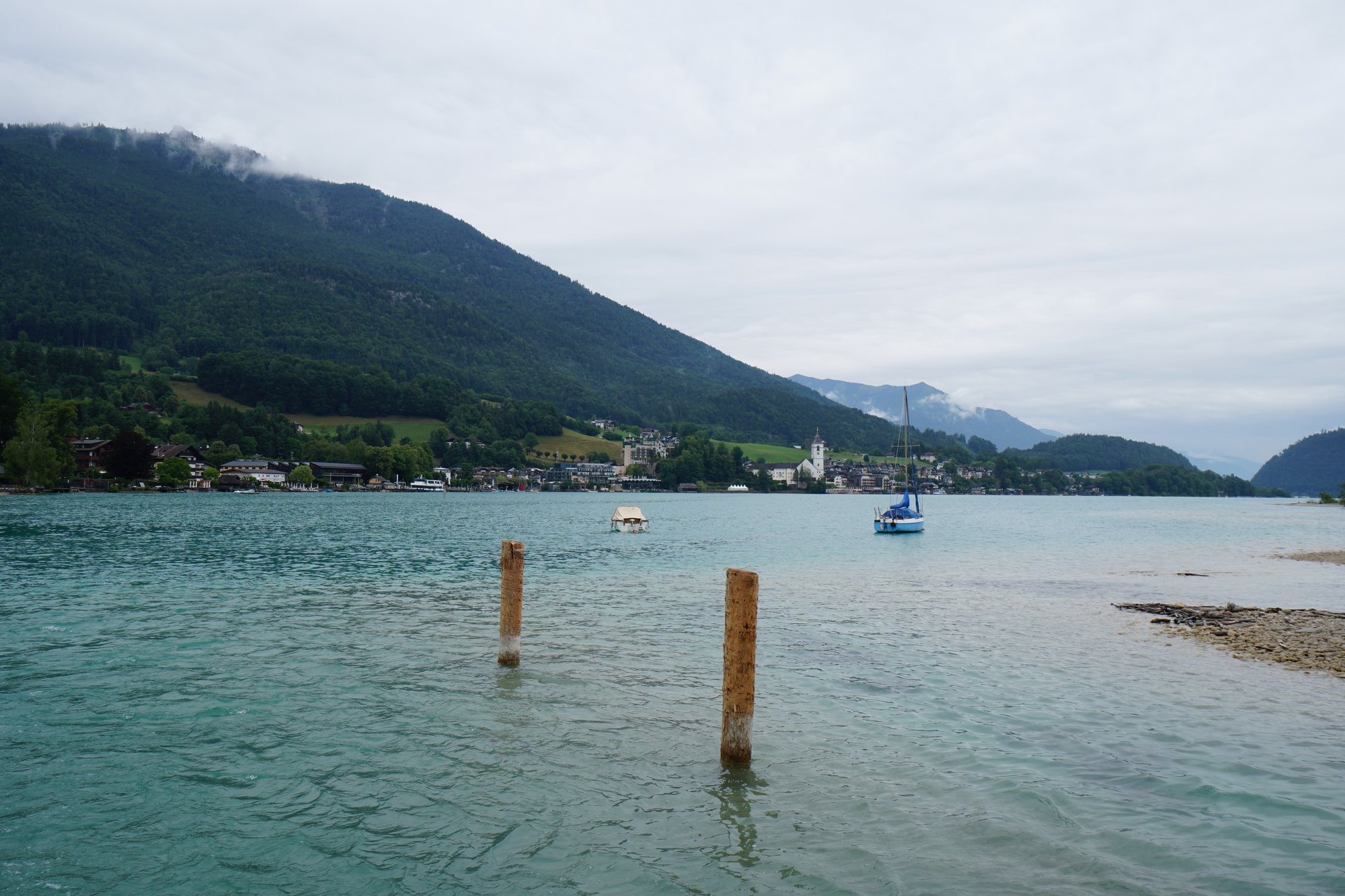 Laten we dan naar het bekendste dorp aan de Wolfgangsee gaan: Sankt Wolfgang. Onze camping ligt zo goed als tegenover dit dorp en na een kort boottochtje staan we aan de overkant. We slenteren door het stadje en turen door onze verrekijker over het meer en naar de bergen tegenover ons. Ondanks het grijze weer is dit een mooie plek!