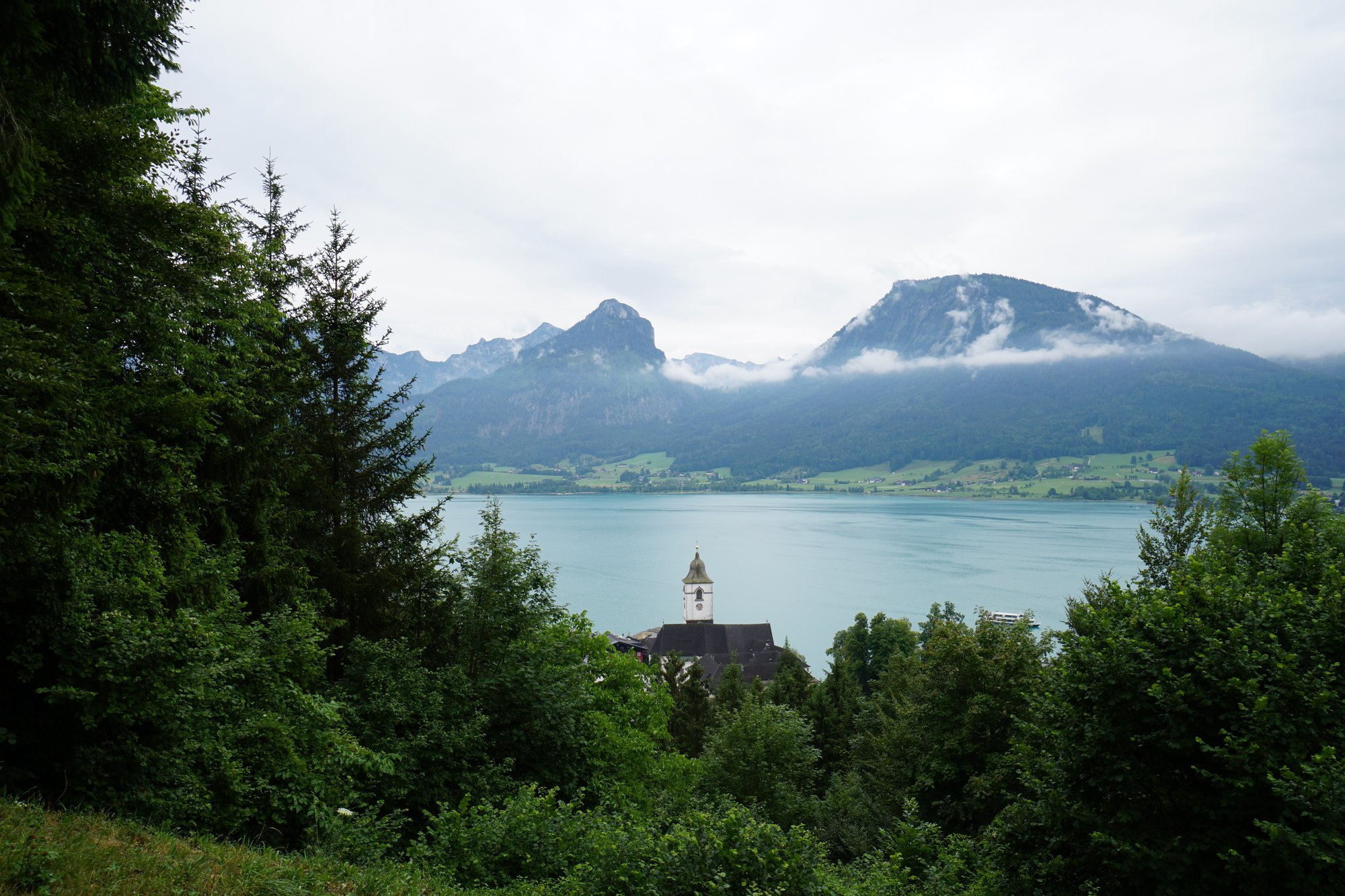 We strijken neer op het terras voor een bakje koffie en ontdekken op maps.me een uitzichtpunt vlakbij het stadje. Vanaf daar kunnen we de Wolfgangsee toch van een hoger gelegen punt bekijken. In nog geen half uur wandelen we naar het kerkje op de Kalvarienberg, wat een geweldig uitzichtpunt blijkt te zijn. We eten op ons gemak kersen terwijl we genieten van deze rustige, mooie locatie met uitzicht op het stadje, het meer en de bergen. Zo zie je maar, er is meer leuks te doen aan de Wolfgangsee dan alleen de Schafbergbahn!