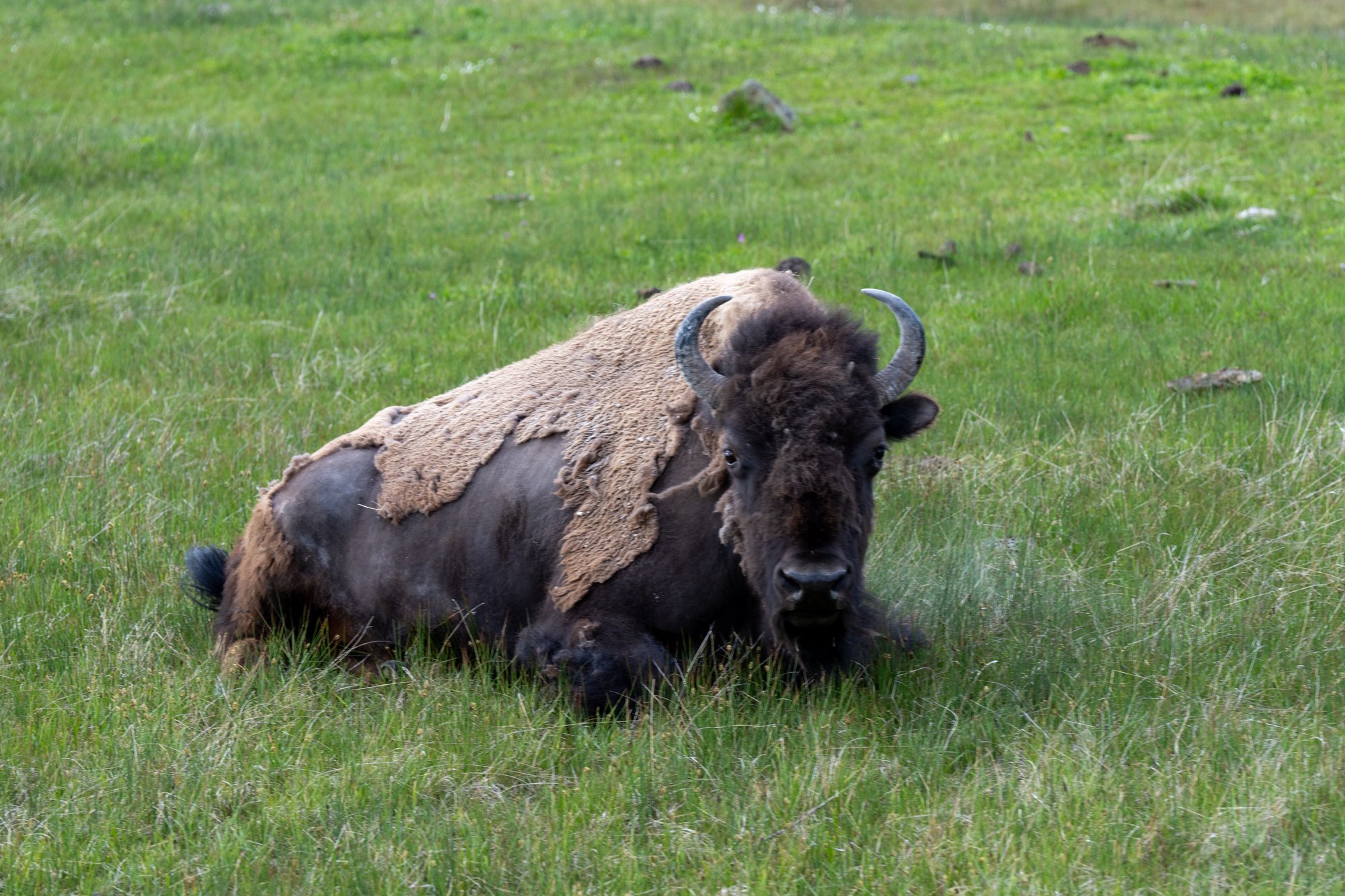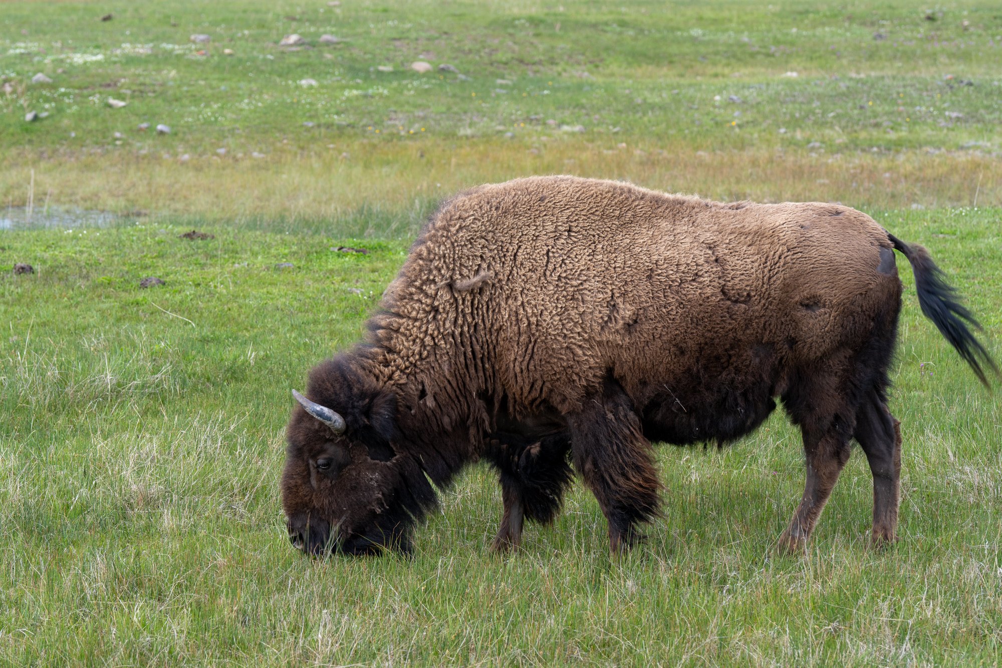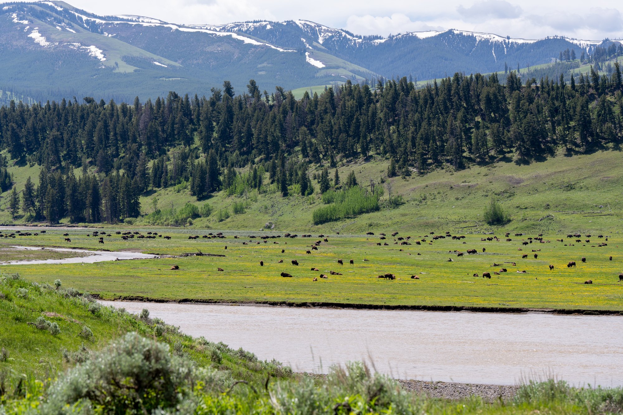 Genoeg hot springs, tijd voor wat anders! De Lamar Valley ligt in het noordoosten van Yellowstone en is natuurschoon van een andere orde. Deze florerende vallei heeft weidse grasvelden met idyllische bloemetjes. Beekjes kronkelen door het landschap en duizenden bizons staan hier heerlijk te grazen. Het is een geweldig gezicht!