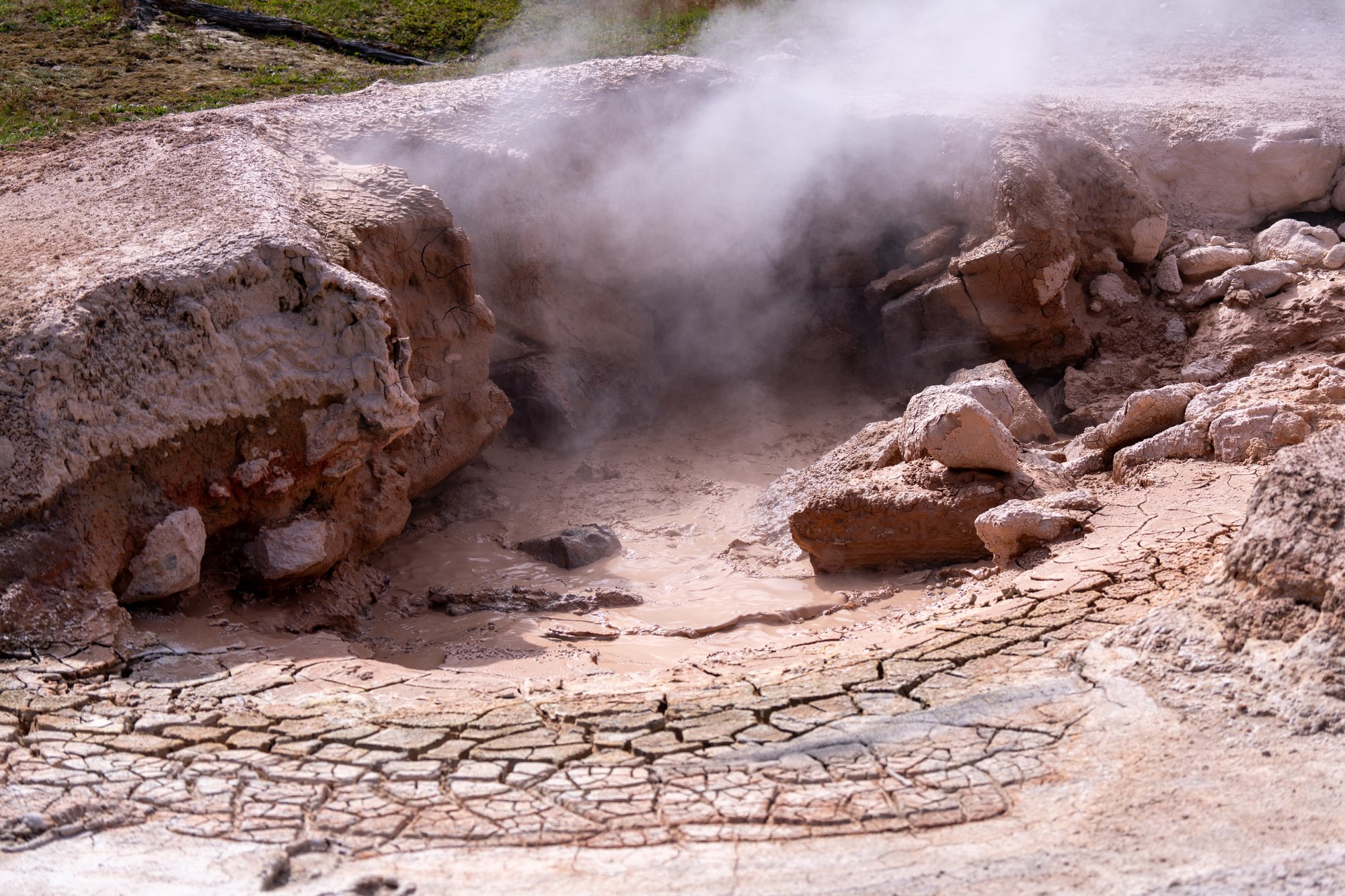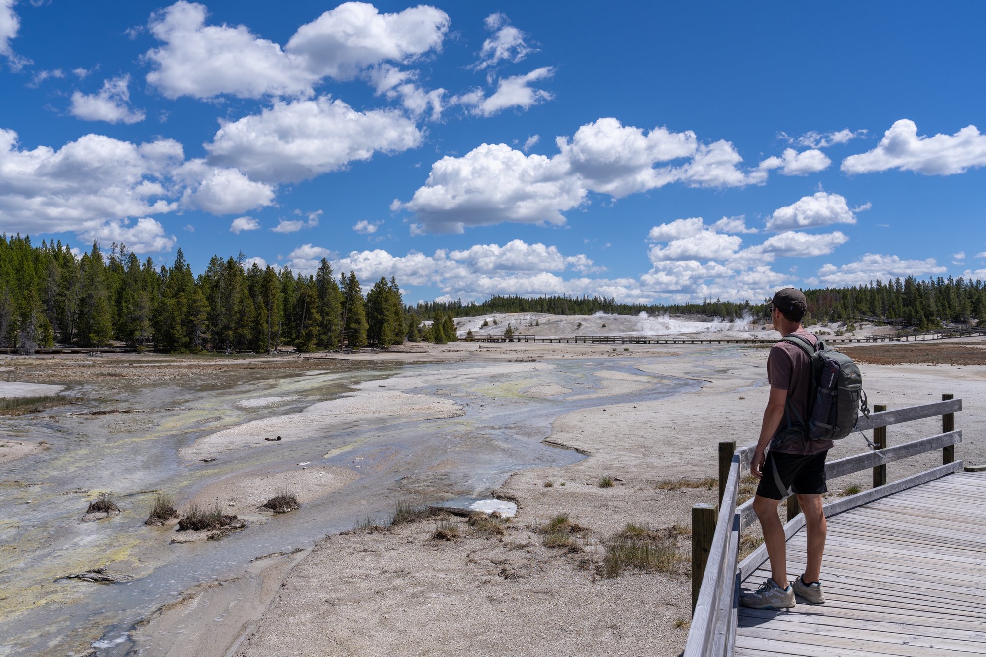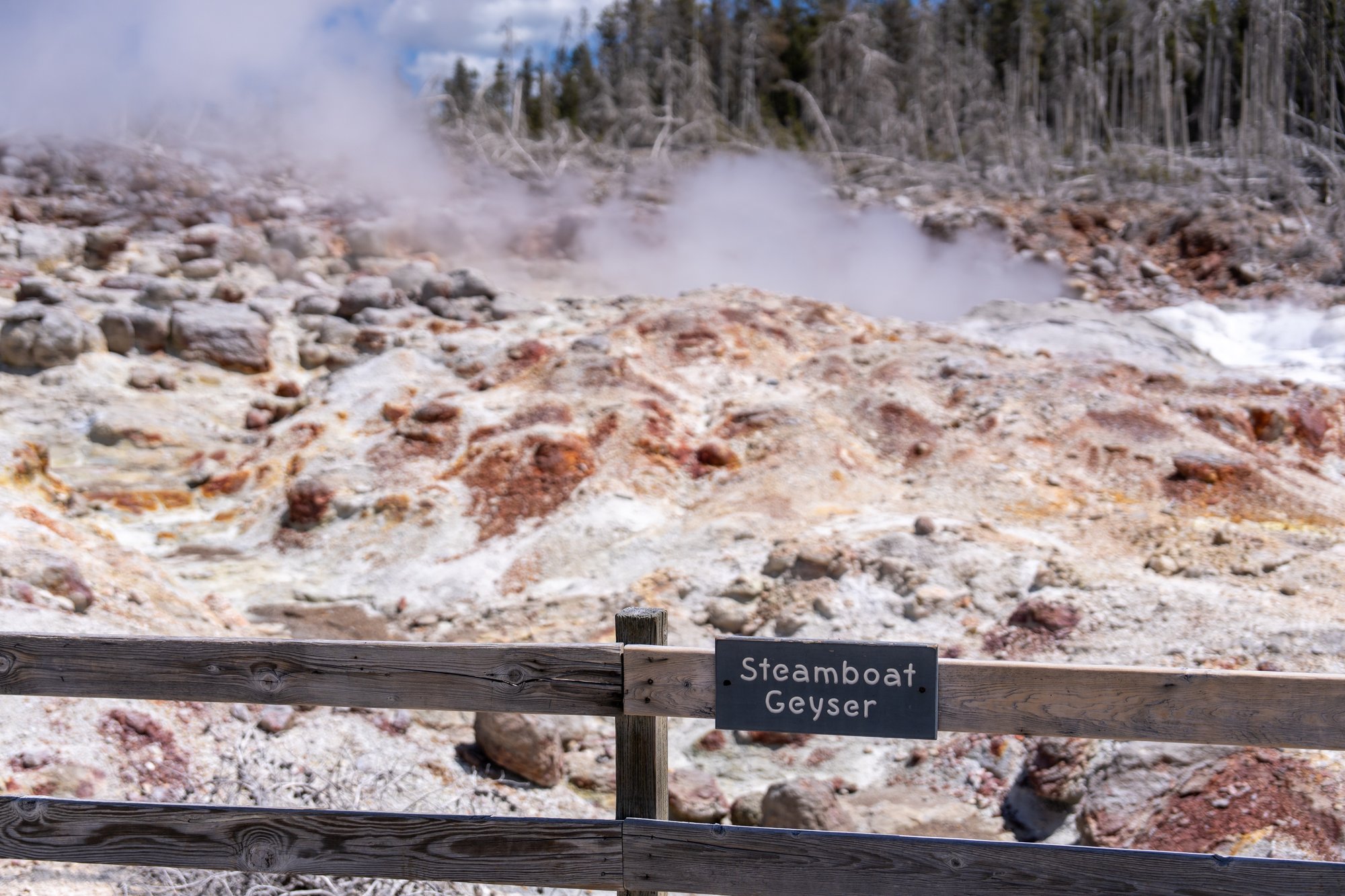 We hebben nog steeds geen genoeg van alle geothermische bronnen en activiteit en dus plakken we er een wandeling door het Back Basin aan vast. De bezienswaardigheden liggen hier wat verder uit elkaar en het is (daardoor?) heerlijk rustig op de vlonderpaden. Al vrij snel komen we langs Steamboat Geyser en we zijn gefascineerd door wat we lezen op de informatieborden. Dit is de hoogste actieve geiser ter wereld. Hij kan tot wel 91 meter hoog spuiten! Iets wat we graag zouden meemaken, maar er is geen peil op te trekken wanneer deze geiser uitbarst. De ene keer zitten er enkele dagen tussen een uitbarsting en de andere keer wel 50 jaar. Op een bordje zien we het moment van de laatste uitbarsting: een week geleden. Dat was wel midden in de nacht, maar toch. Het kan je altijd gebeuren dat je bij deze geiser staat en hij ineens uitbarst. Wat een schouwspel moet dat zijn!
