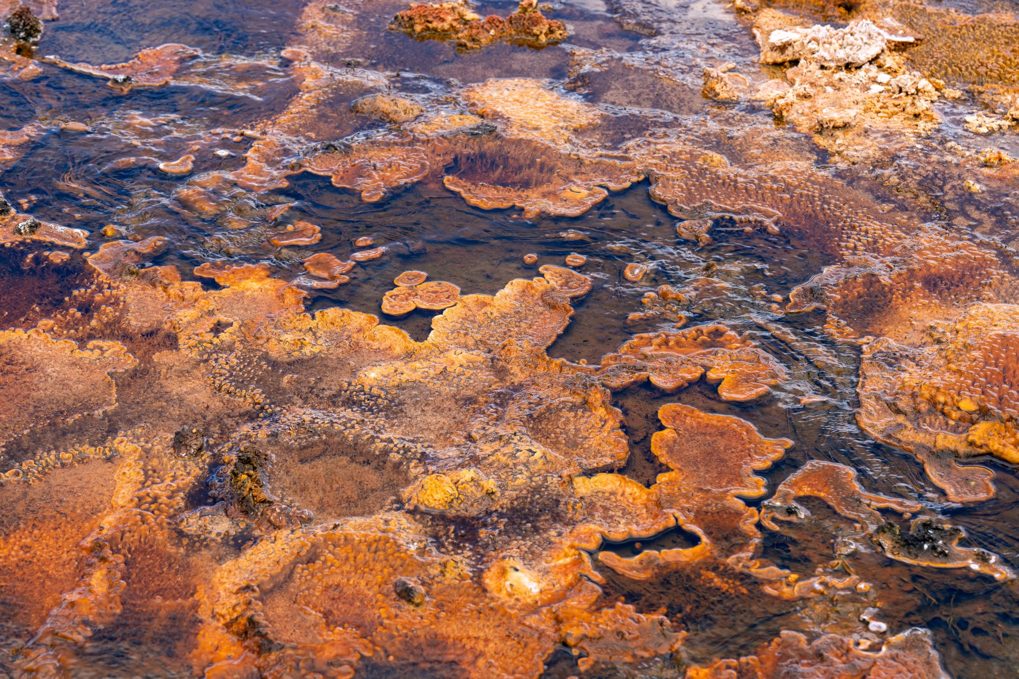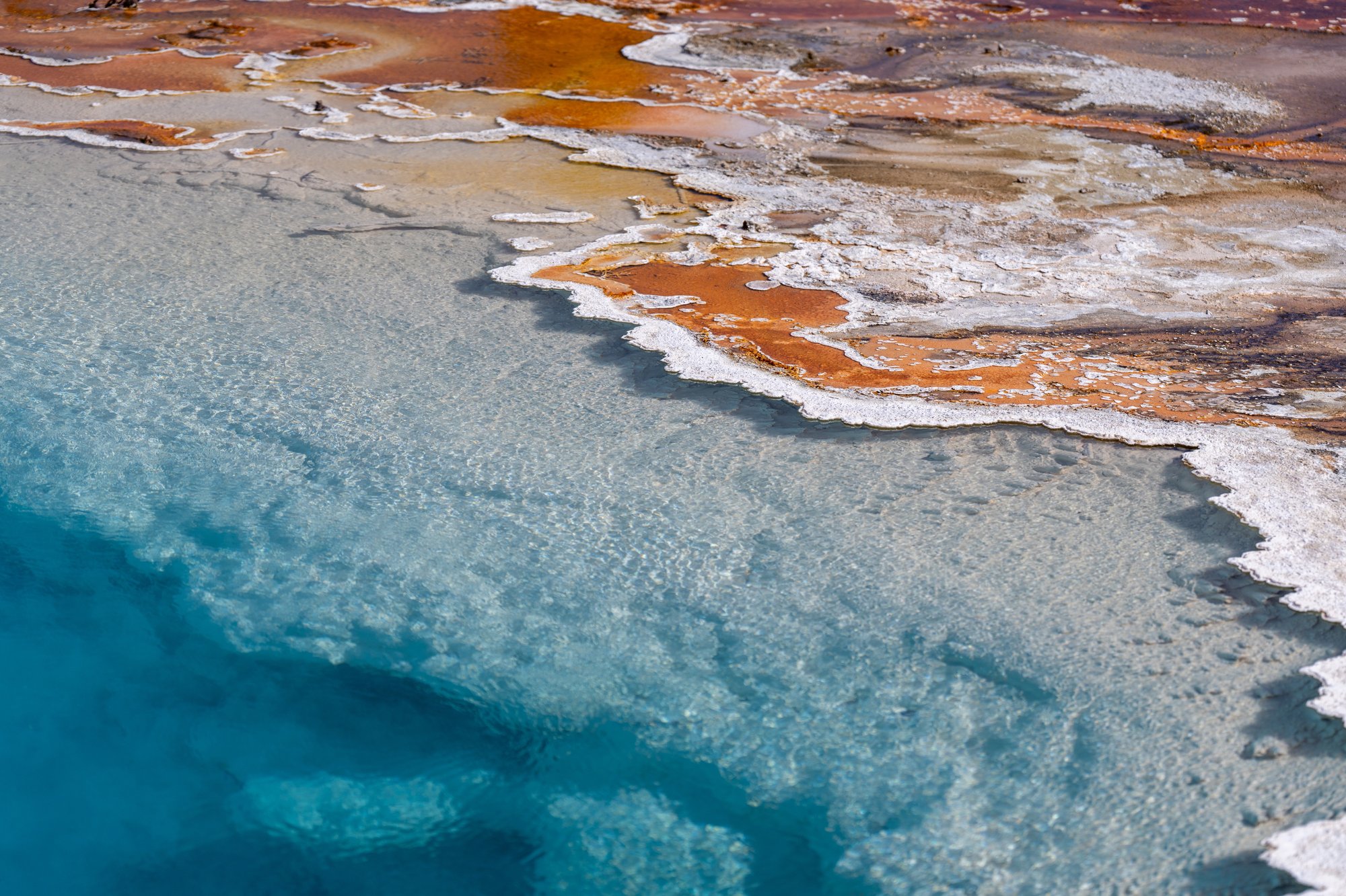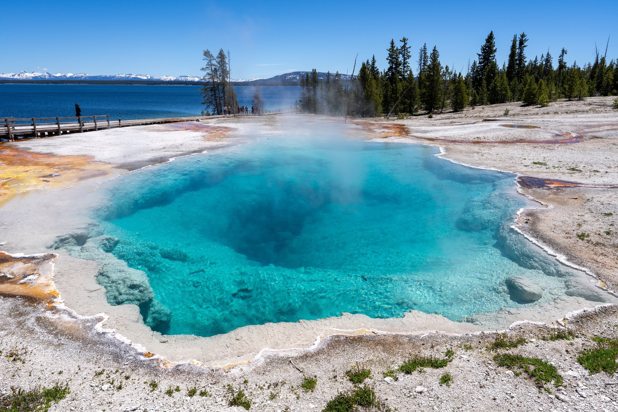 Als je vanaf het zuiden (vanaf Grand Teton) naar Yellowstone rijdt, dan kom je als eerste bij het West Thumb Geyser Basin. Er komt overal stoom uit de aarde en de warmwaterbronnen borrelen. Black Pool is duidelijk onze favoriet in dit bassin. De kleur van het water is felblauw en aan de randen zie je de oranje kleuren van alle micro-organismen. De kleuren spatten! Waarom deze hot spring dan juist Black Pool heet is ons wel een raadsel…