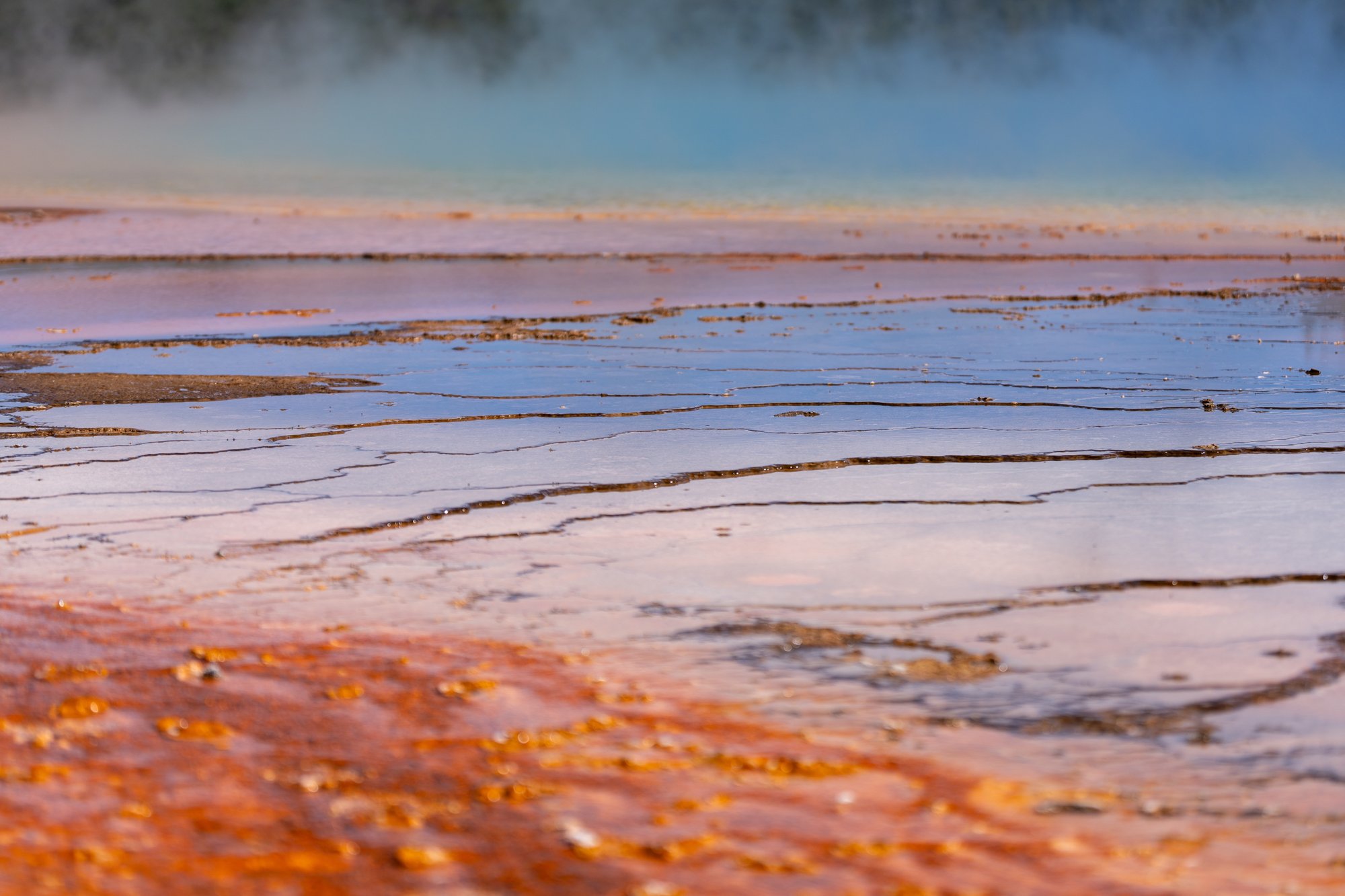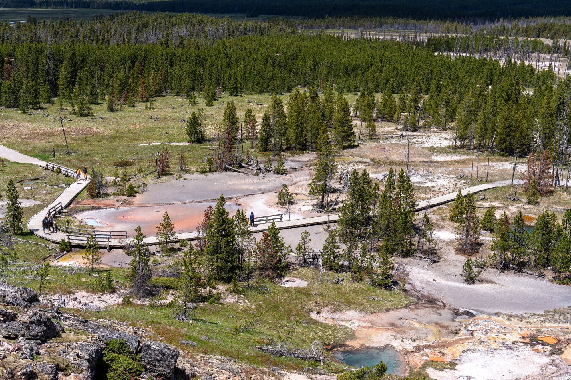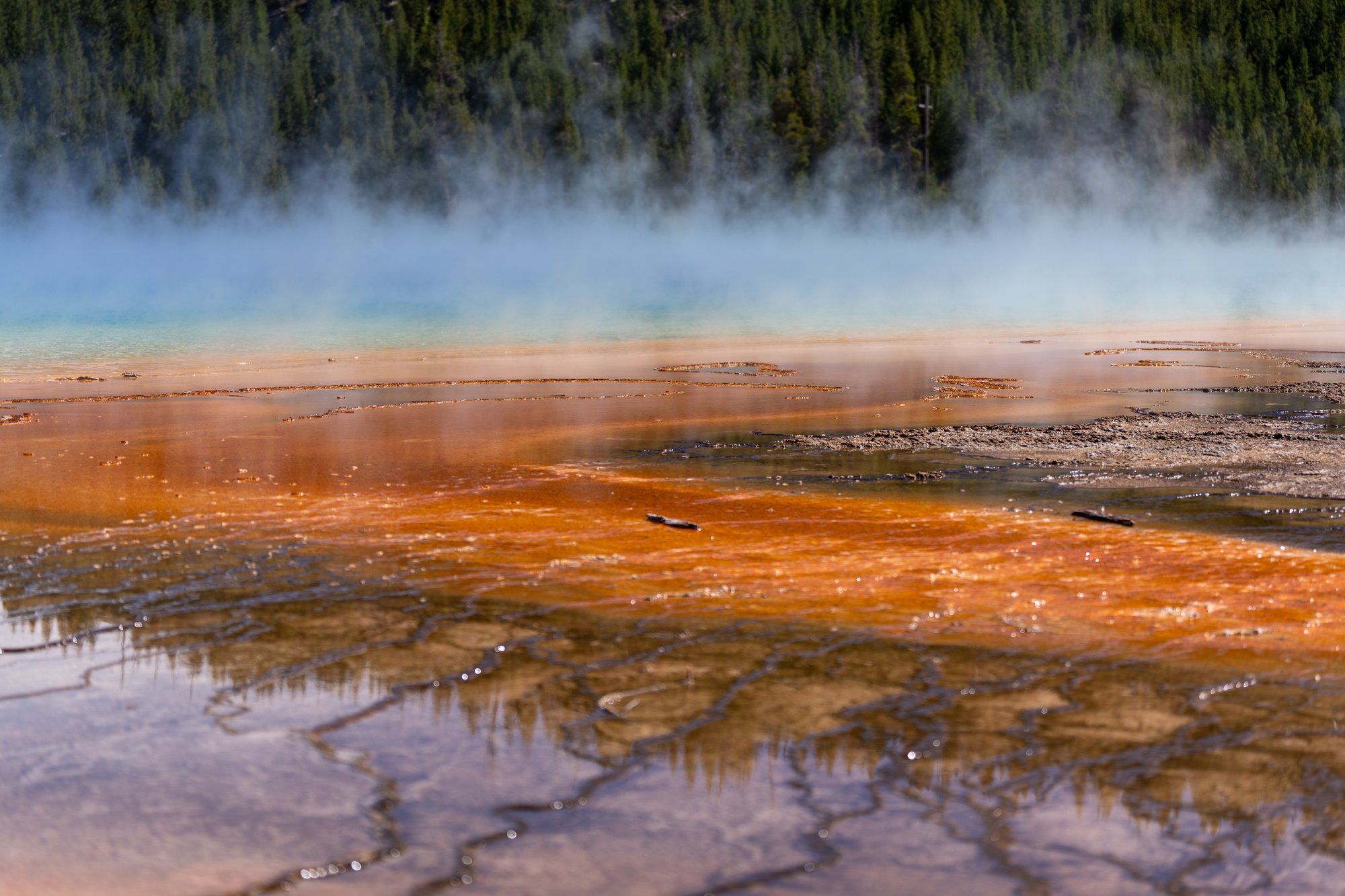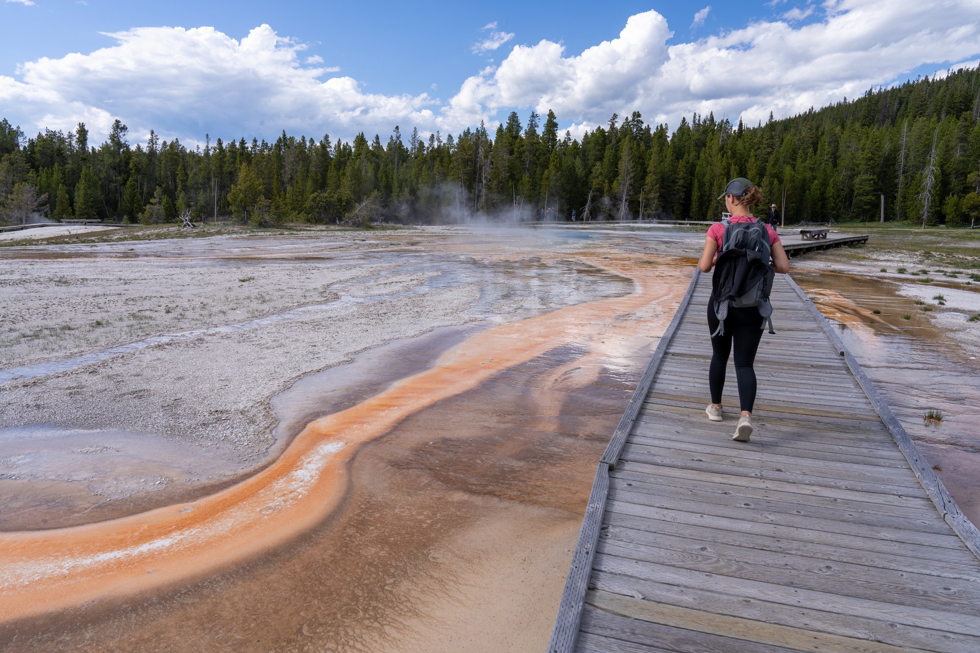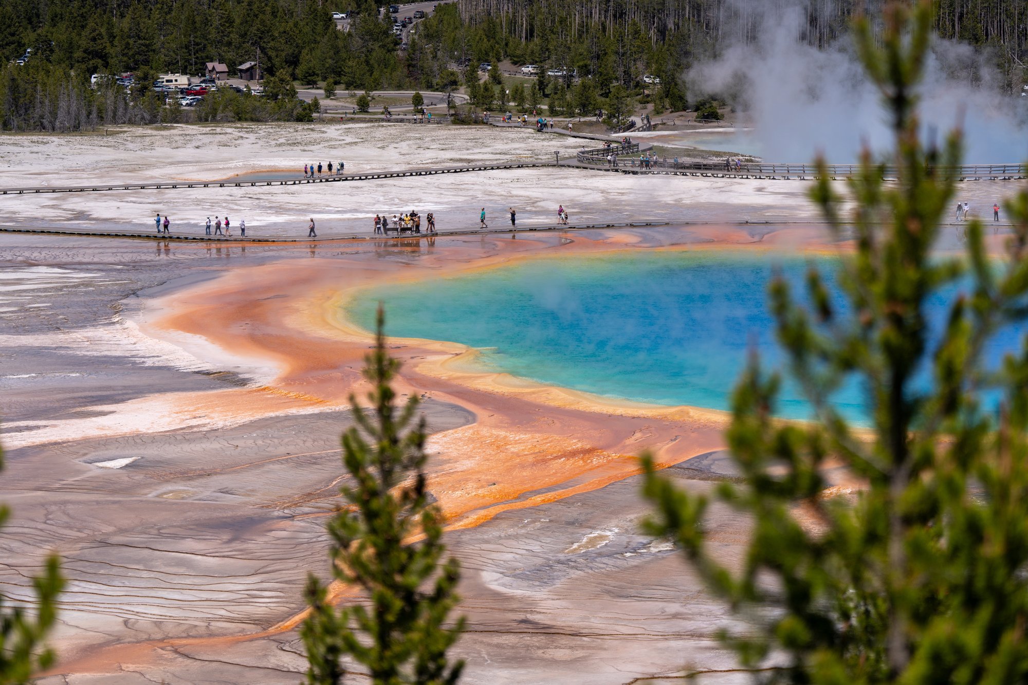 Wij vonden het wandelen over de vlonderpaden van het Midway Geyser Basin - het bassin waar de Grand Prismatic Spring in ligt - trouwens iets minder geslaagd. Het is een crime om hier een parkeerplek te bemachtigen en het is zo druk op de smalle vlonderpaden dat je hier niet op je gemak kunt kijken. Je voelt je al snel in de weg staan voor anderen. Daarnaast komen de kleuren veel minder goed over dan vanaf het uitzichtpunt. Wat ons betreft kun je jezelf dus prima het parkeergedoe bij het Midway Geyser Basin besparen en enkel de Overlook doen om de Grand Prismatic Spring te bewonderen.