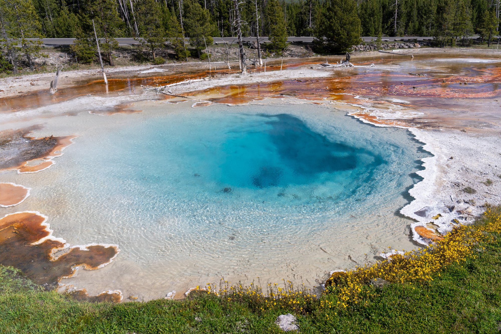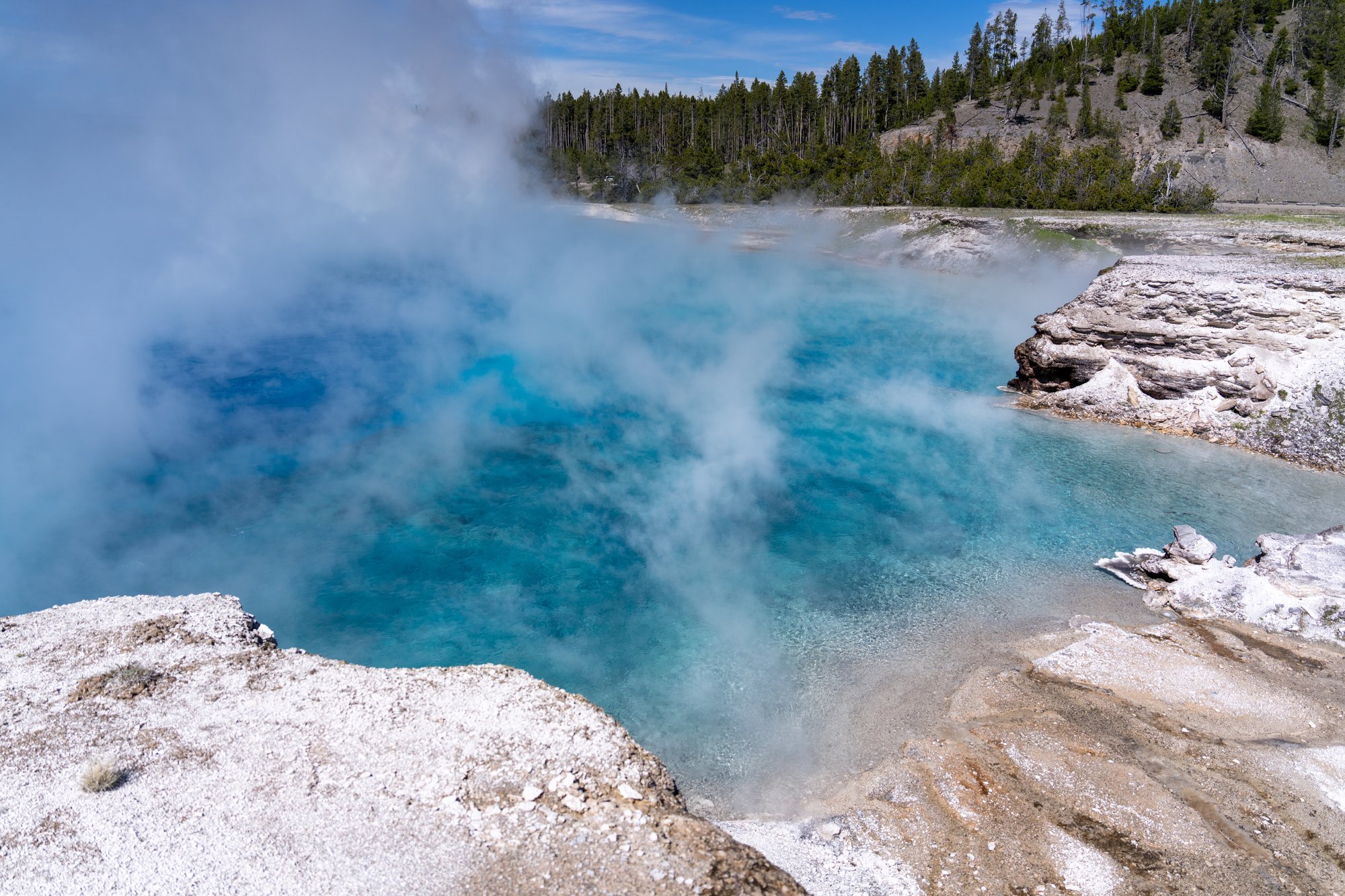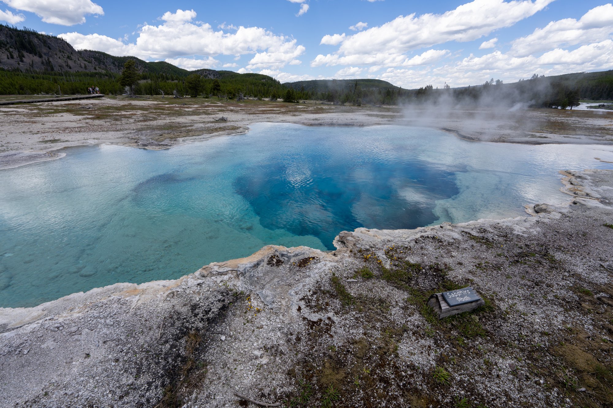 Onlangs is Biscuit Basin veel in het nieuws geweest. Er is namelijk een grote uitbarsting geweest van één van de hot springs in dit bassin. Gelukkig is er niemand gewond geraakt, maar het vlonderpad in het bassin is wel beschadigd en daarom is deze plek nu dicht. Maar als Biscuit Basin weer opent, dan wil je in ieder geval een kijkje nemen bij Sapphire Pool. Door de diepblauwe kleur van deze hot spring is dit echt een eyecatcher!