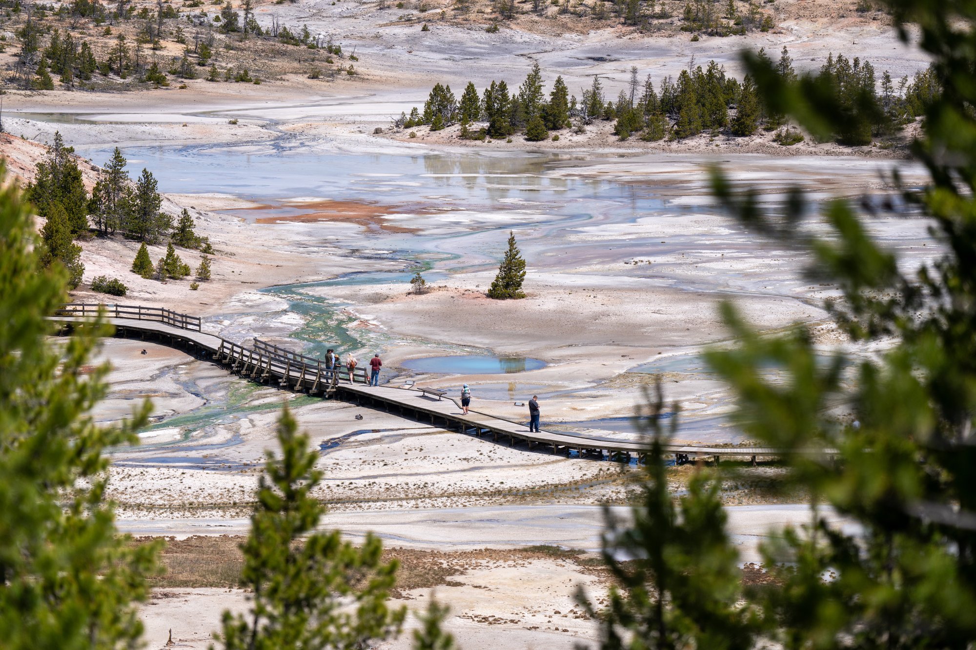 Vlak bij het Norris Geyser Basin ligt Artists Paintpots. Via een korte wandeling kun je naar boven lopen en krijg je uitzicht op alle geothermische activiteit beneden je. Dan snap je meteen waar de naam van deze bezienswaardigheid vandaan komt. Met alle kleuren en poelen is dit net een schilderspalet.