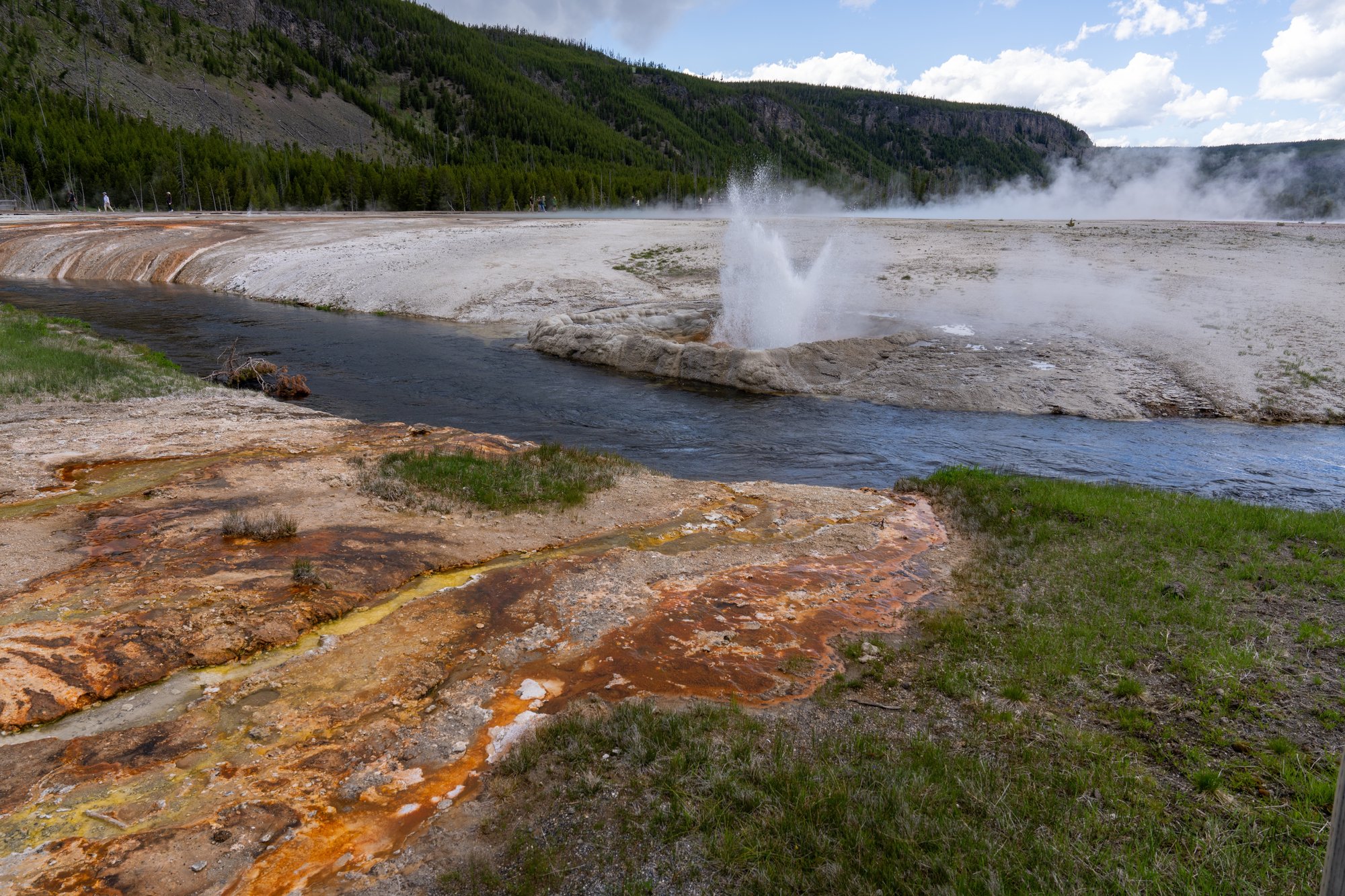 En zo zijn er nog veel meer geiser bassins in dit deel van Yellowstone National Park, waarvan de Black Sand Geyser Basin er één is. Als wij aan onze wandeling bij deze bezienswaardigheid beginnen, heet de Cliff Geyser die direct achter de rivier ligt ons welkom door gelijk te gaan spuiten. Onze favoriete plek in het Black Sand Geyser Basin is Emerald Pool.