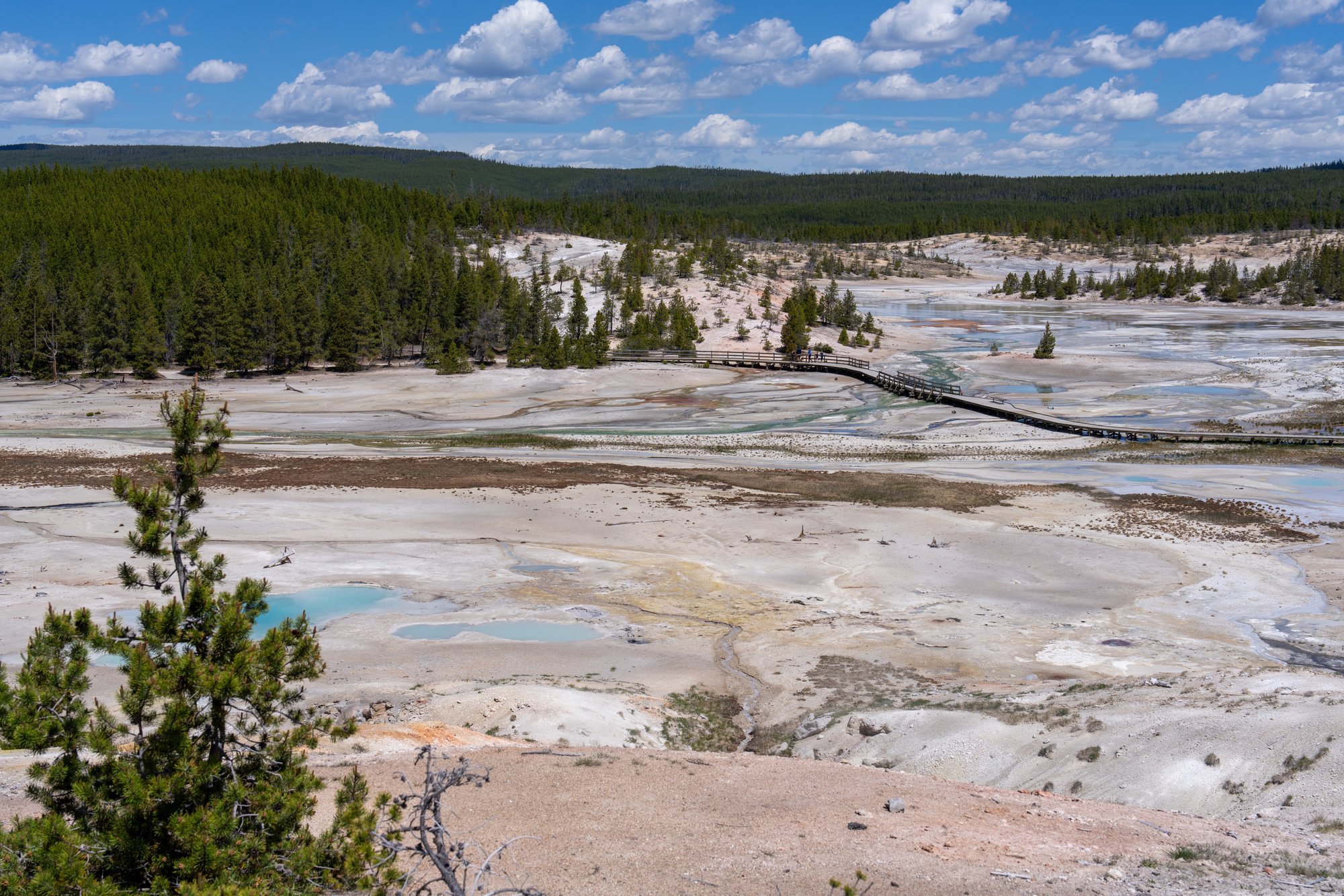 Op onze tweede dag in Yellowstone besteden we veel tijd in het Norris Geyser Basin. Je hebt hier twee rondes: Porcelain Basin van 1,5 kilometer en Back Basin van 2,5 kilometer. Wij beginnen met een rondje door Porcelain Basin en zijn bij het begin al aangenaam verrast door het uitzicht. We kijken over een gebied met allerlei kleuren, veel geborrel en stoom die uit de aarde komt.