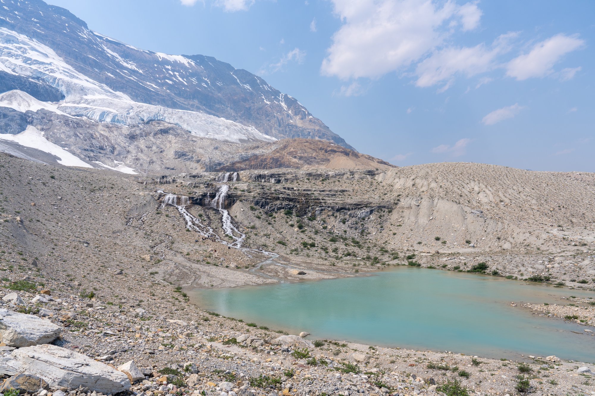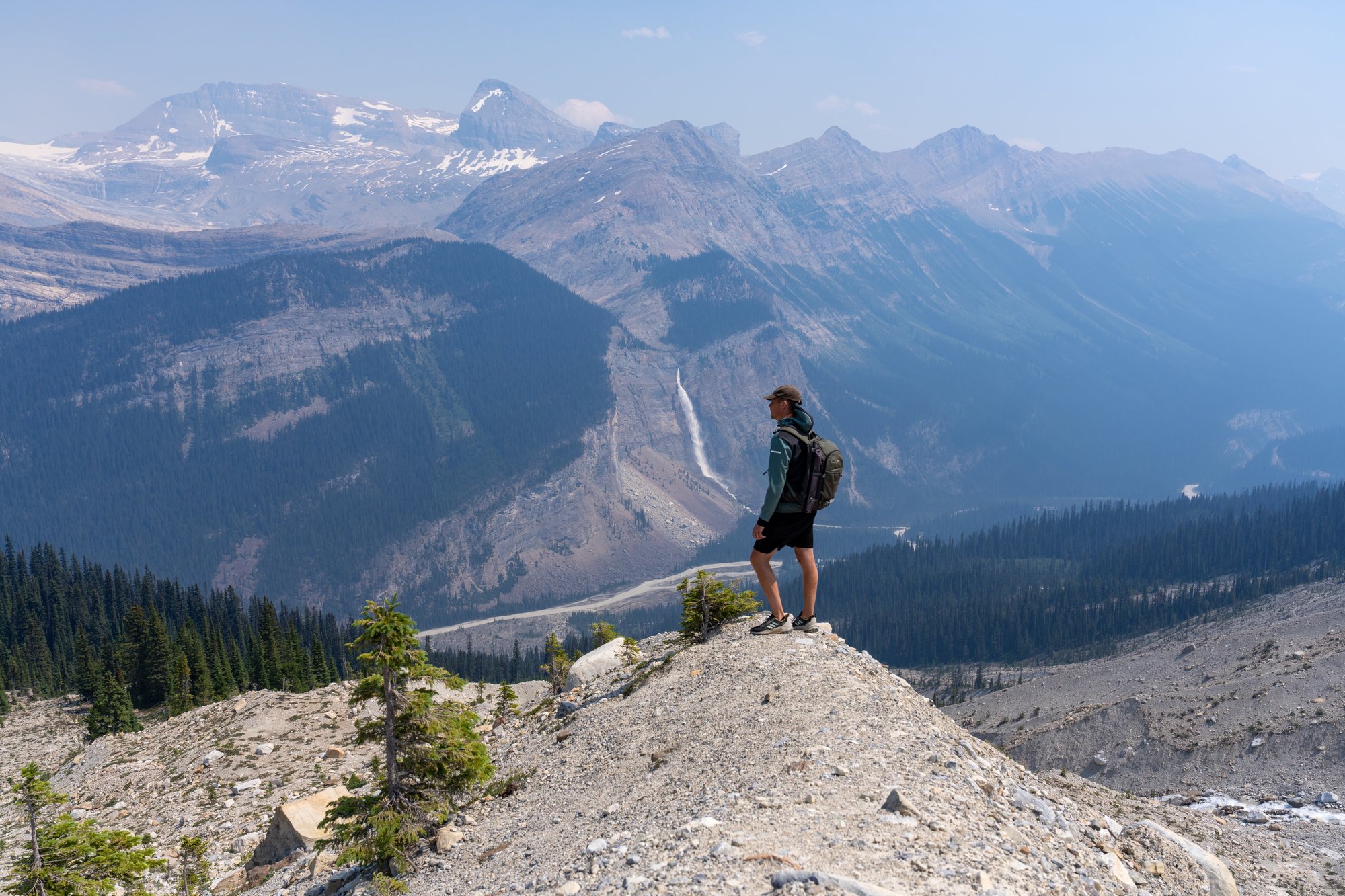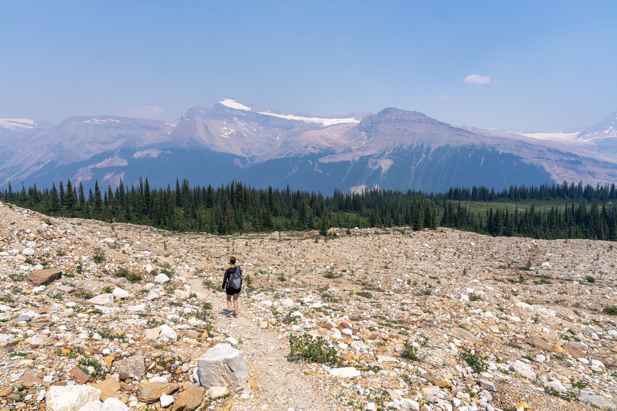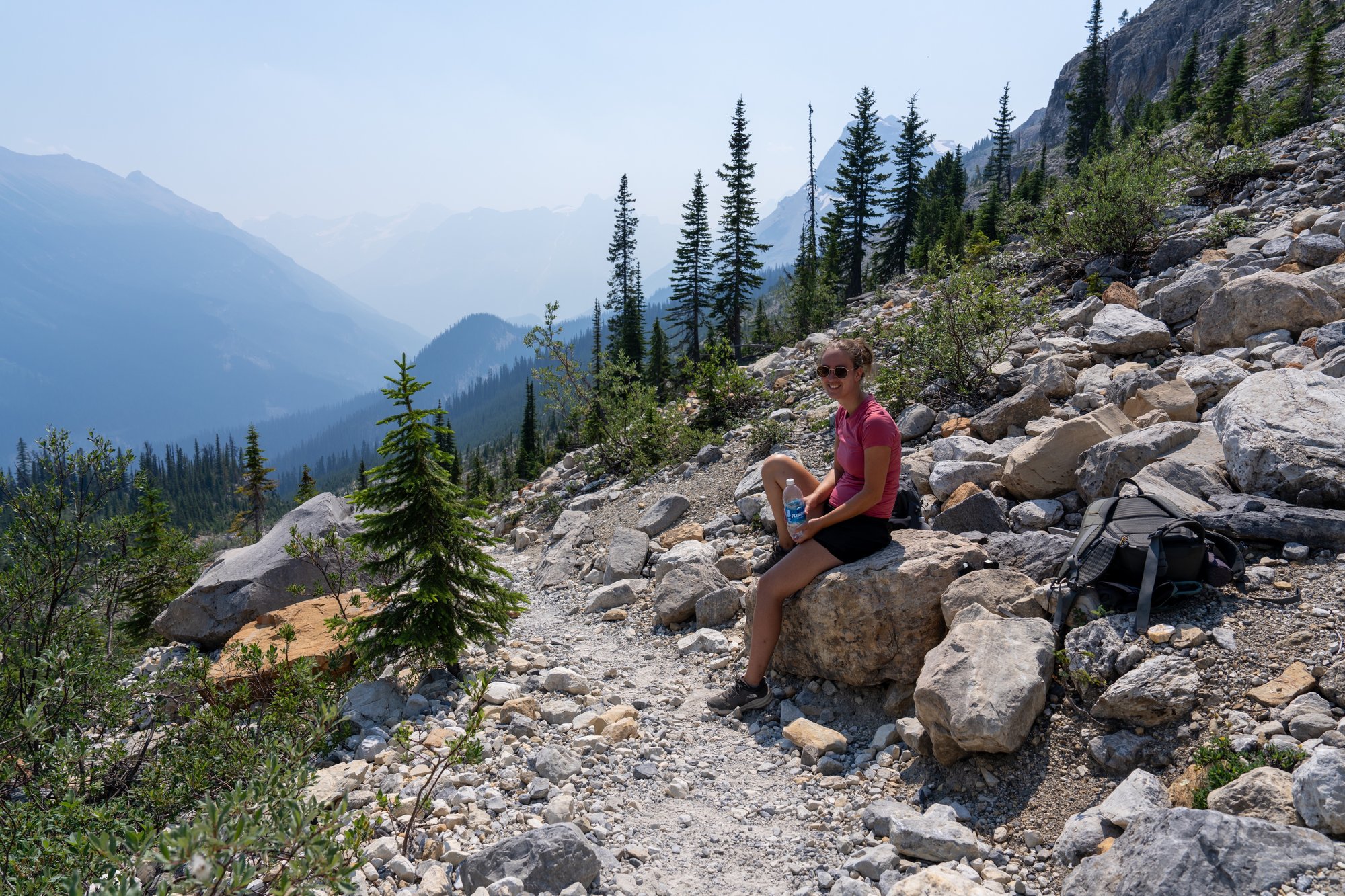 Nu wordt het leuk! Het pad gaat nog wel wat omhoog en omlaag, maar we hebben afleiding van de inspanning, want we lopen pal naast enkele gletsjers. Als we naar rechts kijken, zien we beneden de Yoho Valley liggen en in de verte nog meer gletsjers tussen hoge bergen. Helaas is het zicht - ondanks het zonnige weer - niet goed. Er woeden ontzettend veel bosbranden in de regio en de lucht is niet felblauw, terwijl er geen wolkje aan de lucht is. Het is net alsof er een dikke laag smog hangt. Het uitzicht is nog steeds indrukwekkend, maar ik weet zeker dat het in andere omstandigheden nog veel mooier is.