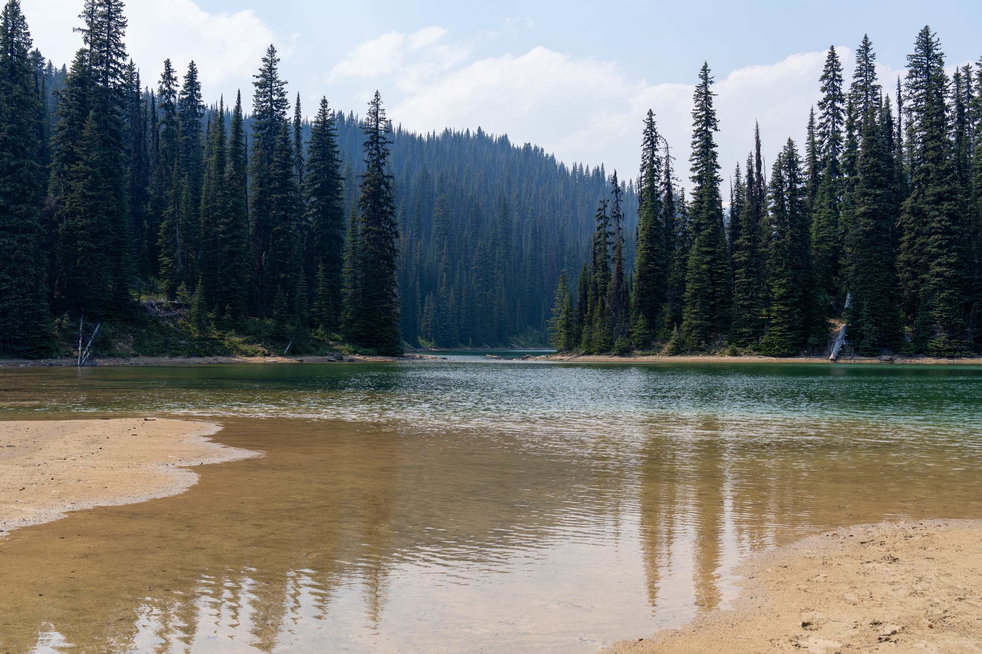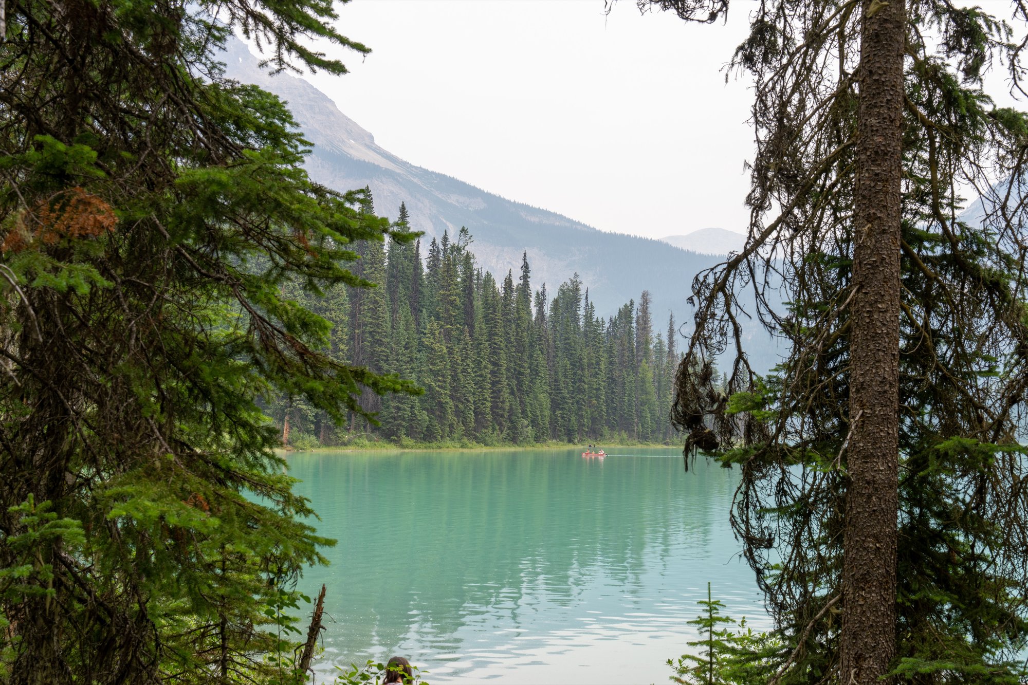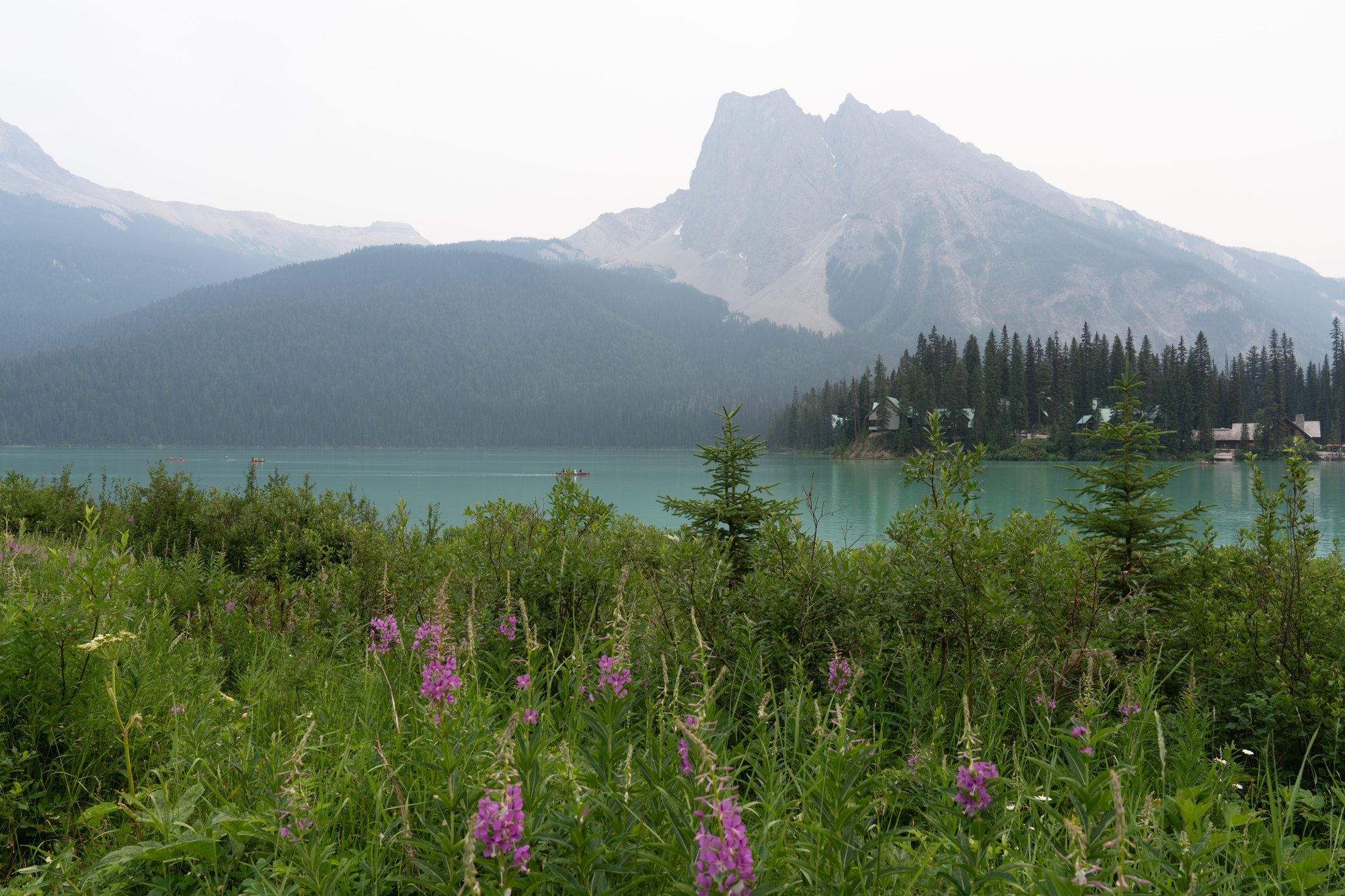 Helaas zien we Emerald Lake lang niet op haar best. Er woeden onwijs veel bosbranden in de regio op het moment dat wij in de Canadese Rocky Mountains zijn en dat is duidelijk te zien. Over het gehele landschap hangt een waas van rook. Zo zonde en verdrietig om te zien hoe zoveel mooie natuur in rook opgaat! We proberen er toch een beetje doorheen te kijken en we zien echt wel dat dit - zeker met helder zicht - een hartstikke mooie plek in Yoho National Park is.