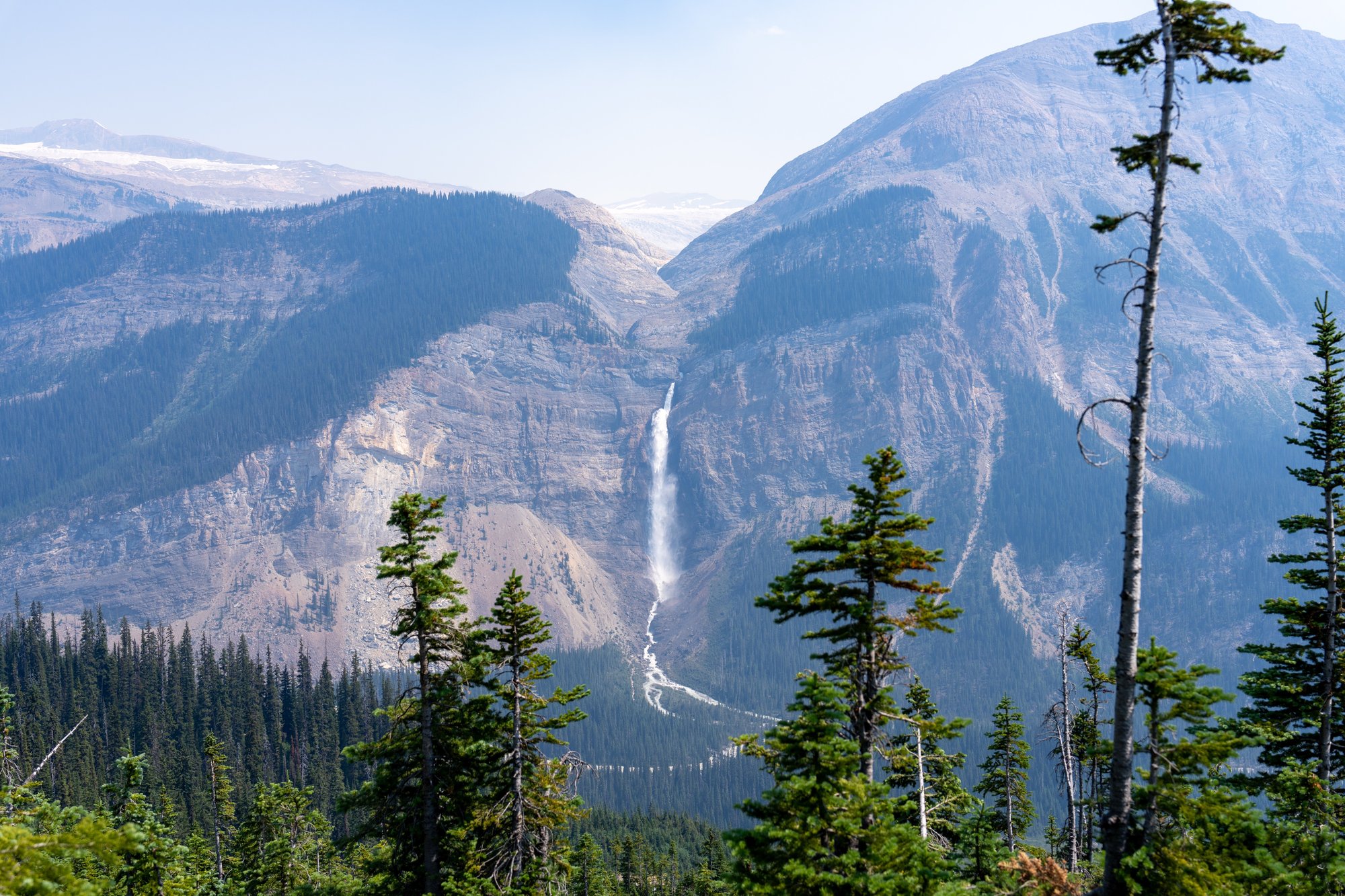 Zodra we vlak bij het Whiskey Jack Hostel de weg zijn overgestoken, begint de Iceline Trail echt en dat voelen we. Omhoog, omhoog, omhoog! Het pad leidt ons door de bossen en zet onze kuiten aan het werk, want het is niet alleen continu stijgend, het is nog steil ook. Af en toe komen we op een open plek en aan de hand van de Takakkaw Falls krijgen we zo een idee van hoeveel we al geklommen hebben.