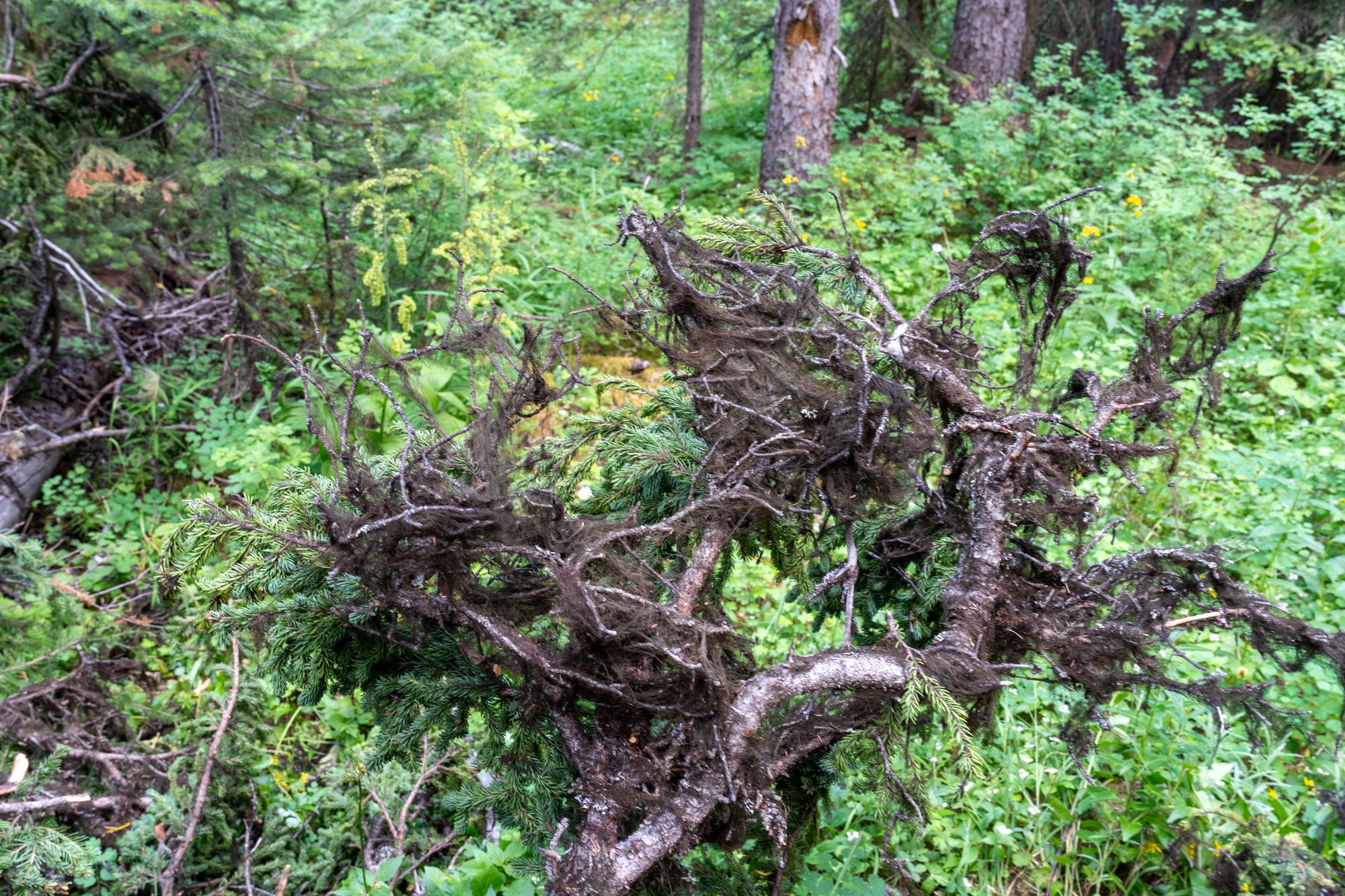 Ook al zien we wel degelijk vooruitgang, het valt ons zwaar vandaag. We merken dat we lang niet meer flink gehiked hebben en voor ons gevoel blijft de klim maar duren. Om dan tussen al dat ploeteren door ook nog geluid te maken om de beren te waarschuwen dat we eraan komen, dat is een extra opgave. Maar aan de plukken berenharen op het pad en in takken te zien, zitten ze hier zeker en dus maken we met ons laatste beetje adem af en toe wat geluiden.