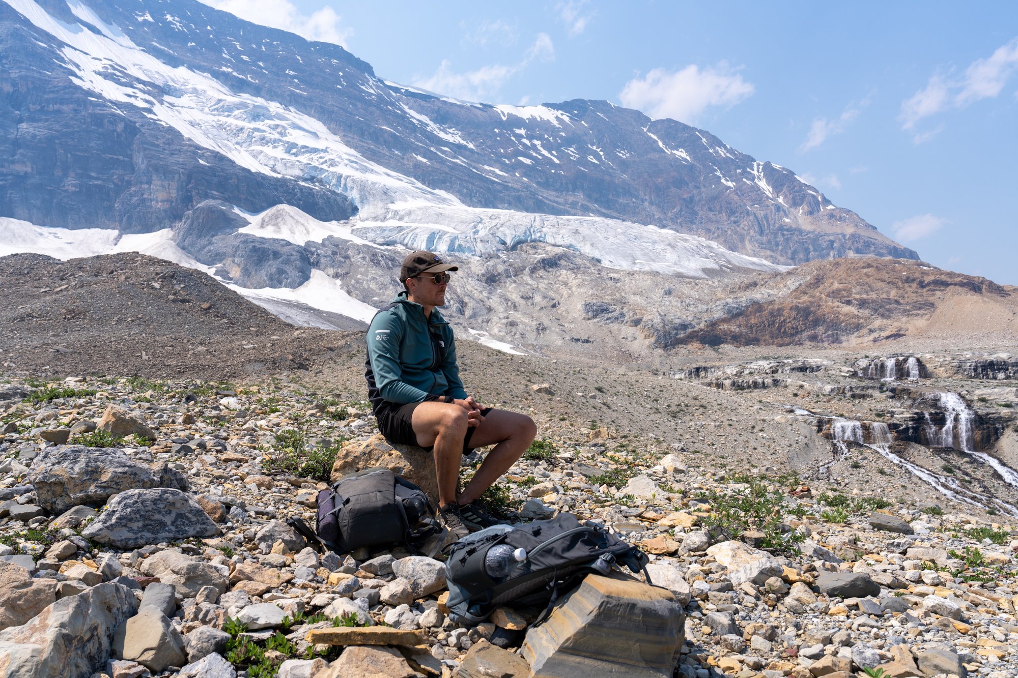 Na een uur maakt de begroeiing plaats voor een rotsachtig landschap. We komen boven de boomgrens, maar dat betekent niet dat er een einde komt aan de klim. We nemen een lunchpauze en pushen onszelf dan tot de top van de volgende klim. En de volgende en de volgende. Totdat we bij de natuurfenomenen komen waar het om draait op de Iceline Trail: gletsjers!