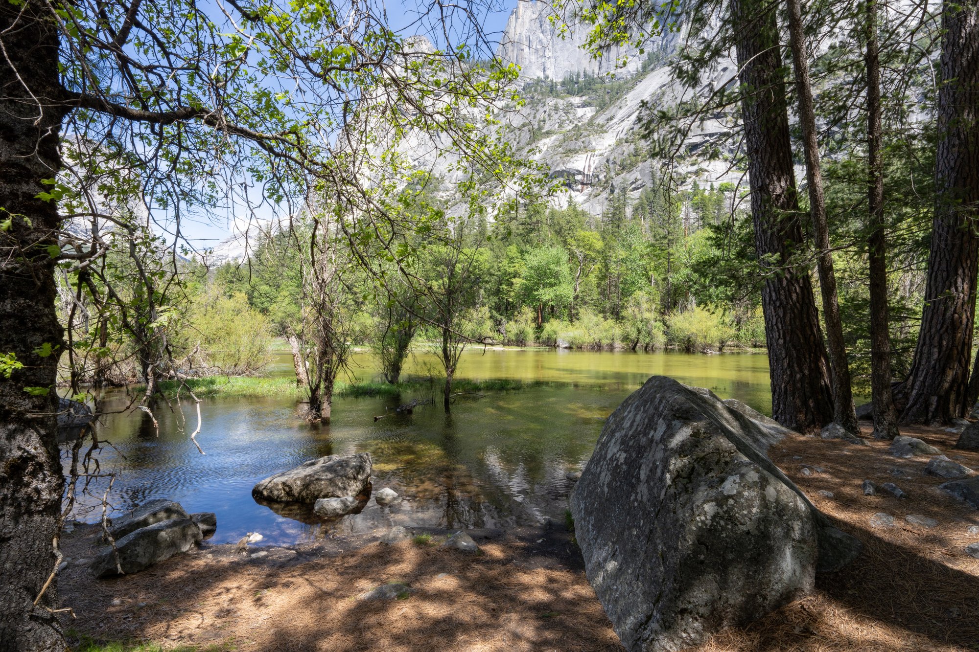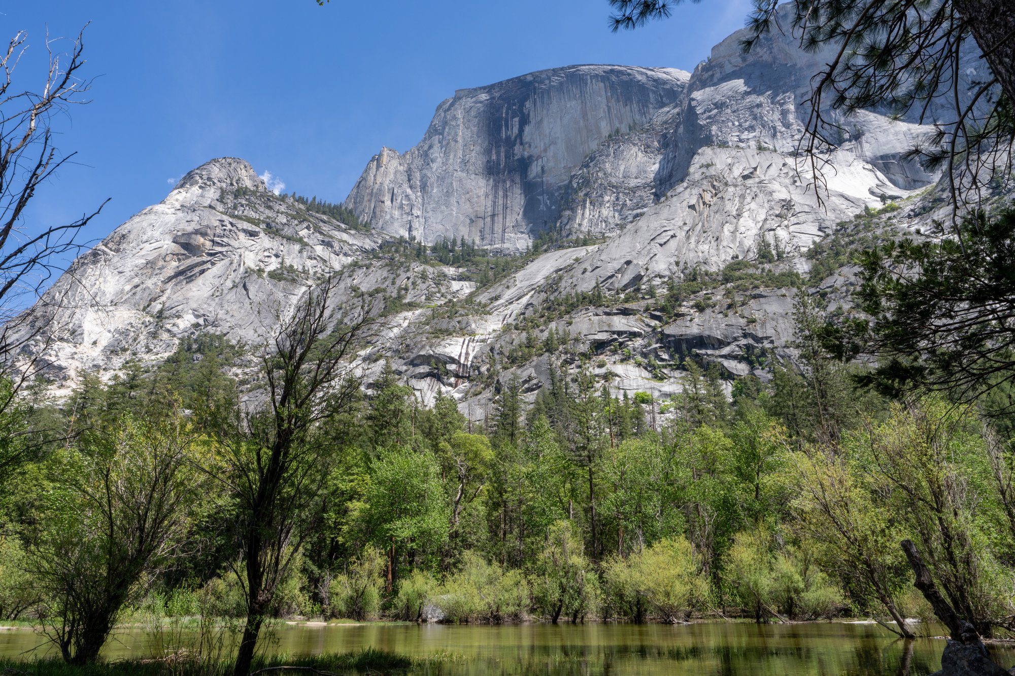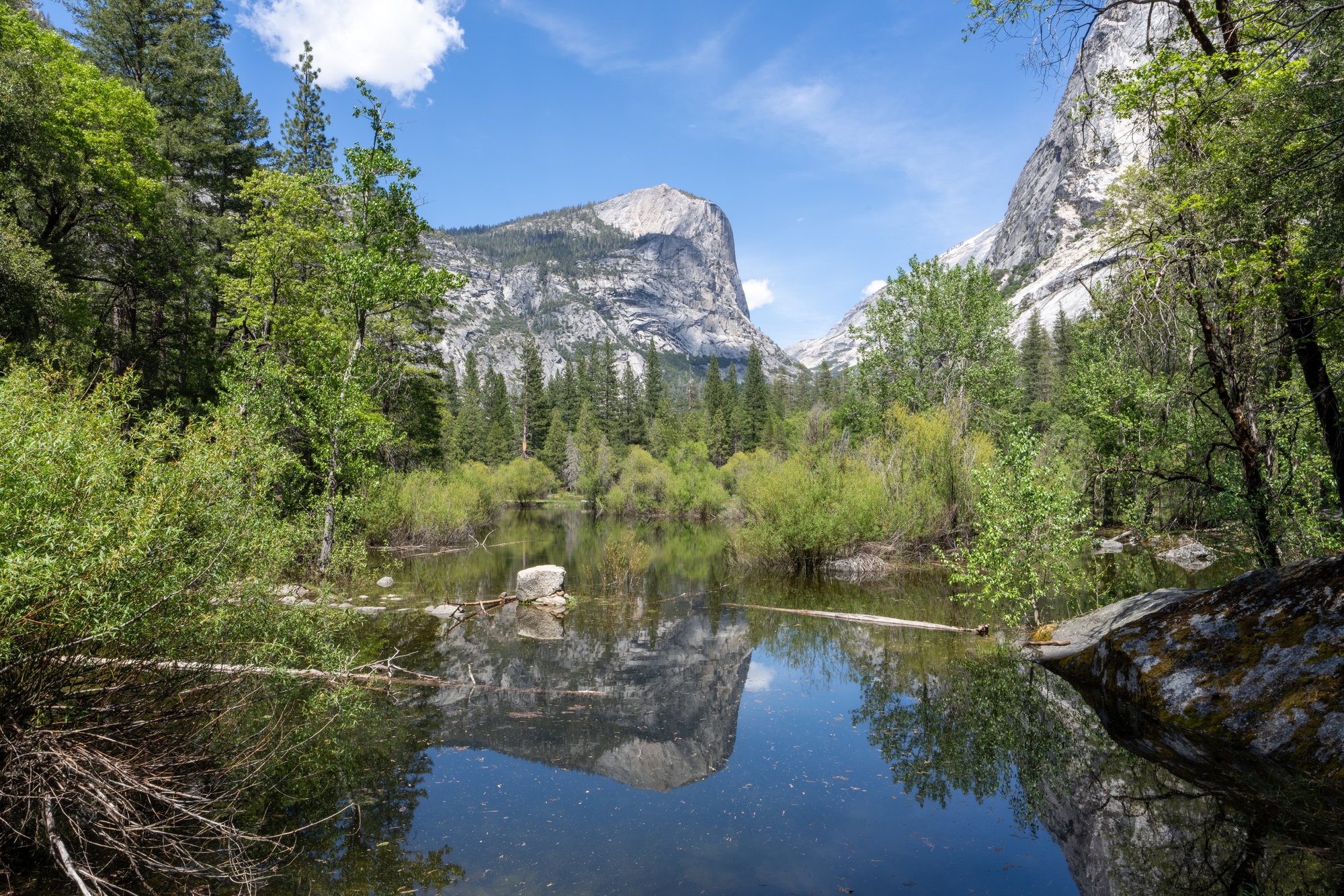 Een wandeling naar Mirror Lake is een aanrader als je ruim in je tijd zit. Dit vlakke pad van 1,5 kilometer (enkele reis, vanaf de shuttle stop) gaat door de bossen en komt uit bij een groot meer. De naam doet vermoeden dat je hier goed de weerspiegeling van de omgeving in het water kunt zien, maar wij hadden dat geluk helaas niet. Toen wij half mei in Yosemite waren, was het volop ‘smeltseizoen’ waardoor alle watervallen en rivieren flink stroomden. Dat betekende geen weerspiegeling in het water helaas, maar alsnog is Mirror Lake een fijne plek om even te relaxen aan het water. Vooral omdat je vanaf de oevers zo’n geweldig zicht hebt op de noordkant van Half Dome, die vanaf hier zo’n 1.400 meter de lucht in rijst.