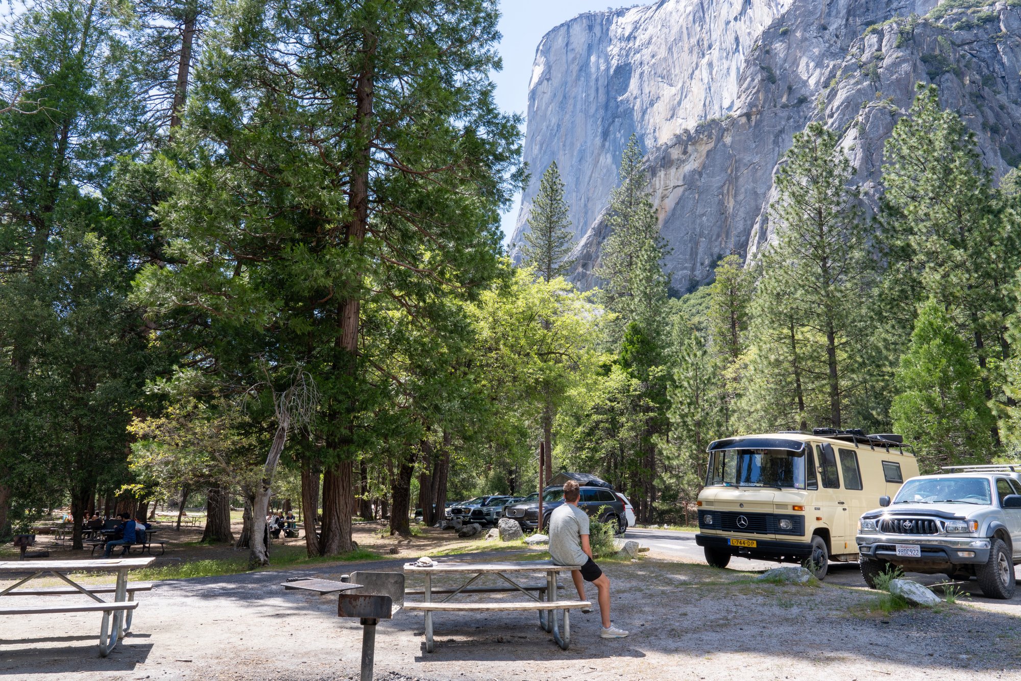 Het is erg leuk om hier een koffietje te drinken, te turen door onze verrekijker naar klimmers aan de wand en ons in te denken dat hier gewoon een klimmer zonder touwen naar boven is geklommen. Ongelooflijk! El Capitan is een bergwand waar we diep ontzag voor hebben en het is heel gaaf om hier nu zelf te zijn.