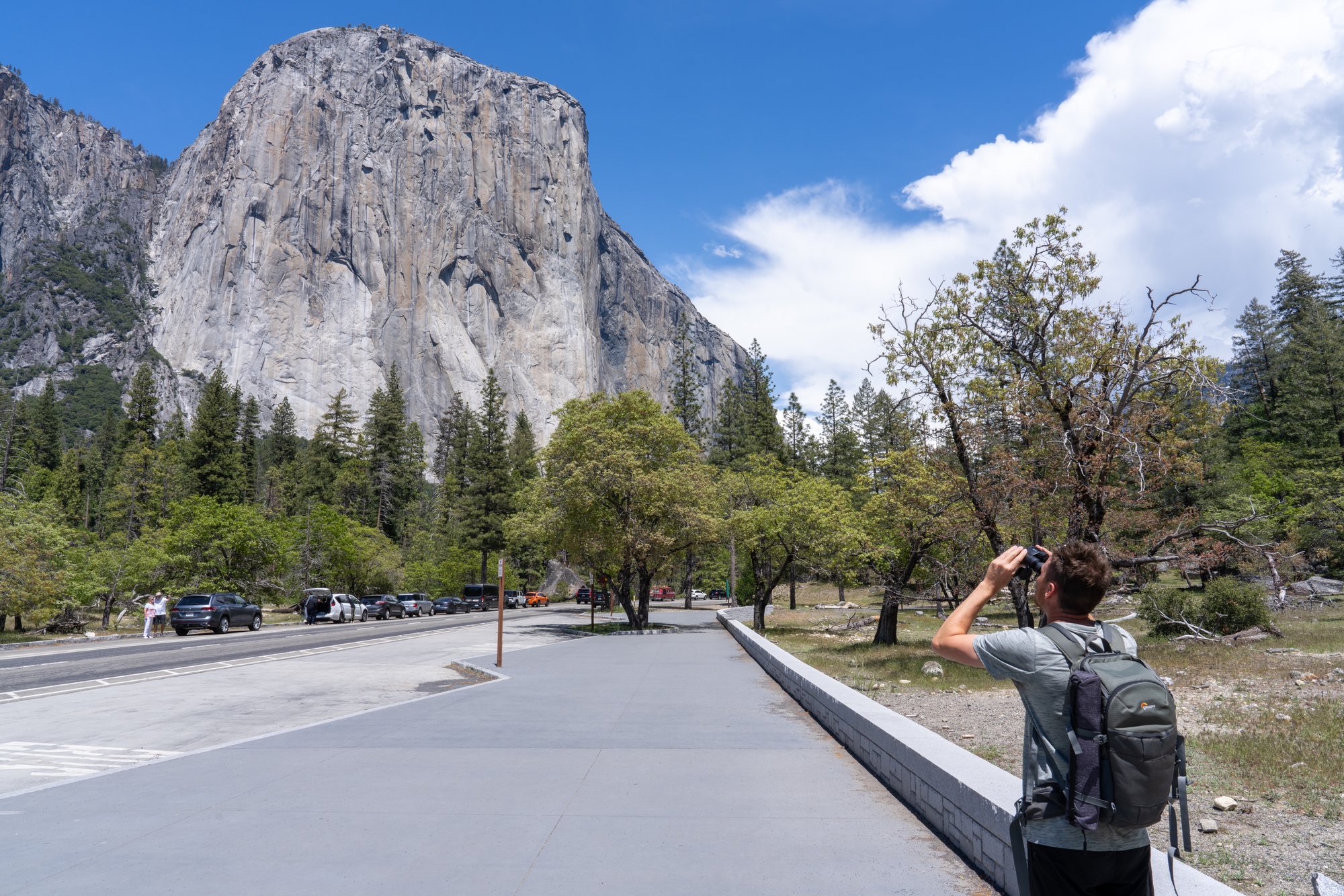 Ondertussen willen we maar wat graag beter zicht krijgen op die joekel van een bergwand genaamd El Capitan. Deze verticale wand van bijna 1 kilometer is een gevreesde, maar ook geliefde plek voor klimmers door de uitdaging die El Capitan biedt. We stoppen bij El Capitan Picnic Area en kunnen vanuit hier El Cap (zijn koosnaampje) tussen de bomen door wel een beetje zien, maar nog niet heel goed. Waarschijnlijk moeten we daarvoor bij de El Capitan Meadows zijn?