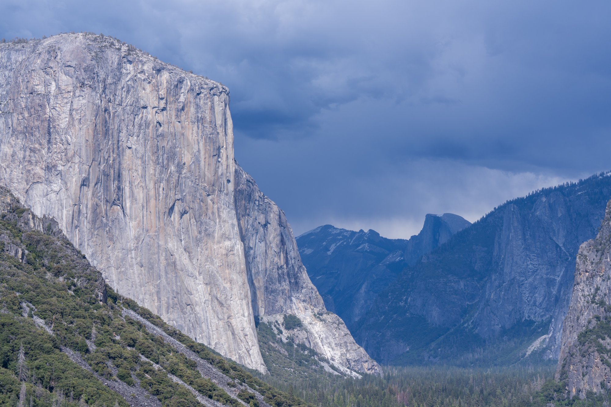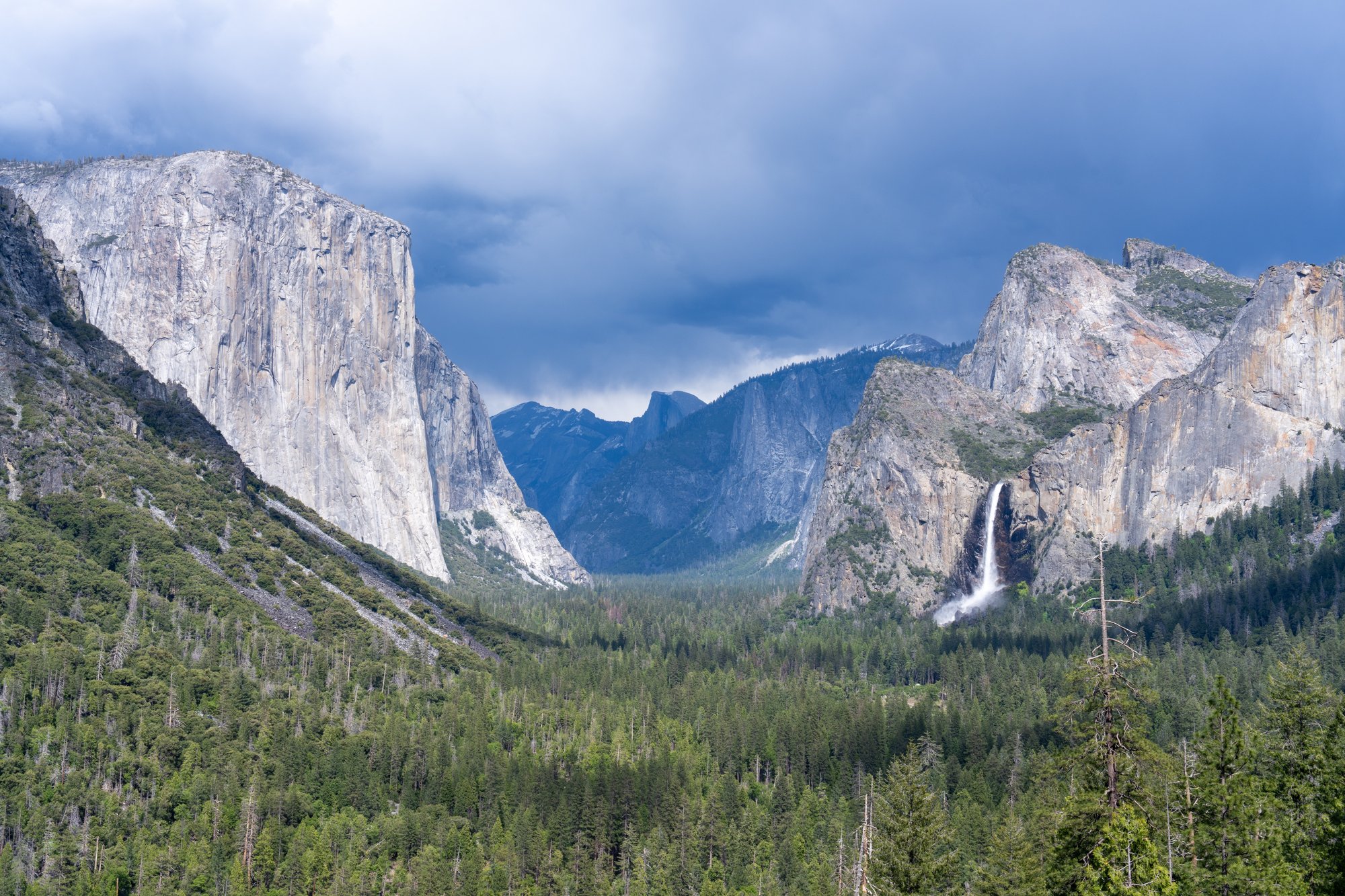 Tip: ga in de middag of avond naar Tunnel View, zodat je niet tegen de zon in kijkt. Als je de zon ziet dan. ;-) Toen wij bij Tunnel View waren, verzamelden donkere onweerswolken zich boven de Yosemite vallei.