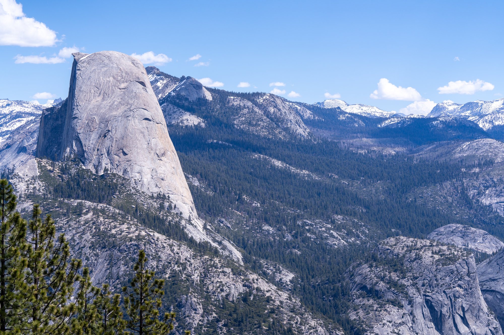 Aan het einde van Glacier Point Road ligt het uitzichtpunt Glacier Point. Dit uitzicht lijkt een beetje op Washburn Point, maar geeft nog een iets breder beeld van Yosemite. Je kunt vanaf Glacier Point namelijk ook de vallei inkijken en het dal beneden zien liggen. Daarnaast heb je mooi zicht op de Yosemite Falls. Het is één van onze favoriete uitzichten in Yosemite en wat zijn we blij dat de weg sinds vandaag open is. Bofferds dat we zijn!