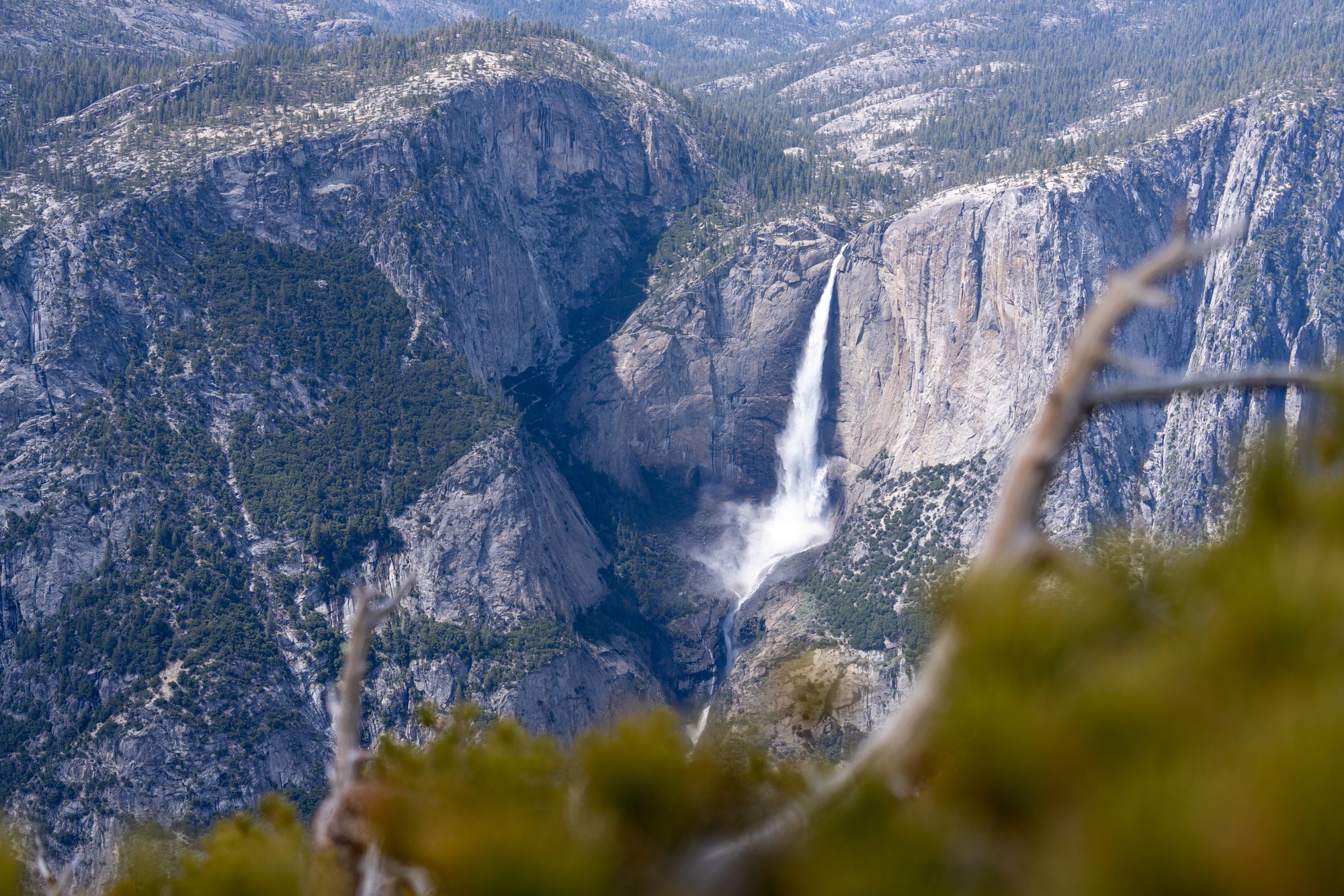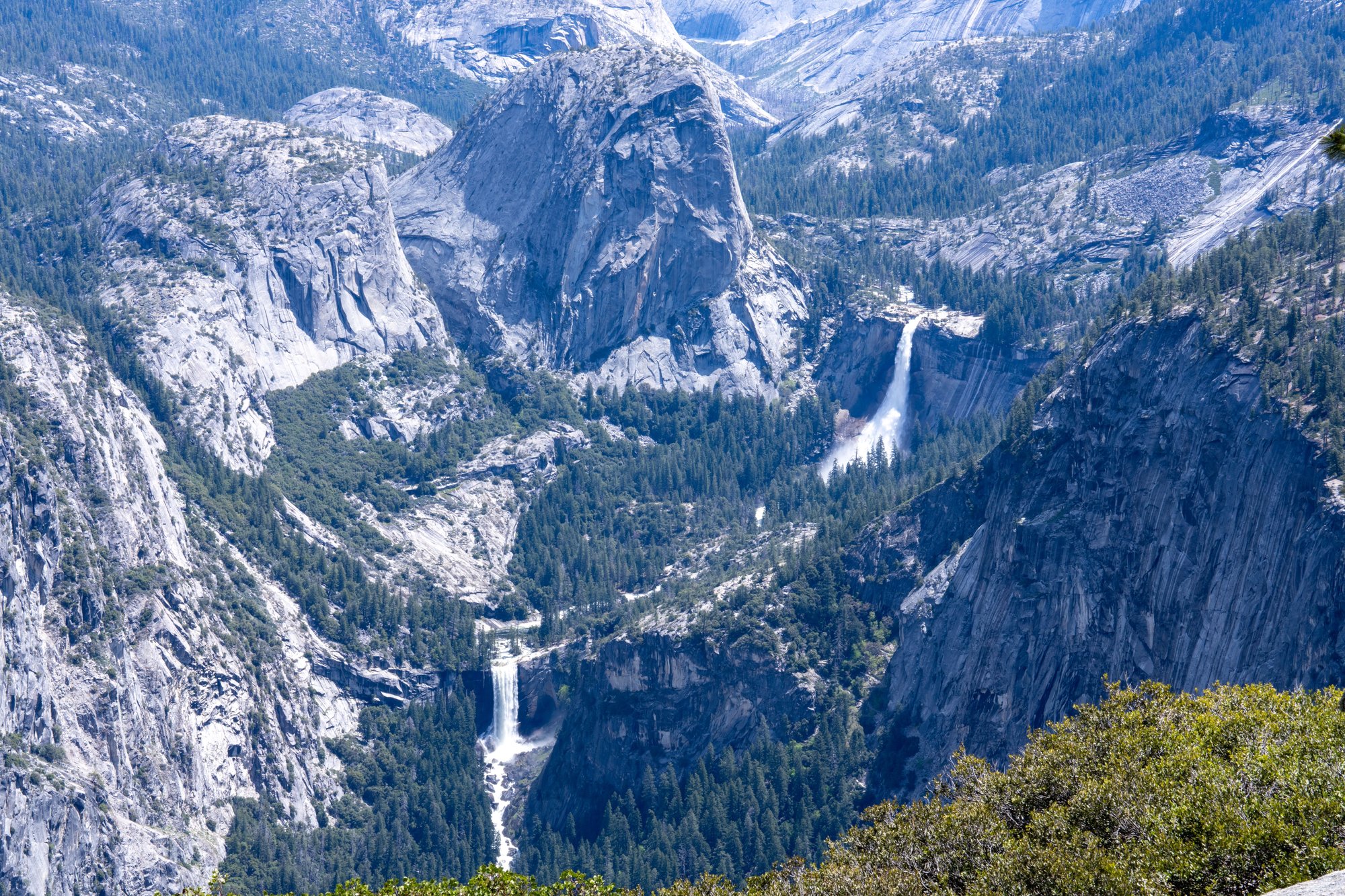 Het eerste uitzichtpunt dat wel pal aan de Glacier Point Road ligt is Washburn Point. Vanaf hier zien we Half Dome en de Vernal Fall en Nevada Fall fantastisch liggen. De watervallen zijn zo krachtig in deze tijd van het jaar. Heel gaaf om te zien!